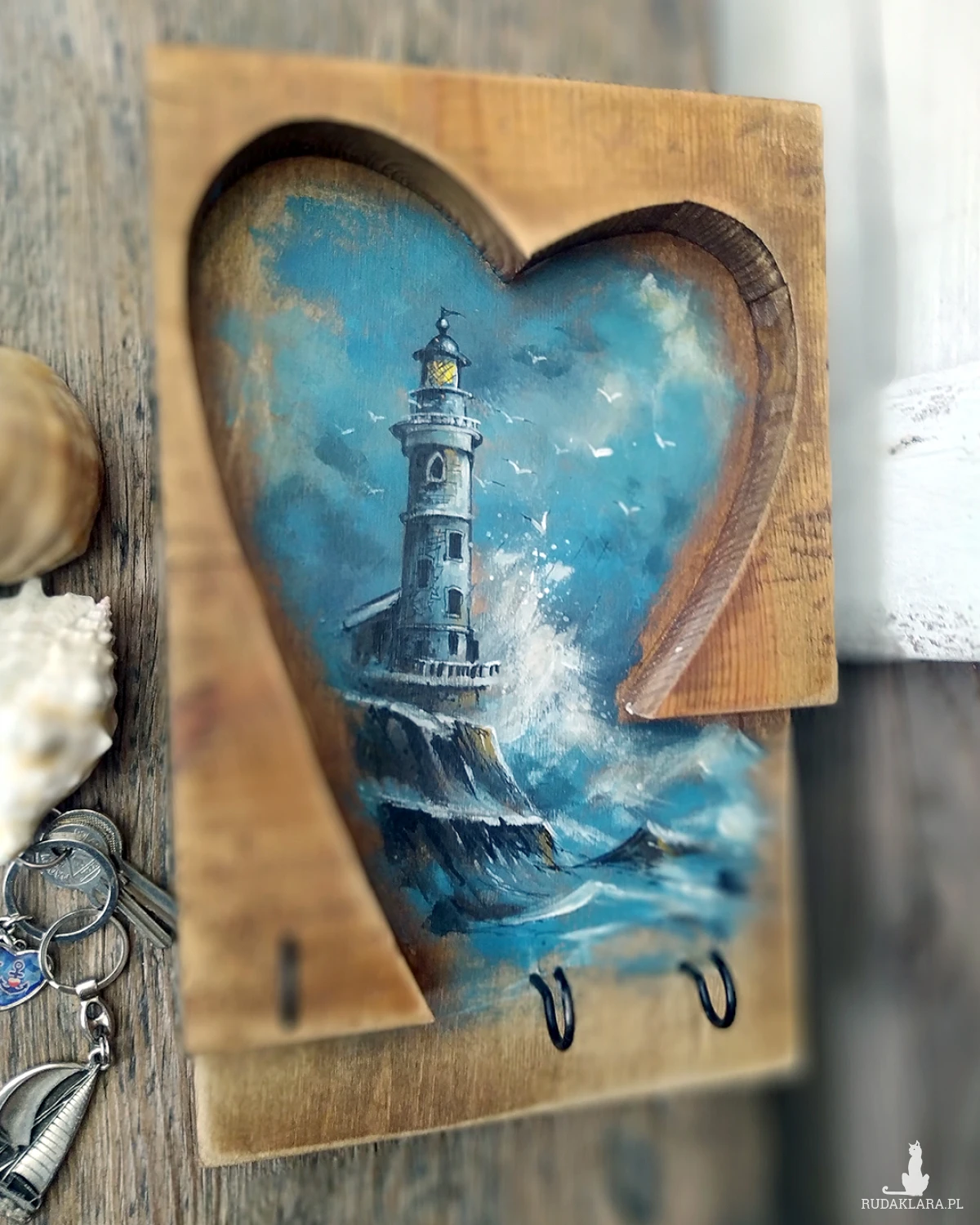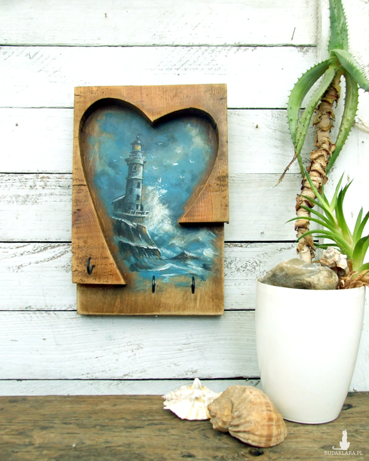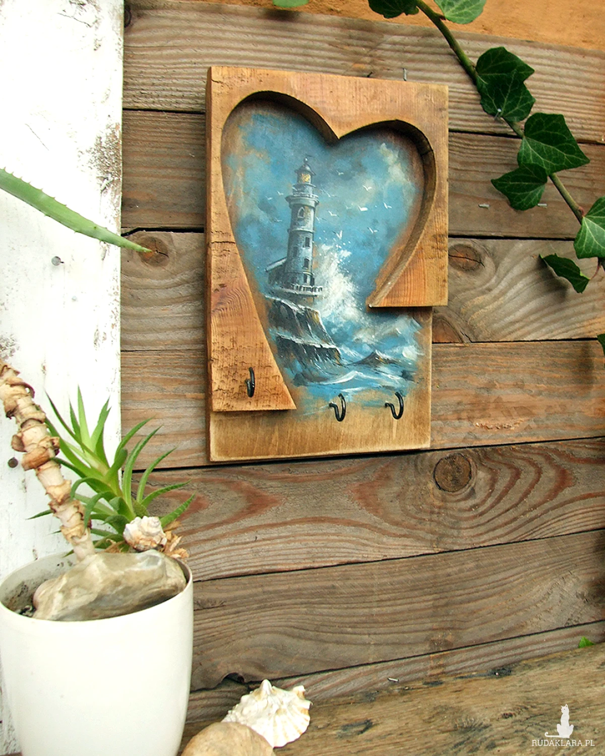Tył wieszaczka to drewniana sklejka, na której namalowany jest pejzaż - Latarnia Morska na skale, o którą rozbijają się wzburzone fale. Dodatkowa deska z wyciętym wewnątrz sercem, zamyka jakby ramką tę morską scenę.