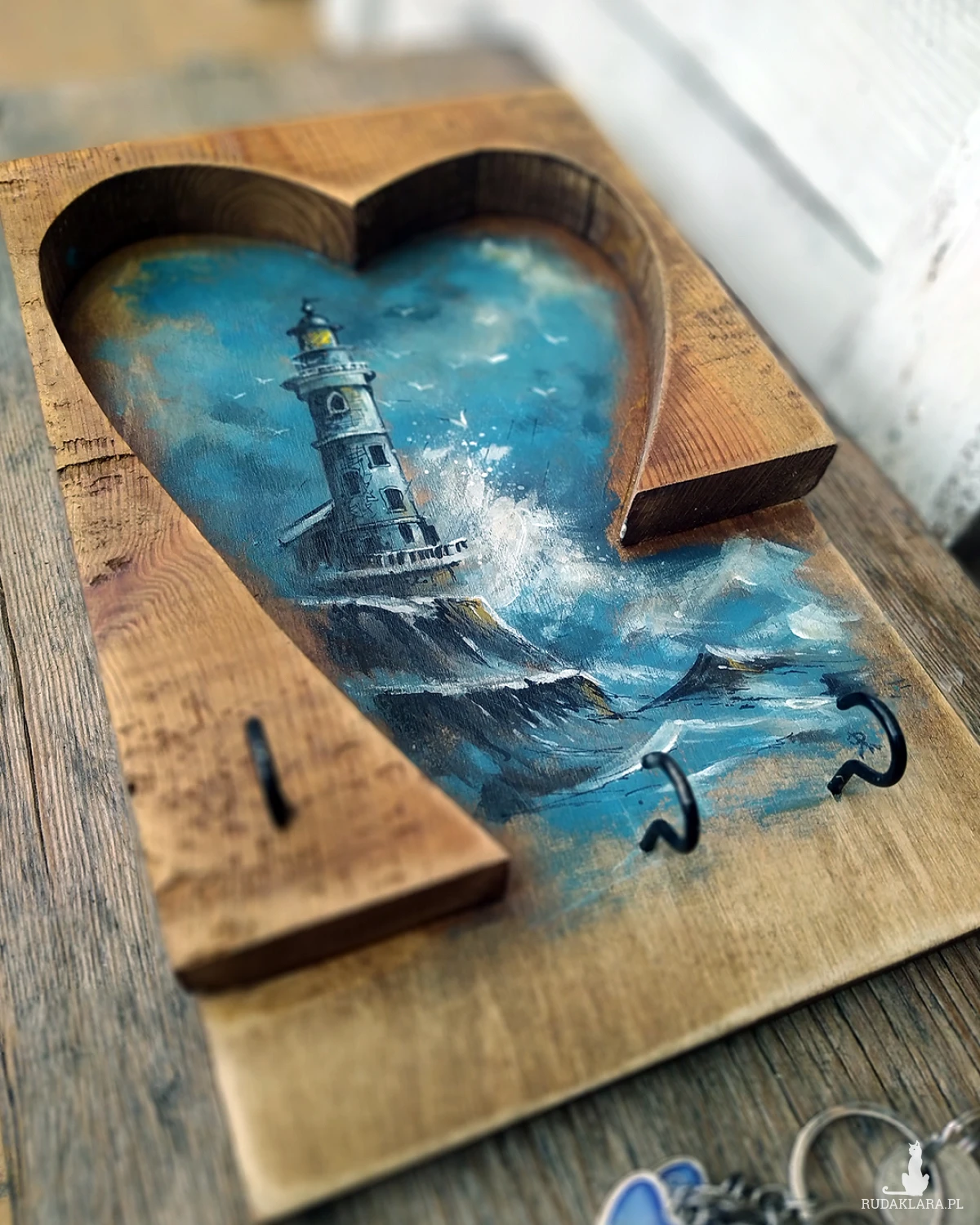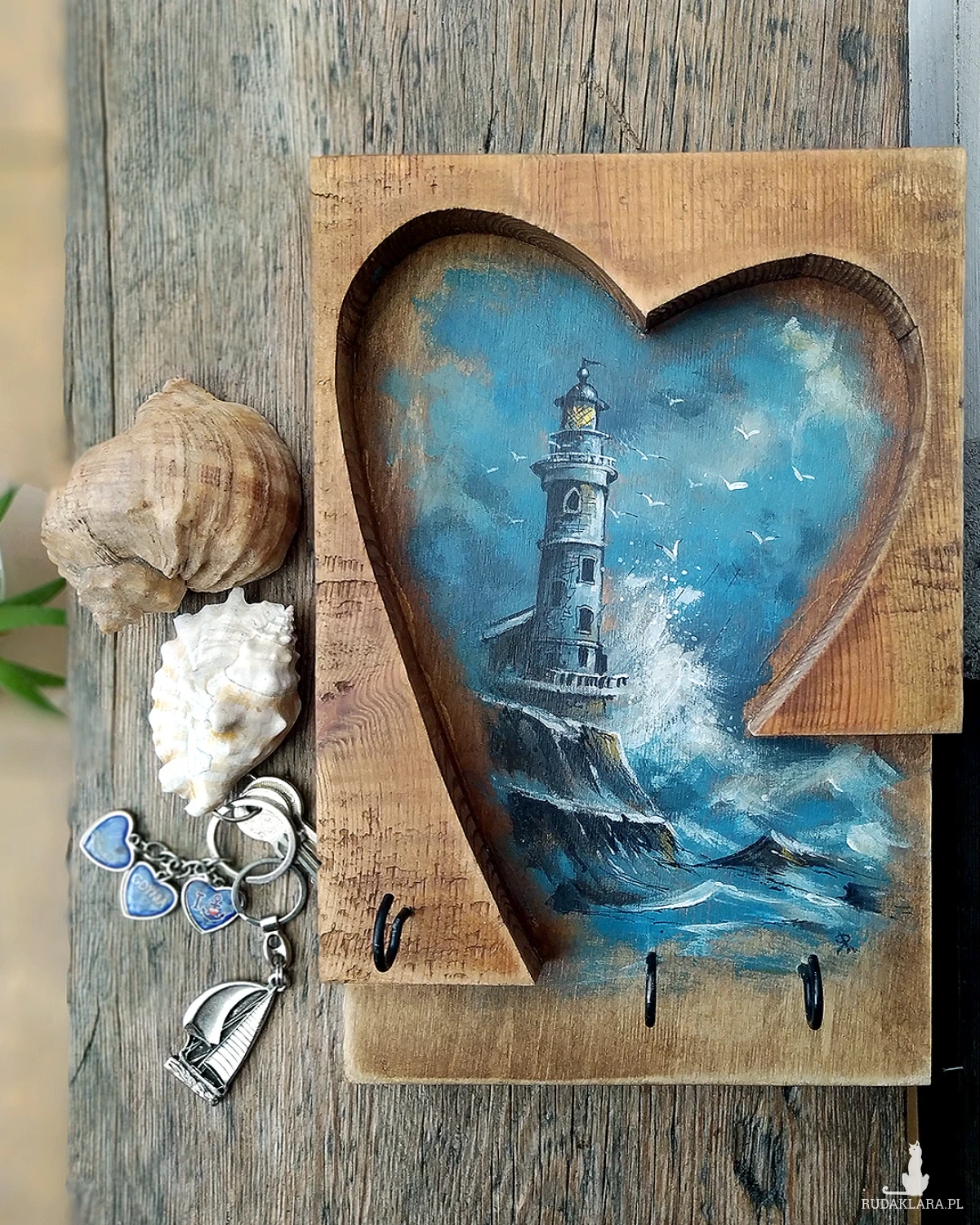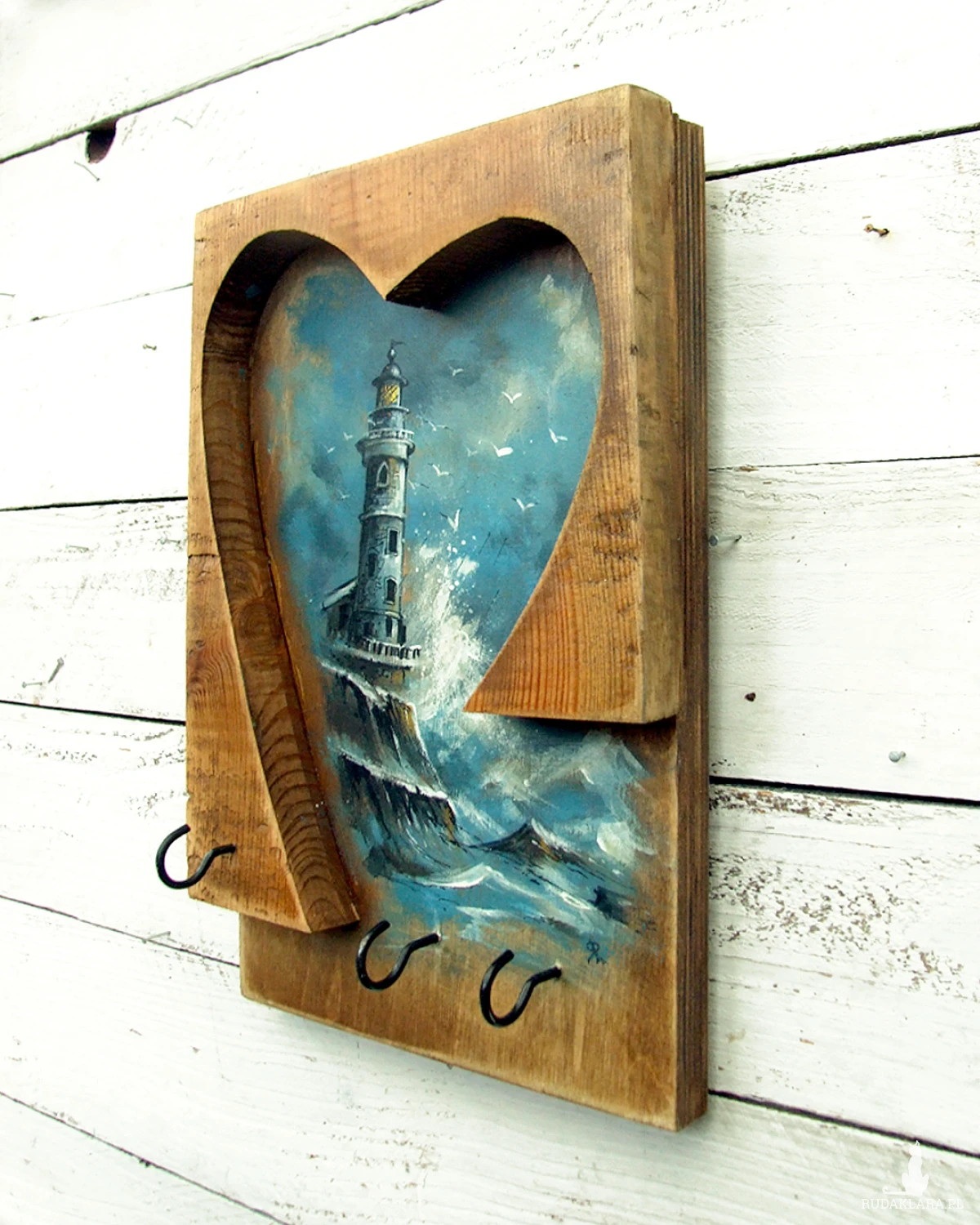 Tył wieszaczka to drewniana sklejka, na której namalowany jest pejzaż - Latarnia Morska na skale, o którą rozbijają się wzburzone fale. Dodatkowa deska z wyciętym wewnątrz sercem, zamyka jakby ramką tę morską scenę.