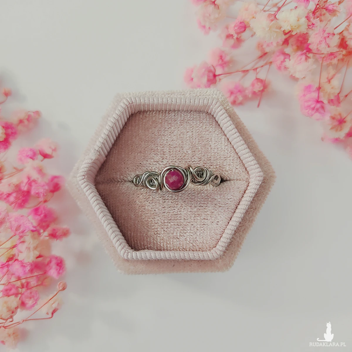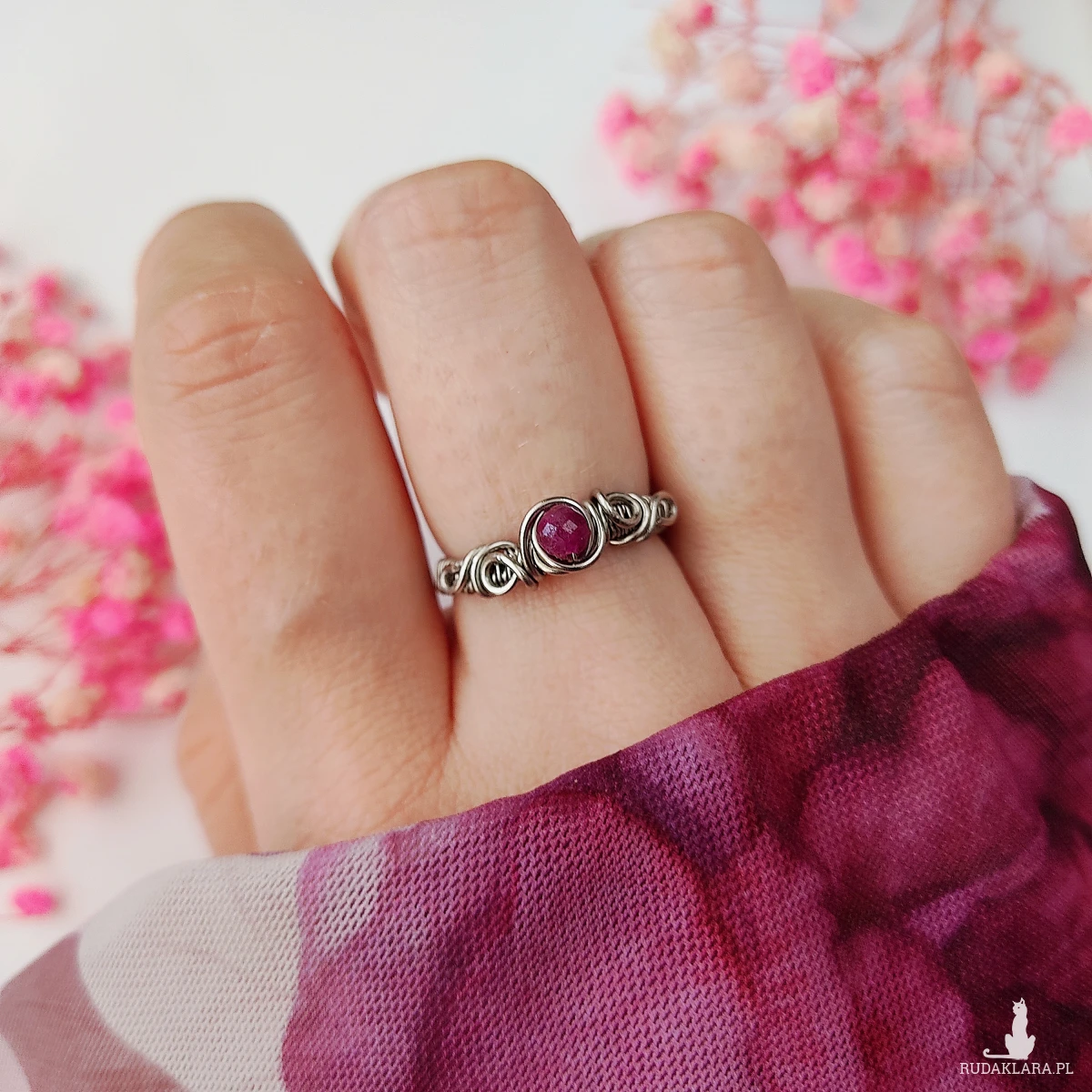 Pierścionek z rubinem wykonany metodą wire wrapping to wyjątkowy dodatek dla osób ceniących ręcznie robioną biżuterię oraz kamienie naturalne. Stal chirurgiczna, która została użyta do stworzenia tej ozdoby, zapewnia trwałość, odporność na korozję i hipoalergiczne właściwości. Dzięki temu pierścionek może być noszony na co dzień bez ryzyka podrażnień. Rubin, będący jednym z najbardziej cenionych kamieni szlachetnych, symbolizuje pasję, miłość oraz energię życiową. Jego głęboka, czerwono-karminowa barwa sprawia, że biżuteria nabiera niepowtarzalnego charakteru.