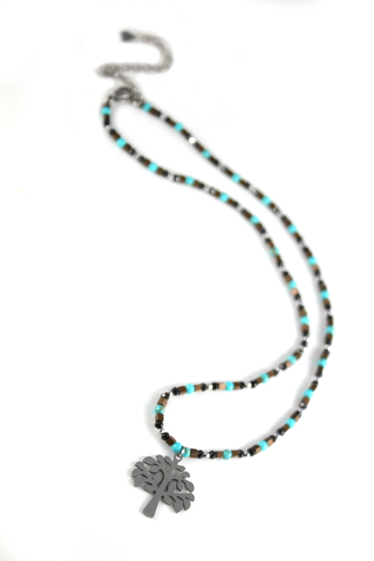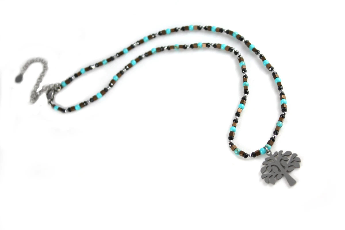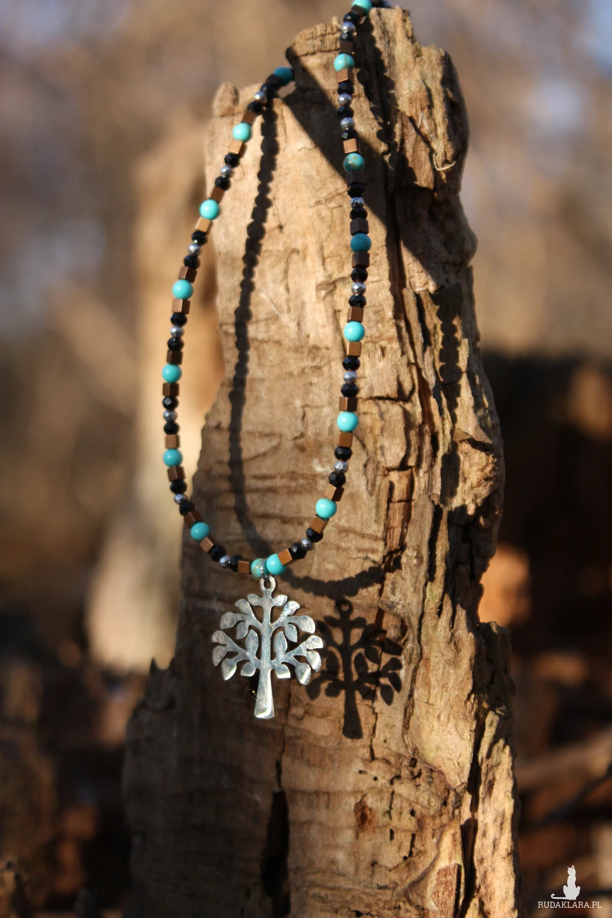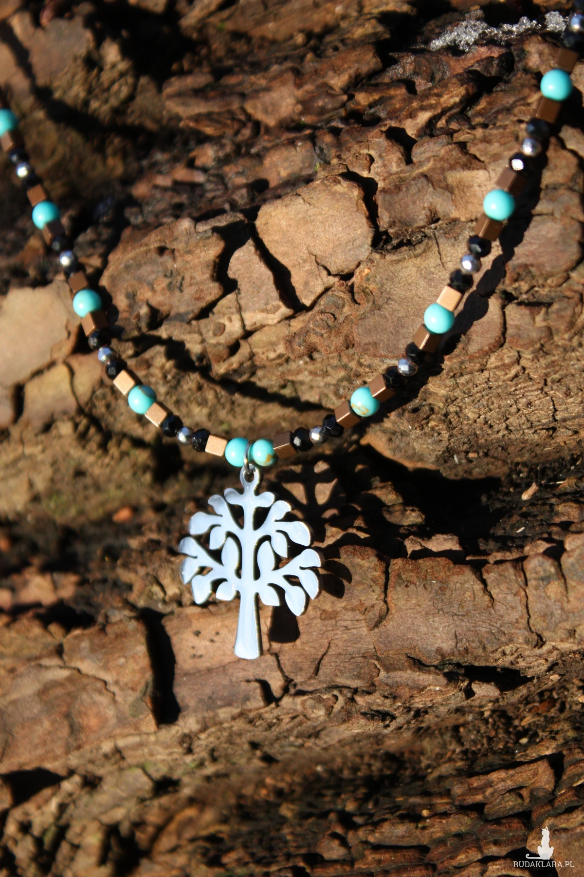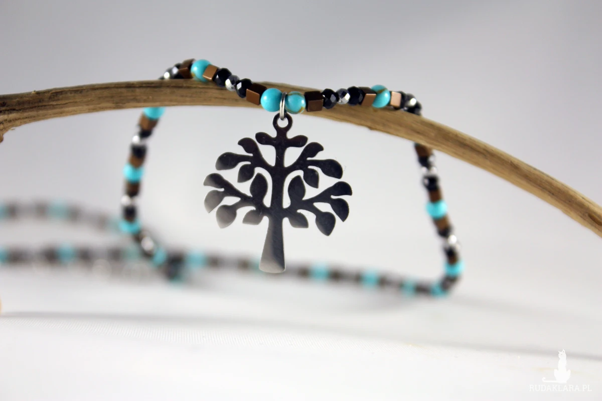 Naszyjnik drzewem wykonany z naturalnych kamieni. Posiada regulowane zapięcie, pozwalając dostosować długość od 41 cm do 50,5 cm, co zapewnia idealne dopasowanie. Na linkę nawleczone zostały fasetowane kamienie agatu, gładkie magnetyty o średnicy 3 mm i kwadratowe hematyty które tworzą harmonię z delikatnymi srebrnymi kuleczkami. Na centralnym punkcie naszyjnika znajduje się zawieszka w kształcie drzewa o wymiarach 2,3 cm/ 2,5 cm. Zapięcie wykonano ze szlachetnej stali chirurgicznej.