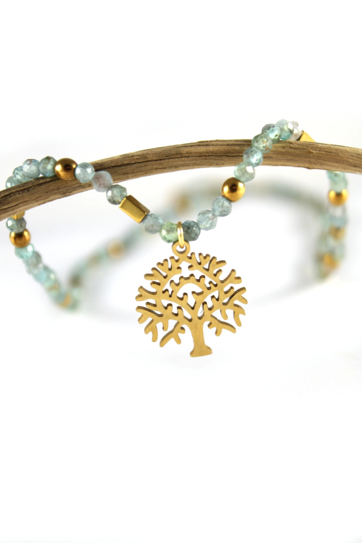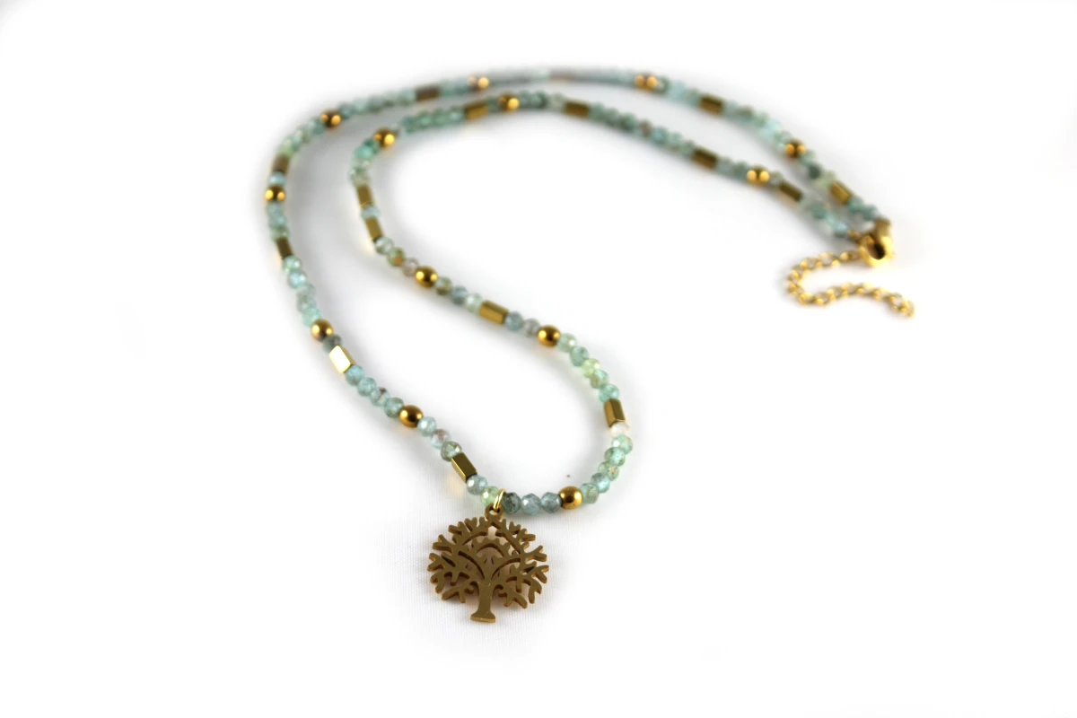 Błękitny naszyjnik z drzewem wykonany z fasetowanych kainitów o średnicy 3 cm. Naszyjnik o długości 40 cm posiada regulowane zapięcie pozwalające uzyskać długość 45 cm. Na lince, obok kamieni, umieściłam elementy w kolorze złota o w kształcie gładkich kulek i prostopadłościanów. Pozłacane elementy wykonane ze szlachetnej stali chirurgicznej oraz złotych hematytów.