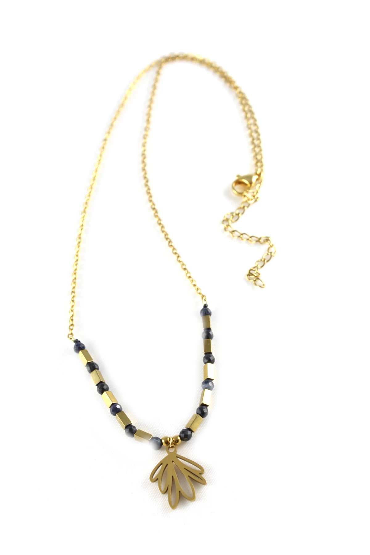 Subtelny naszyjnik z łańcuszkiem ze stali chirurgicznej w kolorze złota. W centralnej części znajduje się element dekoracyjny wykonany z sześciennych złotych hematytów oraz fasetowanych szafirów o wielkości 0,3 cm wraz ze złotą zawieszką z motywem roślinnym przypominającym kwiat. Długość minimalna naszyjnika 44 cm, długość maksymalna 49,5 cm.