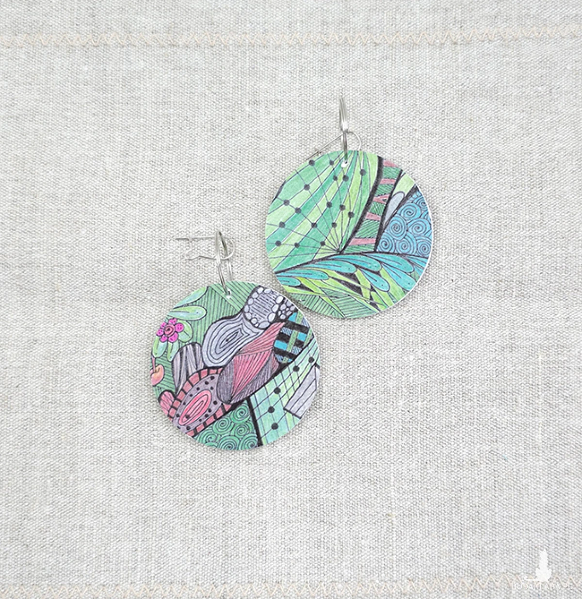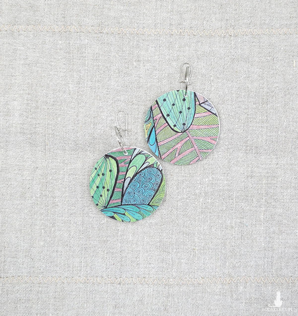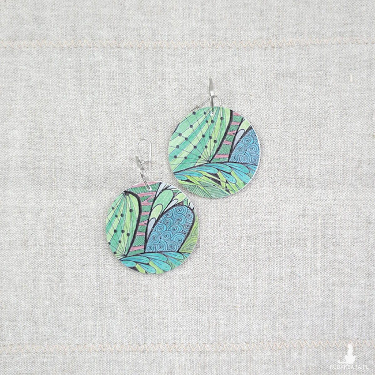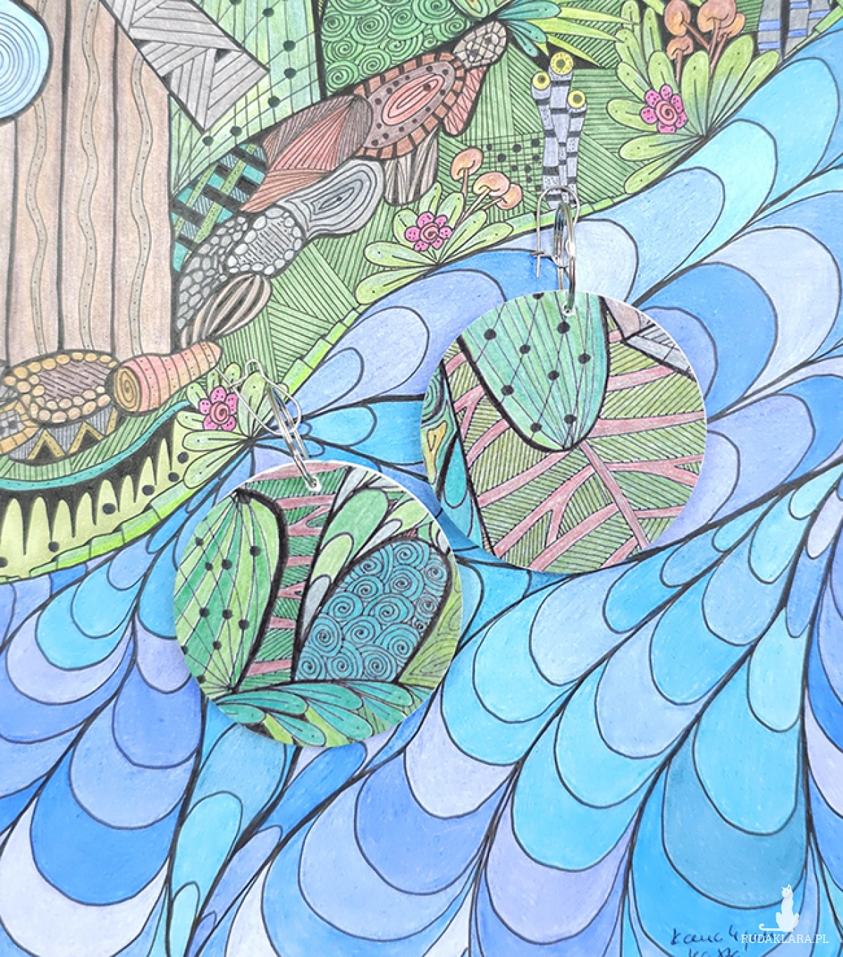 Kolczyki wykonane z drewnianej bazy oraz części mojego autorskiego rysunku "Wiatrak".