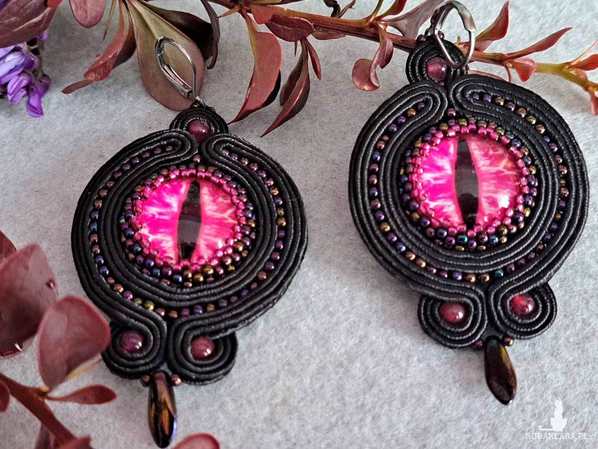 Kolczyki wykonane są techniką haftu sutasz, który polega na zszywaniu ze sobą sznurków sutasz i wszywaniu między sznurki drobnych koralików, minerałów oraz ceramiki. Sercem kolczyków jest kaboszon z grafiką przedstawiającą różowe oko. Kaboszon opleciony jest czarnym sznurkiem sutasz oraz ozdobiony japońskimi koralikami toho oraz różowymi kulkami agatu. Z tyłu koczyki są ręcznie podszyte skórą naturalną. Kolczyki zawieszone są na biglach angielskich ze stali chirurgicznej. Zapakowane w ozdobne pudełeczko.
