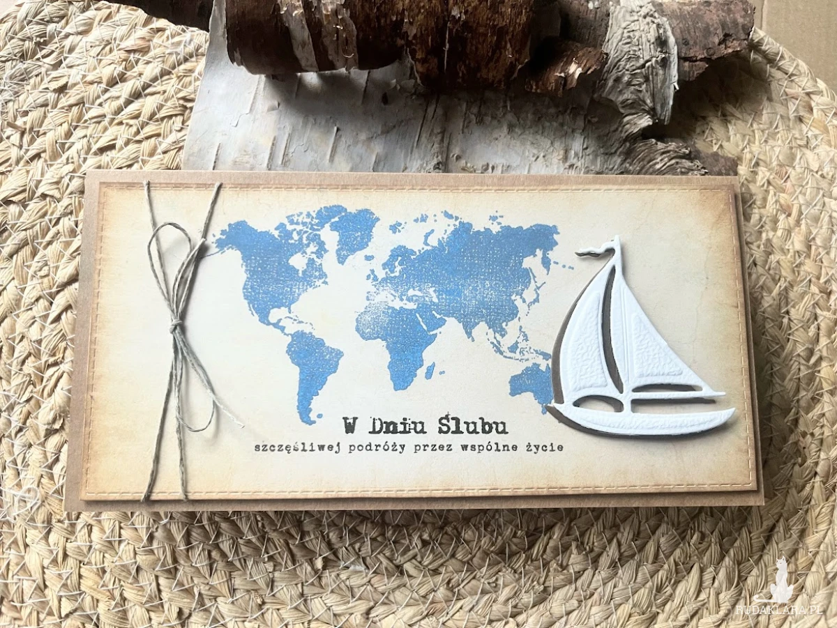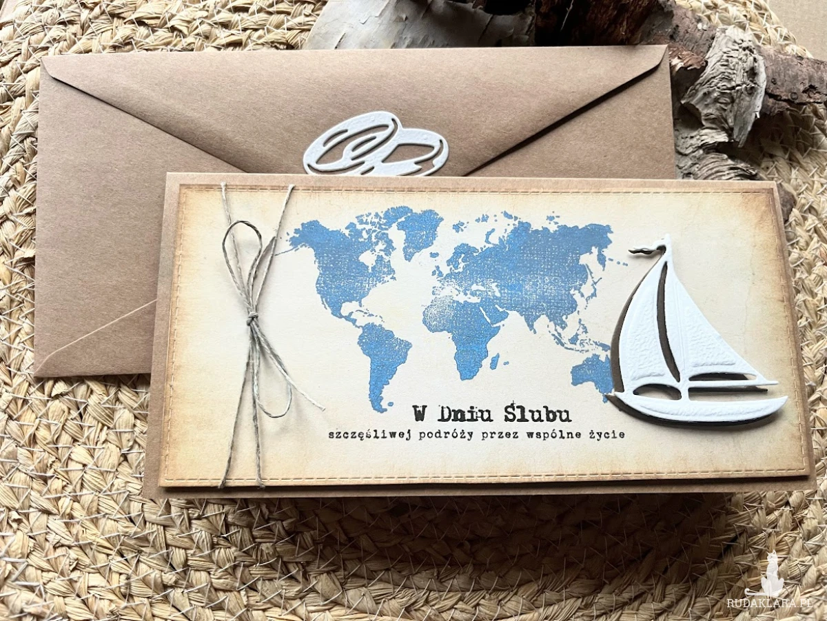 Kartka z okazji Ślubu do koperty dla Młodej Pary , która kocha podróże i wybiera się w szczęśliwą podróż przez wspólne życie z urokliwą żaglówką. Komplet stworzony na bazie papieru kraftowego nadając kompletowi klimat eco. Kartka ma wymiary 21 x 10 , koperta ma wymiary 22 x 11. Całość obwiązana sznurkiem z tagiem - biletem .W środku kartki znajduje się gotowe życzenia do własnoręcznego podpisu oraz umieszczono kieszonkę na małe co nieco lub kupon lotto W tej postaci produkt dostępny od ręki .
