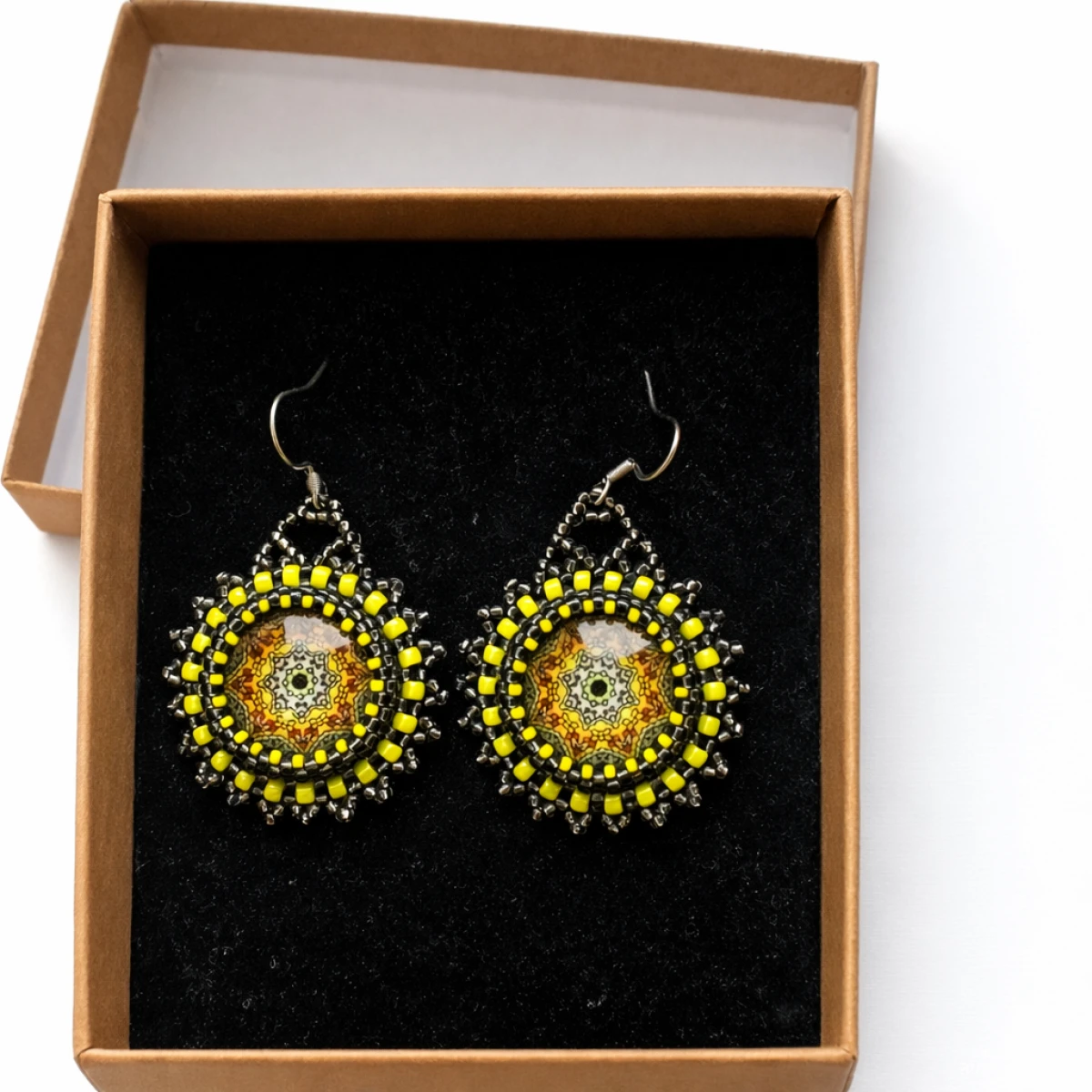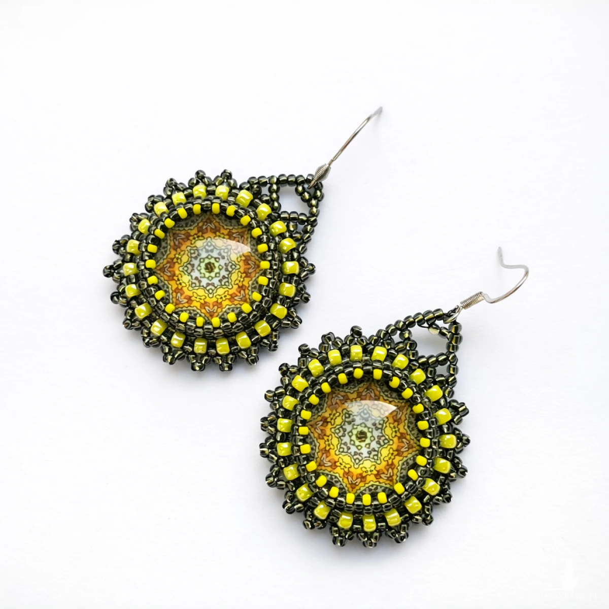 Kolczyki zostały stworzone metodą haftu koralikowego z wykorzystaniem wysokiej jakości koralików w odcieniach złota i hematytu. Centralny kaboszon z motywem mandali nadaje kompozycji głębi i artystycznego wyrazu. To ręcznie robiona biżuteria, która łączy precyzję z unikalnym designem.