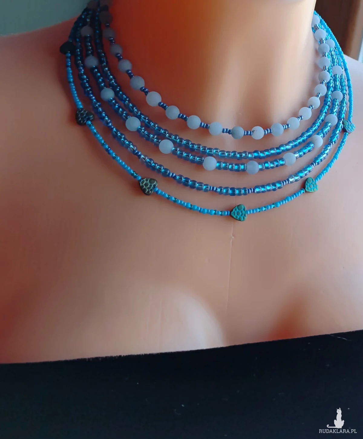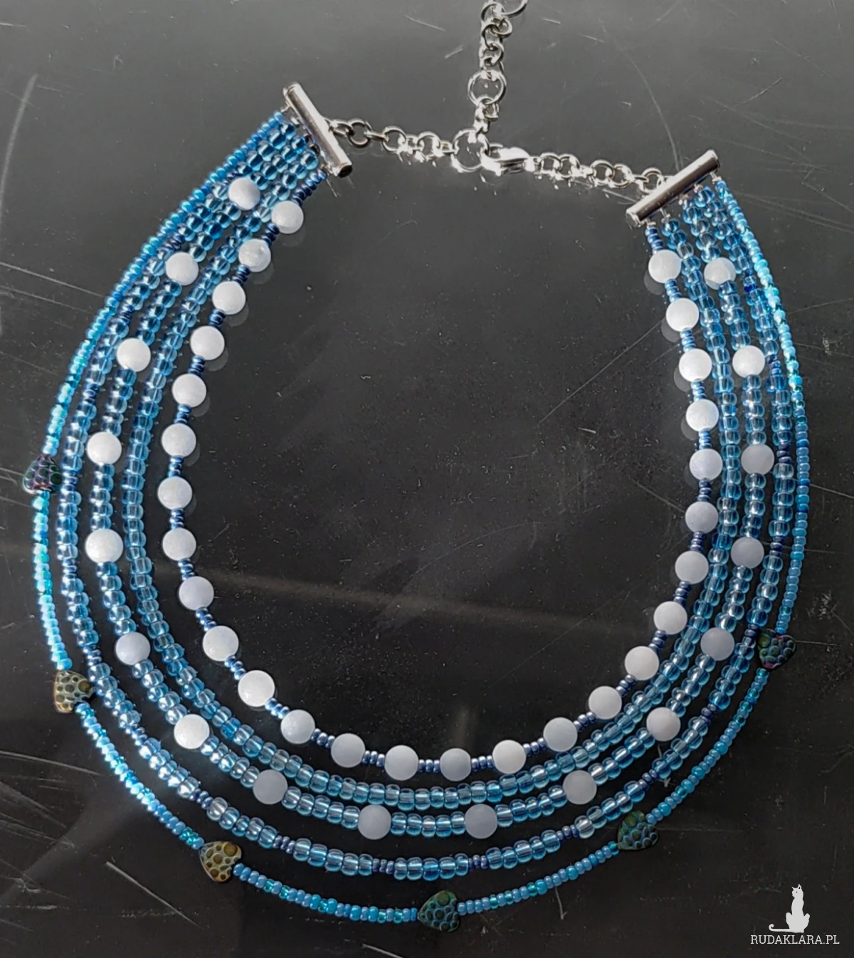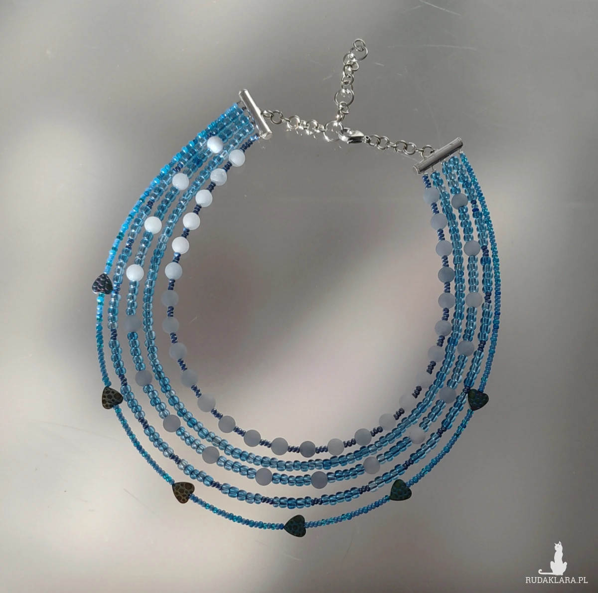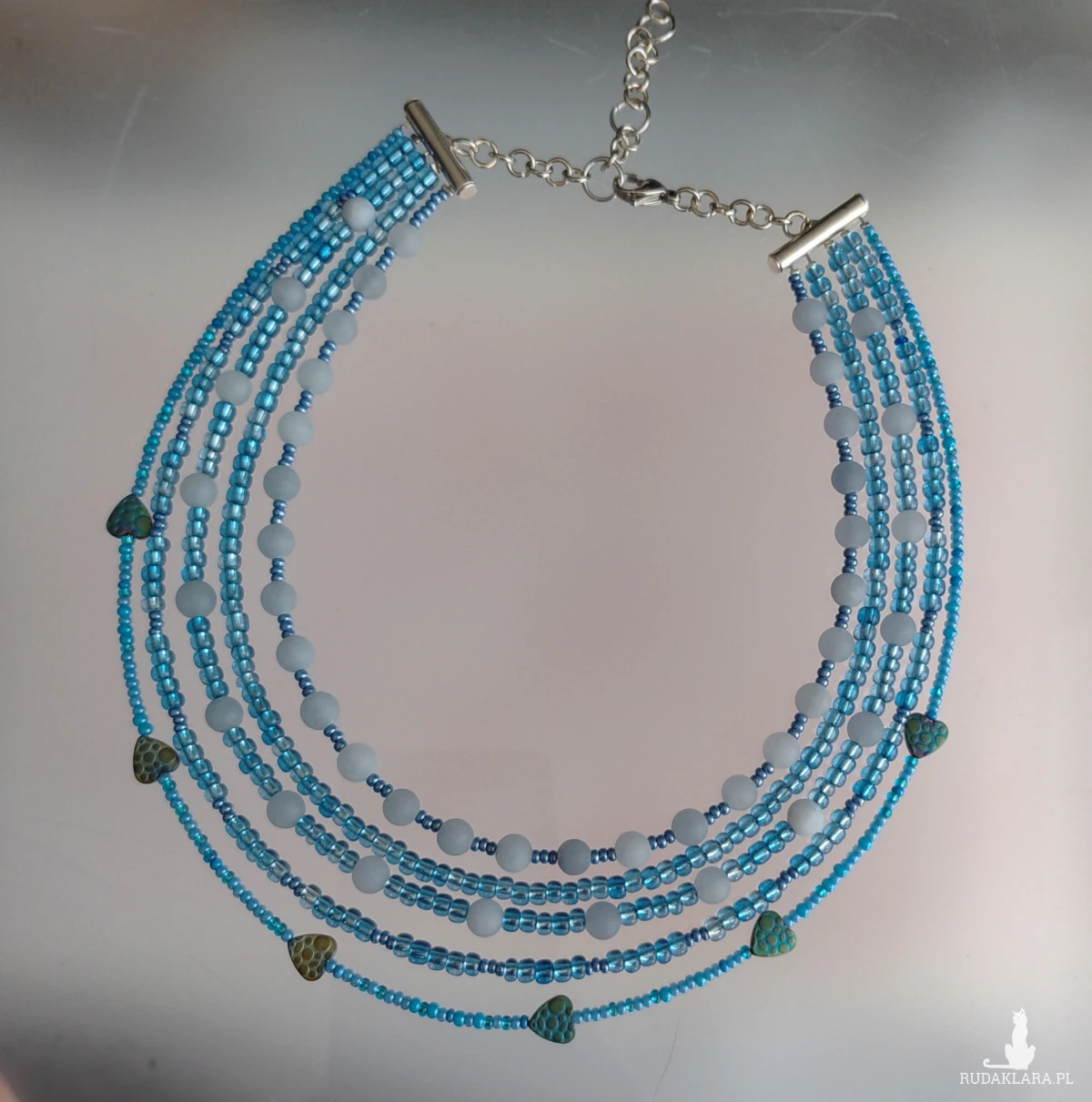 Naszyjnik krótki, niebieski z kulek matowych jadeitu 6 mm maleńkich okragłych czeskich koralików metalizowanych, błękitnych 3 mm i serduszek hematytu petrol. Naszyjnik jest krótki 35-41 cm w obwodzie. Szkło,hematyt,jadeit,metal i stal nierdzewna