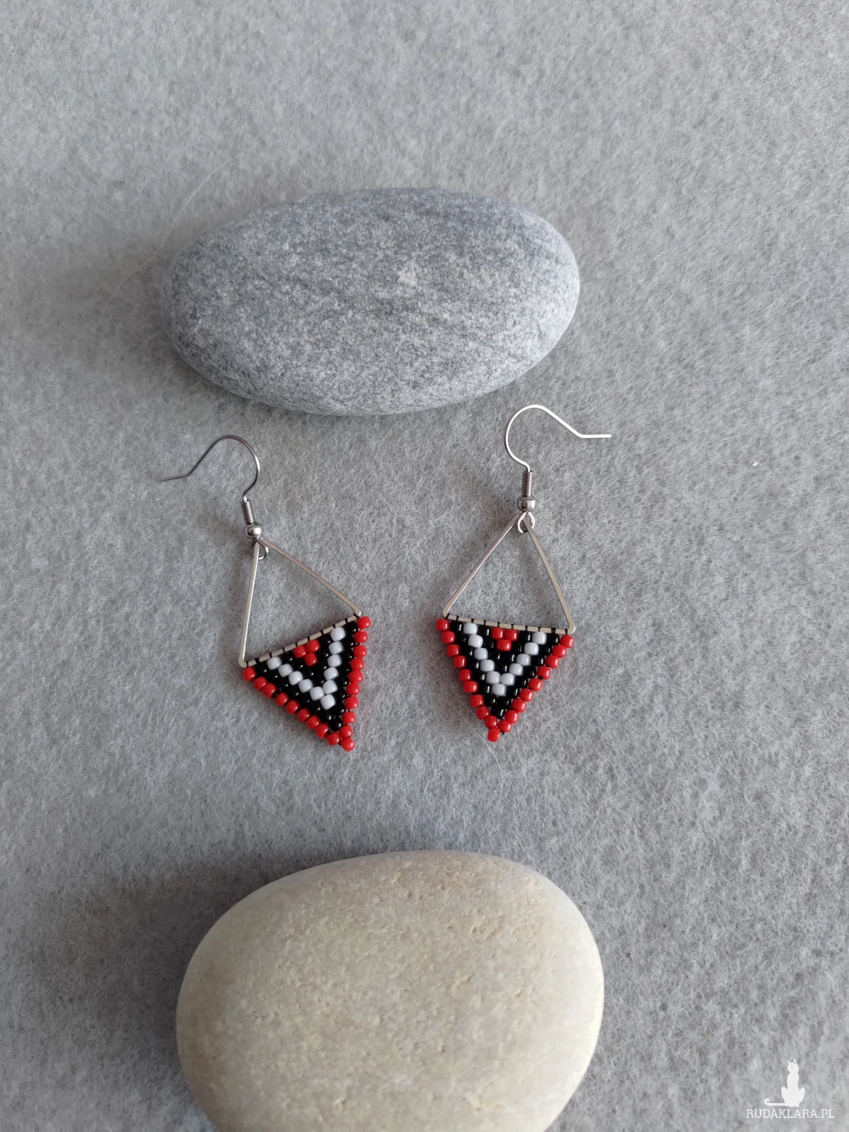 Kolczyki wykonane są z japońskich koralików toho techniką beadingu na trójkątnej bazie. Koraliki są w kolorze czarnym, białym i czerwonym. Kolczyki zawieszone są na otwartych biglach ze stali chirurgicznej.