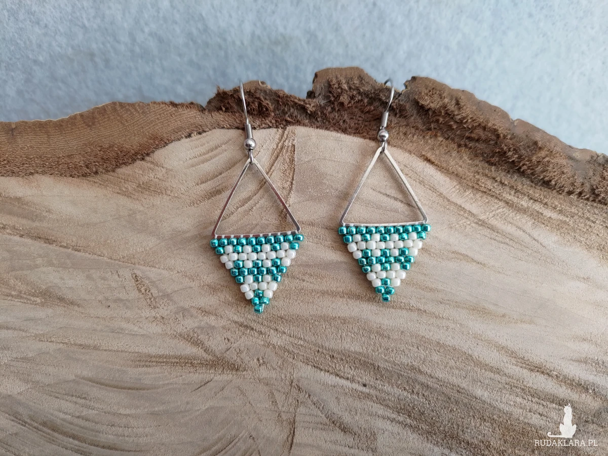 Kolczyki wykonane są z japońskich koralików toho techniką beadingu na trójkątnej bazie. Koraliki są w kolorze niebieskim i białym. Kolczyki zawieszone są na otwartych biglach ze stali chirurgicznej.