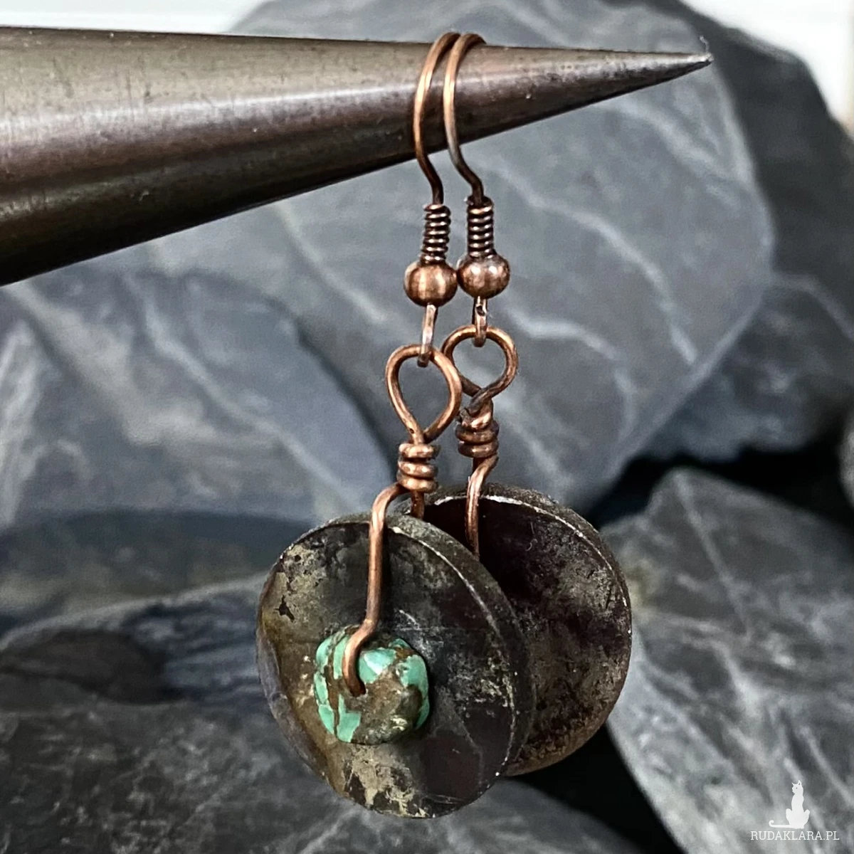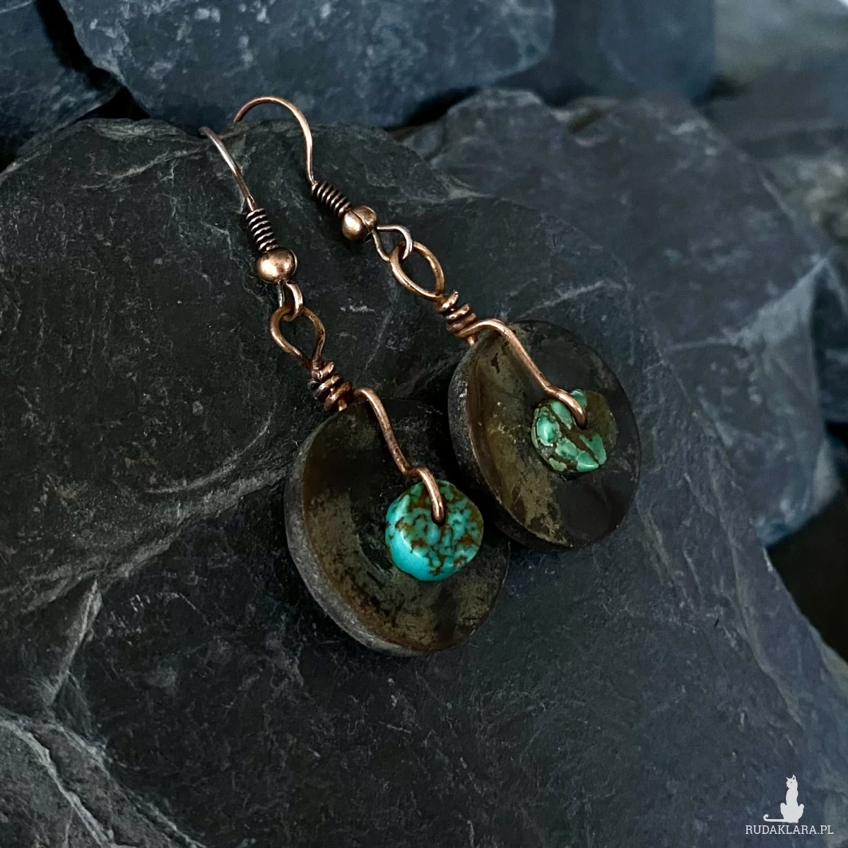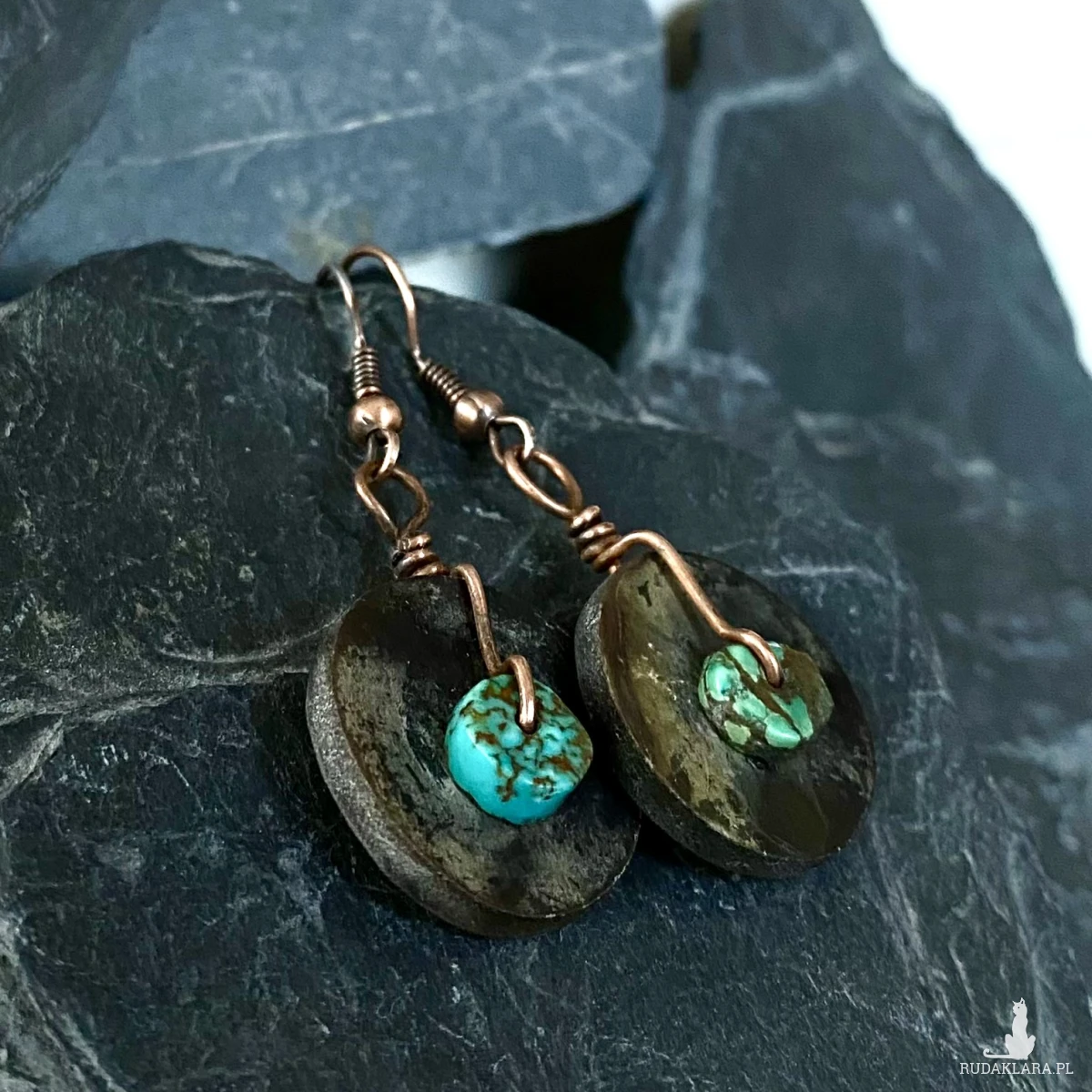Kolczyki wykonane z muszli szarej i turkusu na elementach miedzianych.