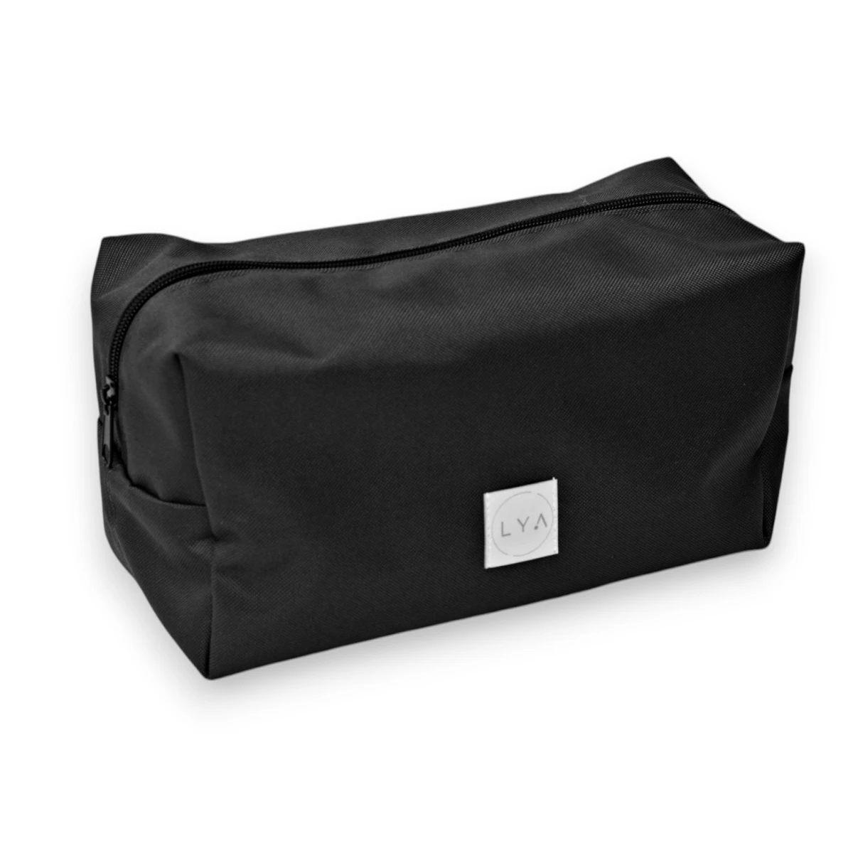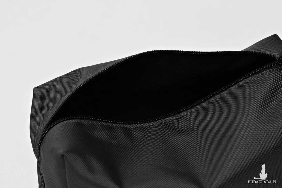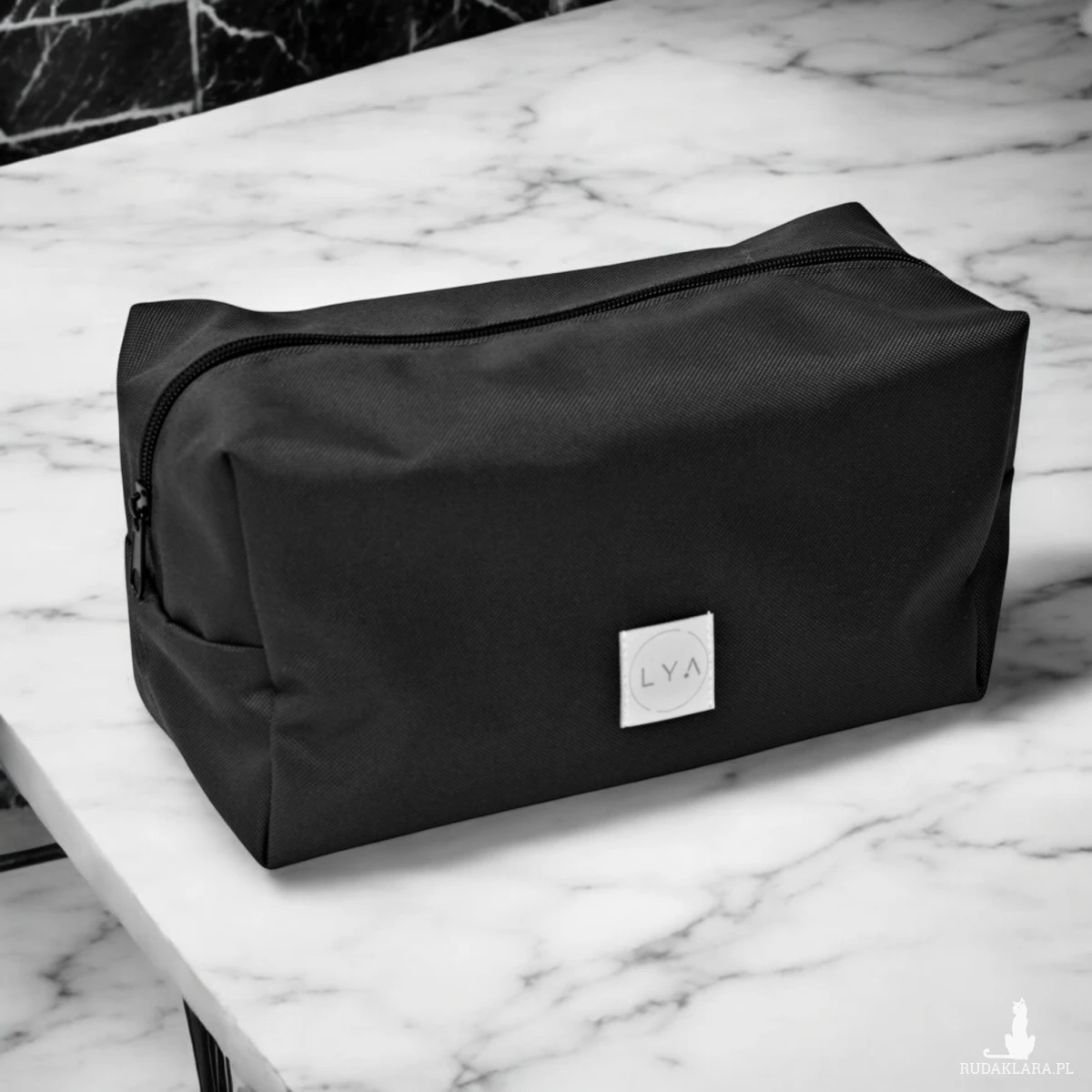 Kosmetyczka uszyta z wodoodpornej tkaniny i wodoodpornej podszewki w kolorze czarnym.