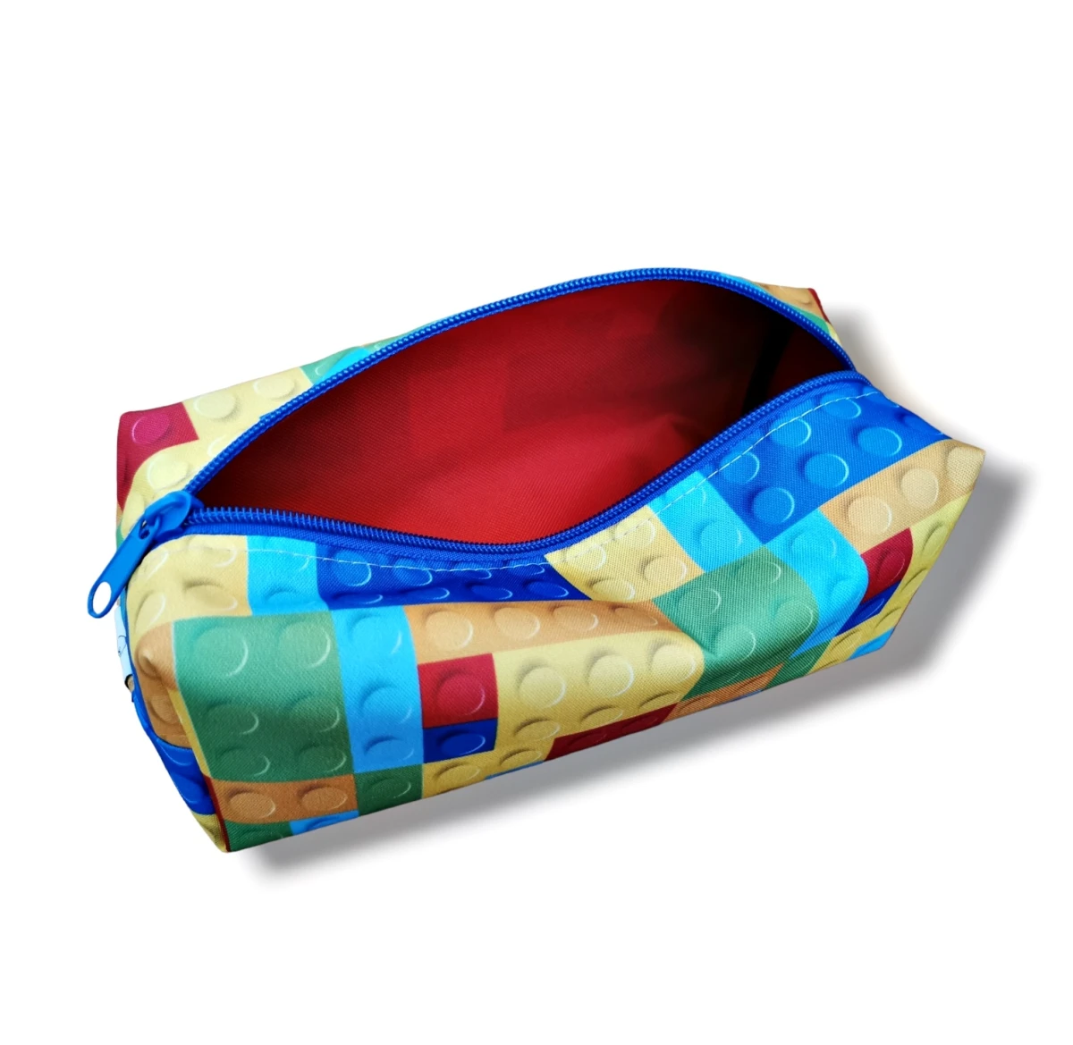 Piórniczek, kosmetyczka uszyta z wodoodpornego materiału z wzorem klocki lego i wodoodporną czerwoną podszewką.