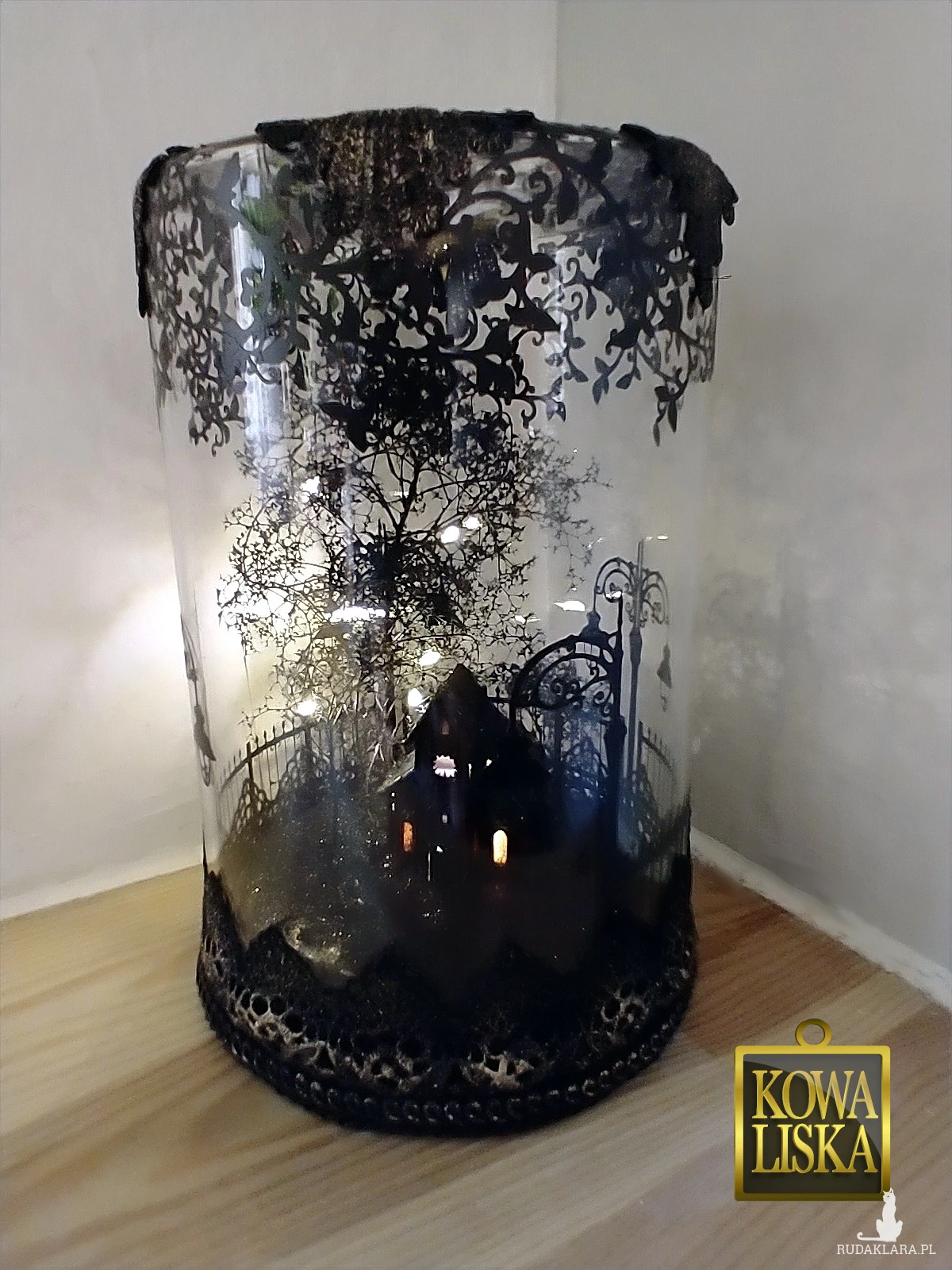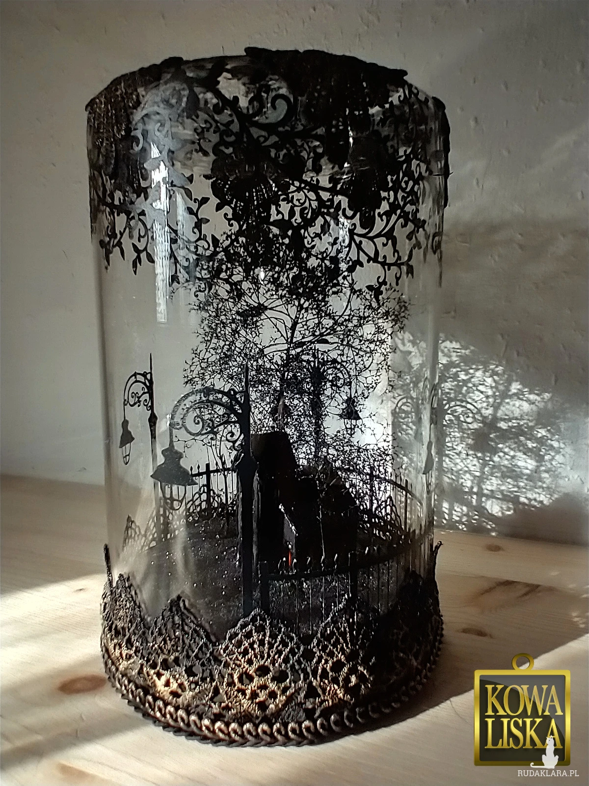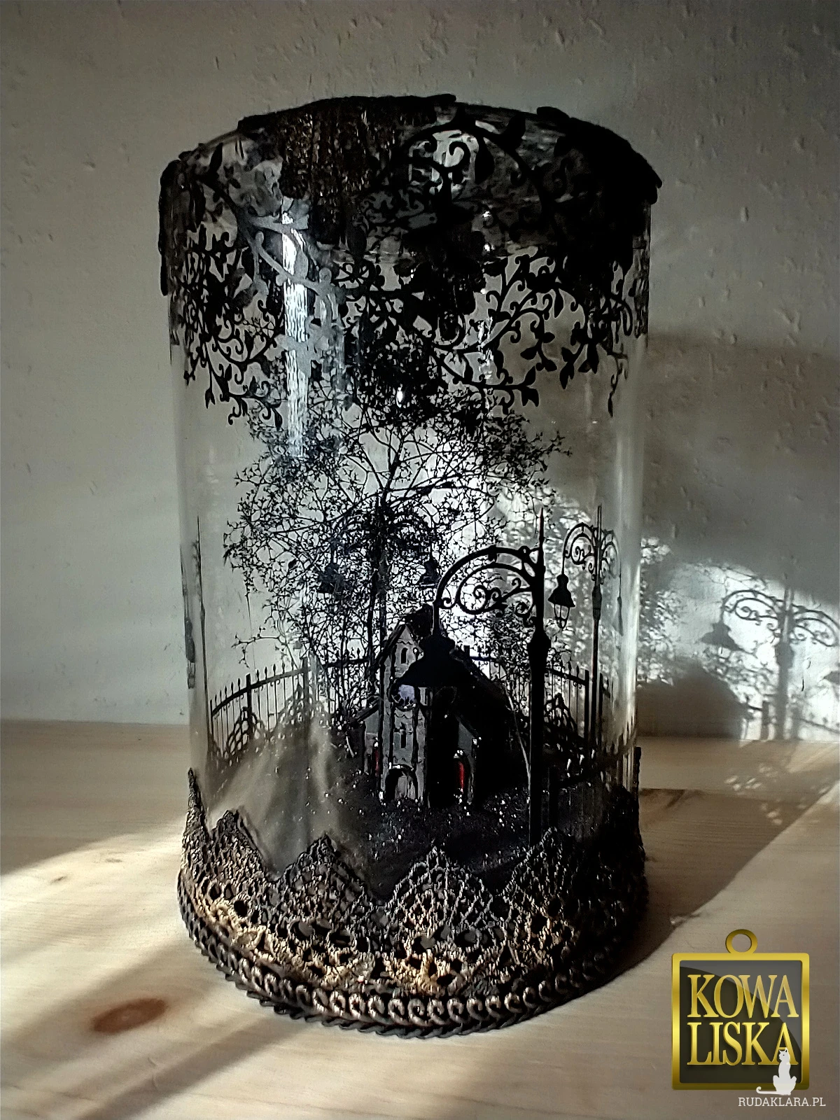 Ręcznie zdobiony, mroczny lampion ze szkła.