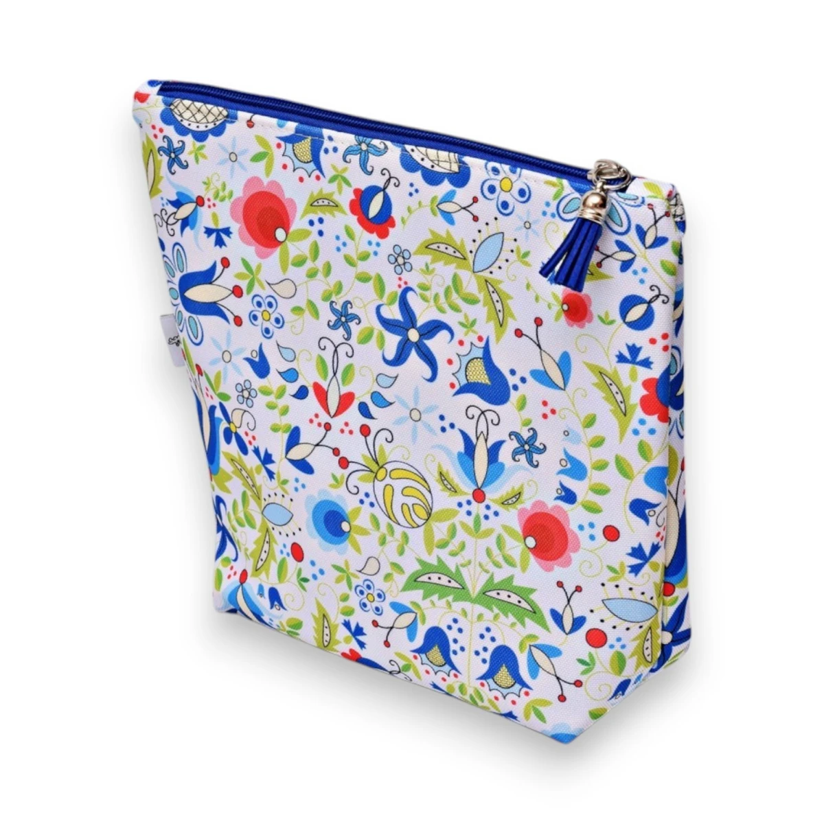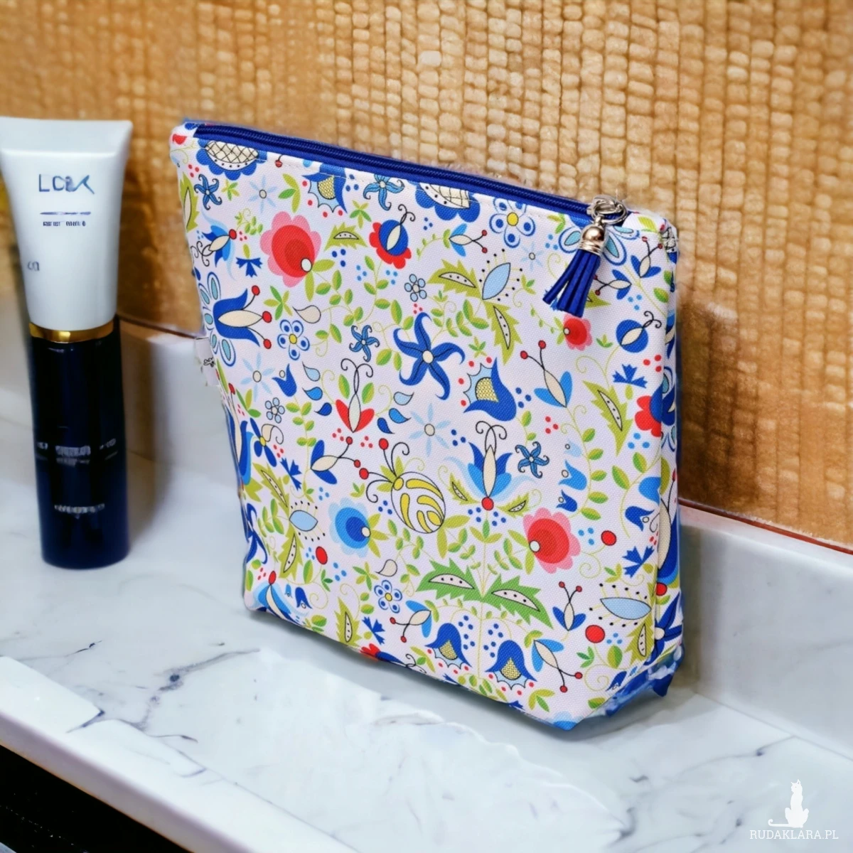Bardzo kobieca kosmetyczka uszyta z wodoodpornej tkaniny. W środku podszewka