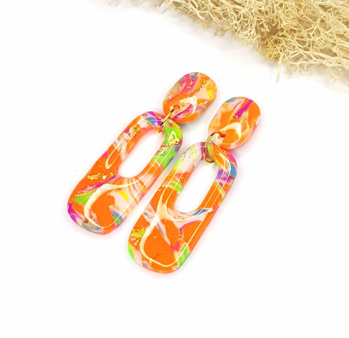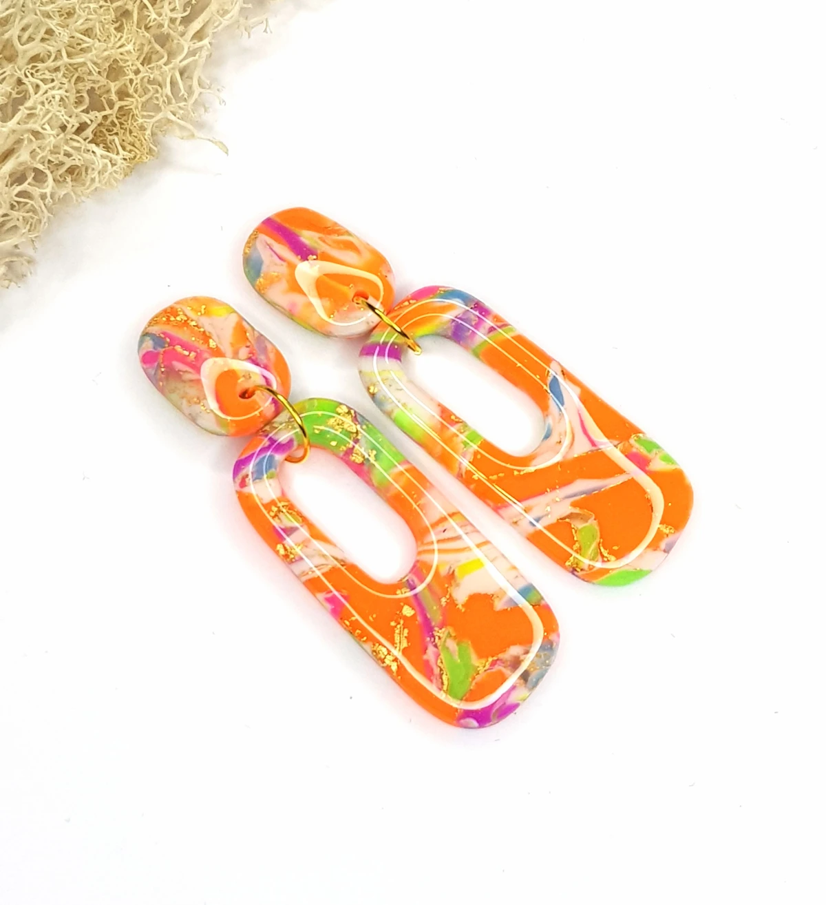 Ręcznie robione kolczyki wyróżniają się intensywnym, marmurkowym wzorem w jaskrawych kolorach: pomarańczu, różu, zieleni i bieli, uzupełnionym złotymi drobinkami. Składają się z dwóch elementów – zaokrąglonej górnej części oraz wydłużonej, prostokątnej ramy z zaokrąglonymi rogami, które są połączone złotymi ogniwami. Dzięki geometrycznym kształtom i dynamicznej kolorystyce przyciągają wzrok i wprowadzają odważny akcent do stylizacji. Materiały takie jak glina polimerowa i żywica nadają im trwałość oraz artystyczny charakter. To idealny wybór dla osób ceniących unikalną biżuterię pełną energii i kreatywności. Długość 6,3cm. Kolor pomarańczy to jaskrawy- neon. Ciężko uchwycić go na zdjęciu.