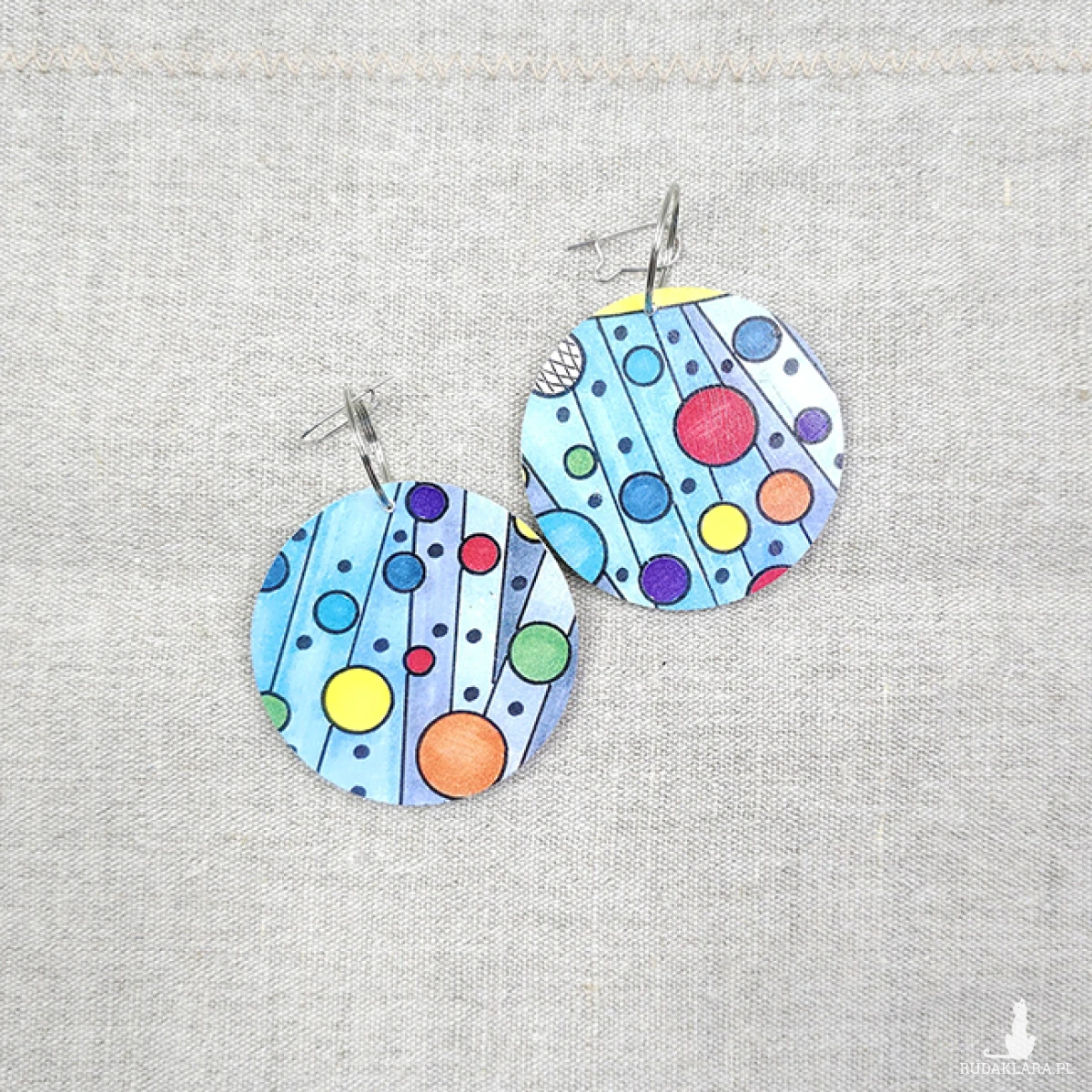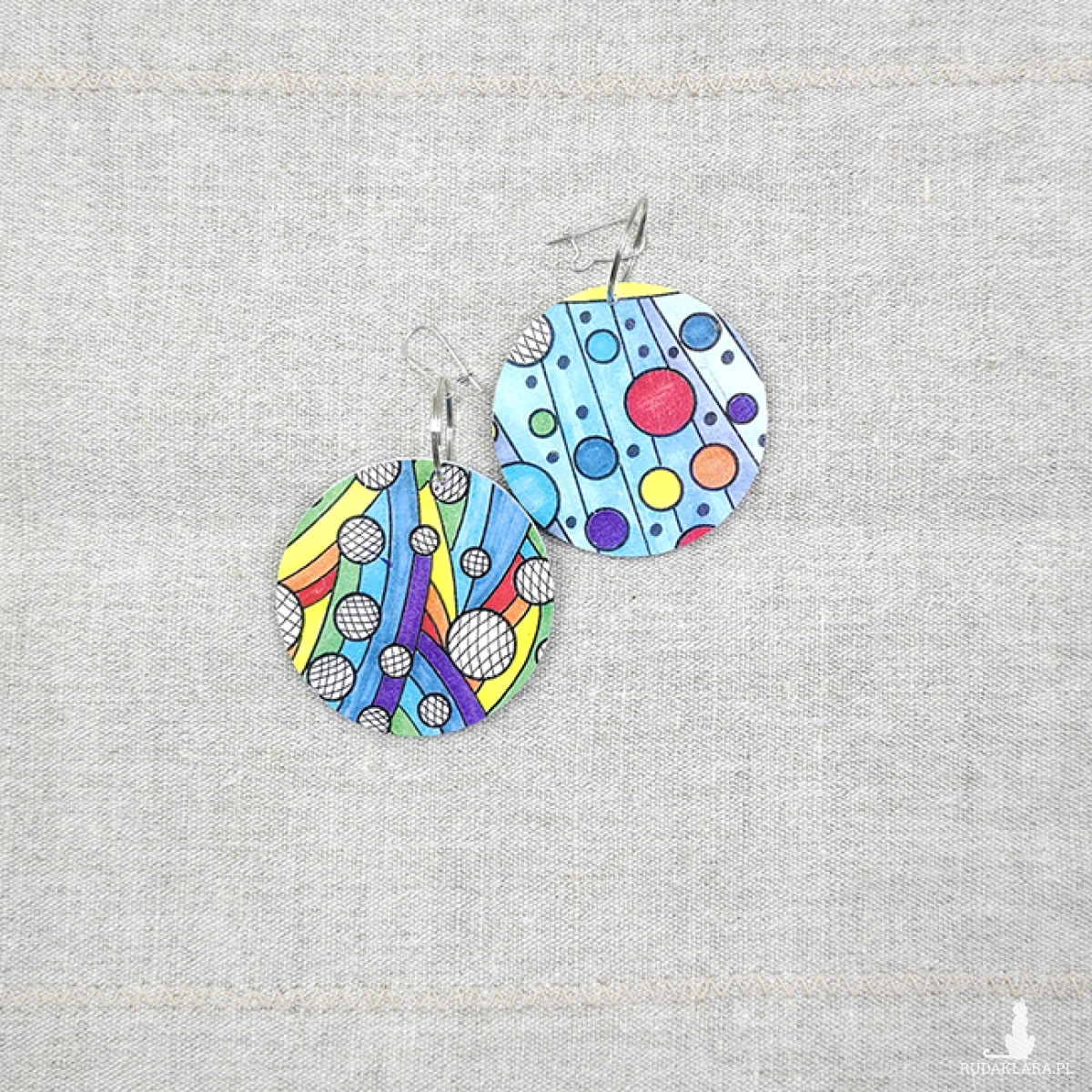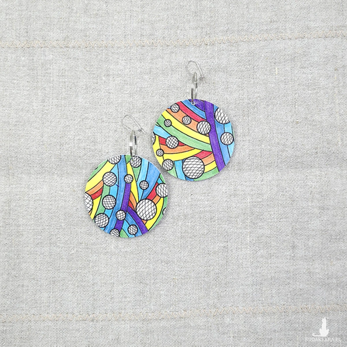 Ręcznie malowane (rysowane) kolczyki. Baza drewniana plus satynowy papier.
