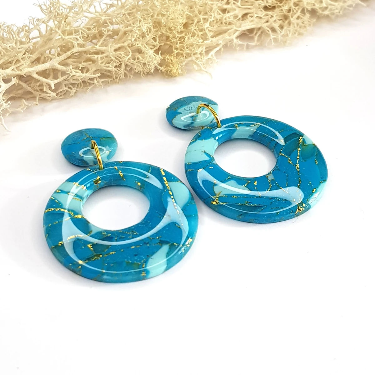 Kolczyki z gliny polimerowej to prawdziwe dzieła sztuki. Ich intensywny turkusowy kolor w połączeniu z delikatnymi złotymi żyłkami tworzy elegancką i wyrazistą kompozycję. Mają długość 5,5 cm, co nadaje im efektownego charakteru, a jednocześnie są lekkie i wygodne w noszeniu. Okrągła, warstwowa forma przywodzi na myśl fale oceanu, które odbijają promienie słońca. Całość została pokryta połyskującą żywicą, dzięki czemu kolczyki są trwałe i zyskują wyjątkowy blask. To idealny dodatek zarówno na co dzień, jak i na wyjątkowe okazje, który przyciągnie spojrzenia i podkreśli unikalny styl. Każda para odrobinę się od siebie różni. Czas dostawy od 3 do 5 dni roboczych.