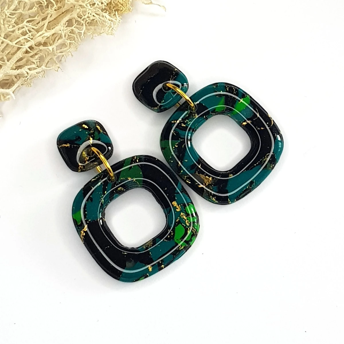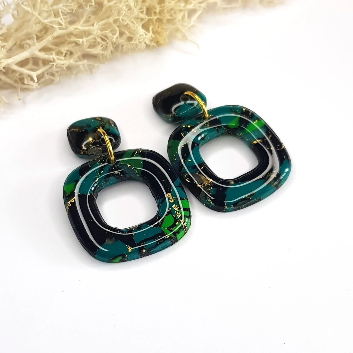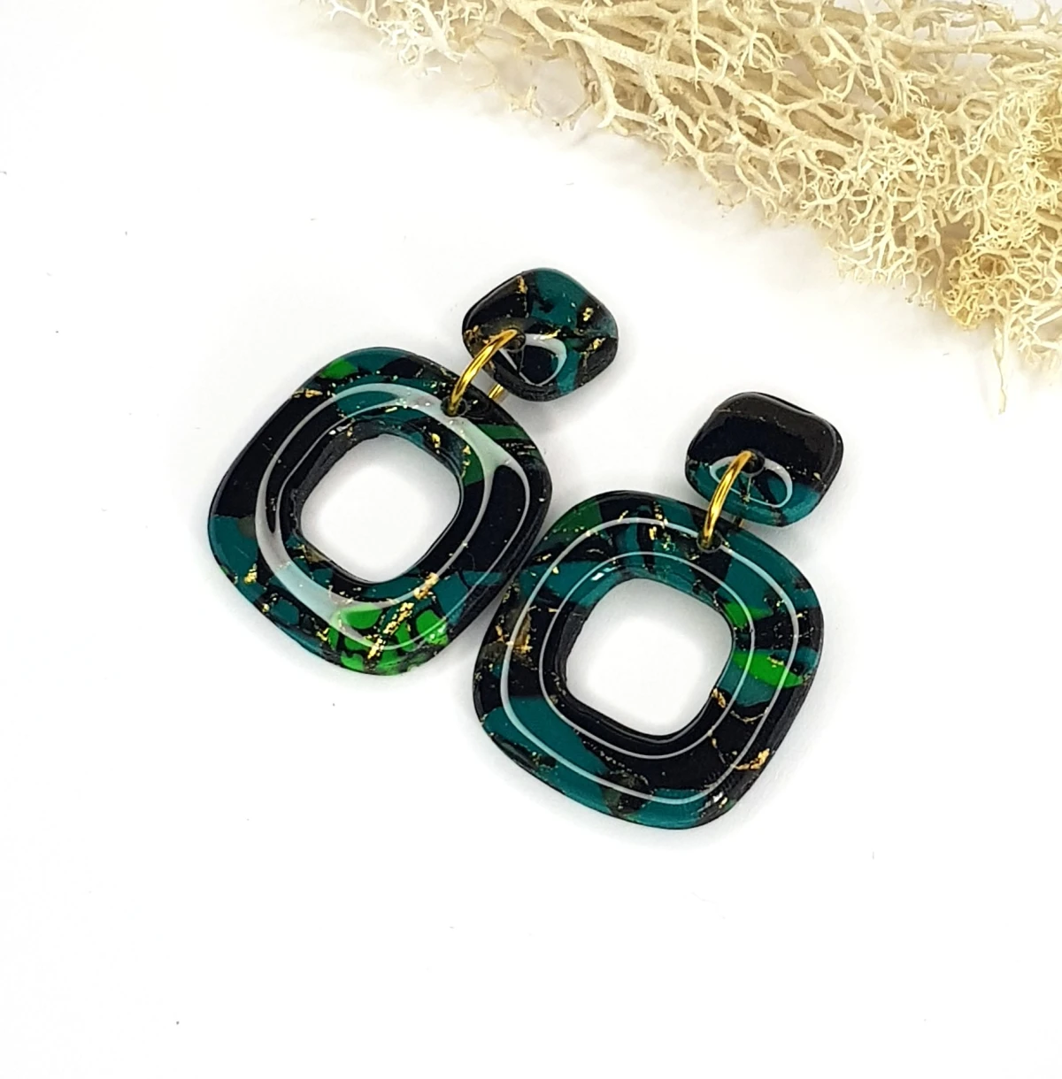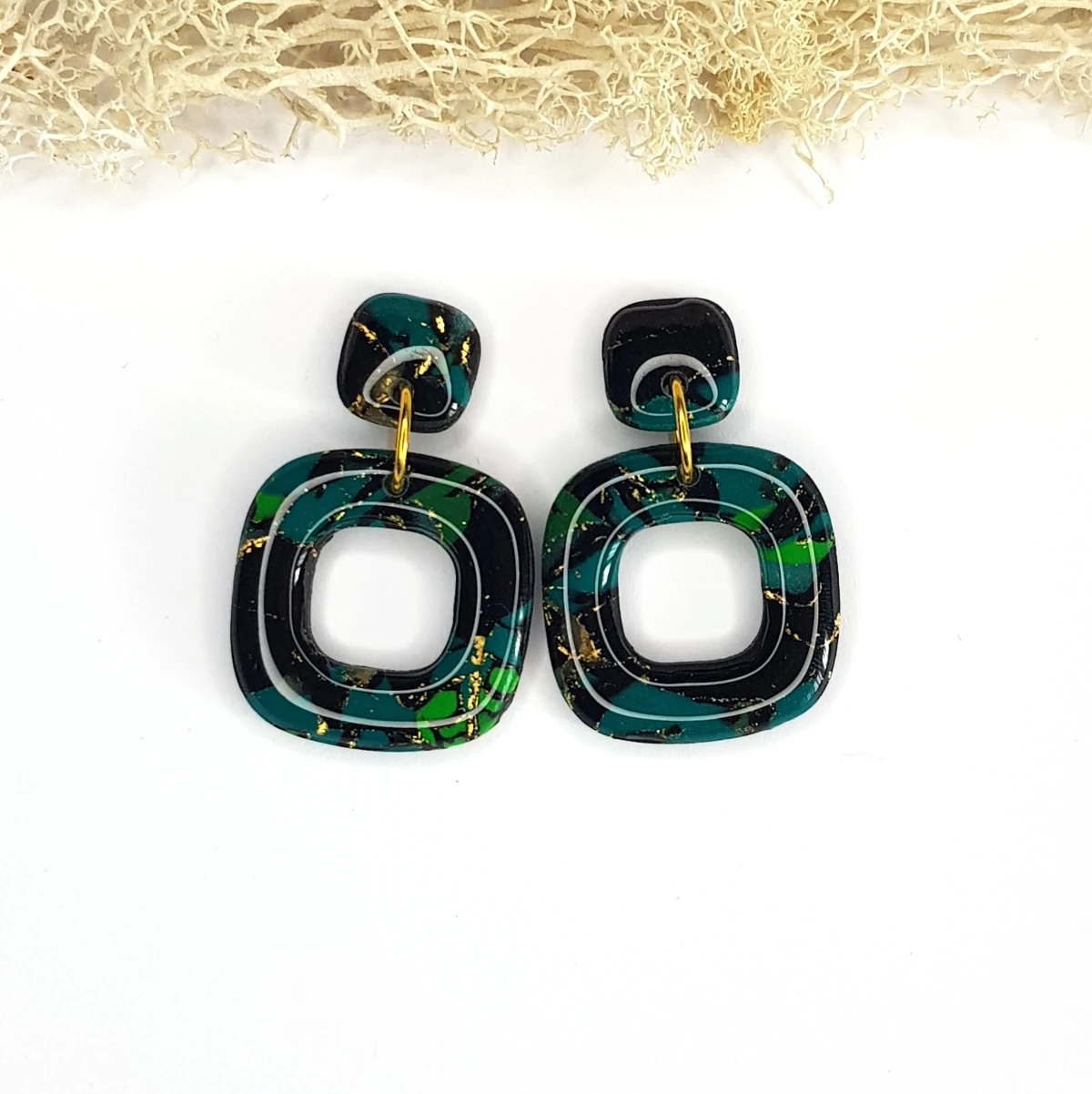 Te kolczyki z gliny polimerowej to połączenie nowoczesnej formy i głębi barw. Ich kwadratowe podwieszki w odcieniach czerni i zieleni przypominają mistyczny las w świetle księżyca, tworząc tajemniczy i wyrafinowany efekt. Długość 4,5