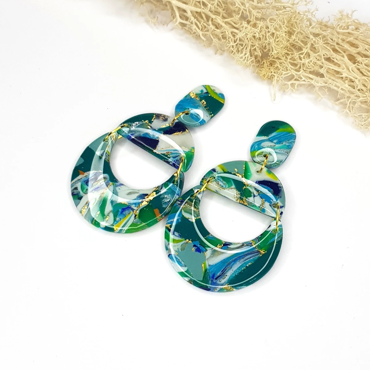 Ręcznie robione kolczyki z glinki polimerowej zachwycają unikalnym połączeniem odcieni błękitu i zieleni, które przywodzą na myśl spokojne wody i głębię natury. Każdy kolczyk składa się z trzech harmonijnie uzupełniających się elementów: podłużnej bazy z wklejonym antyalergicznym sztyftem, półkolistego akcentu oraz delikatnego kształtu księżyca. Elementy te zostały połączone złotymi ogniwkami, które dodają subtelnego blasku i elegancji. Kolczyki mają długość 6,5 cm, dzięki czemu efektownie podkreślają szyję, a jednocześnie pozostają lekkie i wygodne w noszeniu. Pokrycie żywicą epoksydową nadaje im wyjątkowy połysk i sprawia, że są trwałe i odporne na uszkodzenia. Jeśli chciałbyś zamówić podobne kolczyki w innych kolorach, zapraszam do kontaktu – z przyjemnością stworzę coś wyjątkowego specjalnie dla Ciebie!