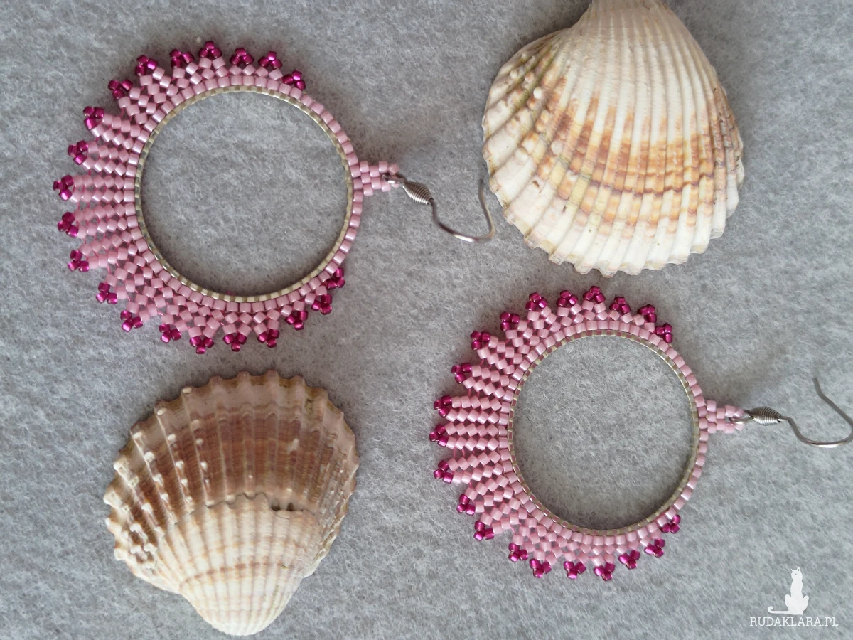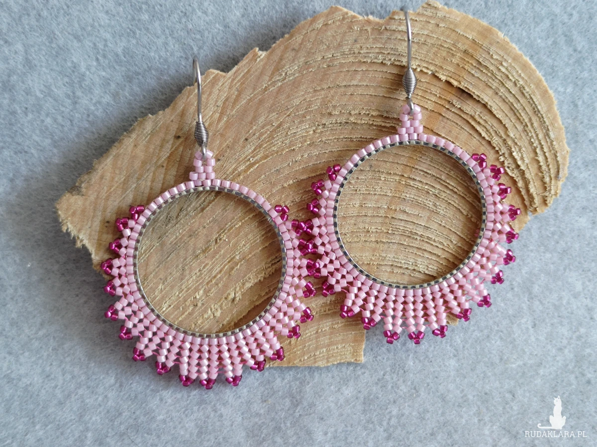 Kolczyki wykonane są z japońskich koralików miyuki techniką beadingu na okrągłej bazie. Koraliki są w odcieniach różu. Średnica okrągłej bazy kolczyka wynosi 3 cm Kolczyki zawieszone są na otwartych biglach ze stali chirurgicznej.