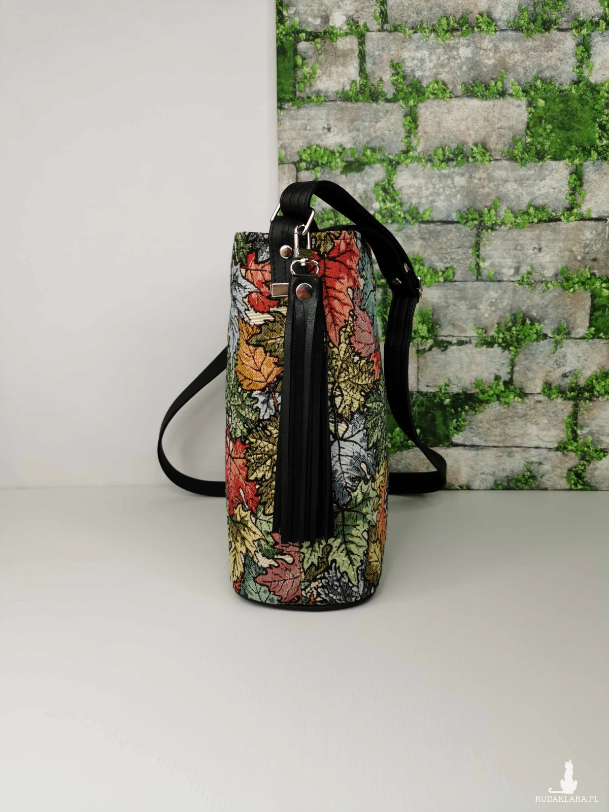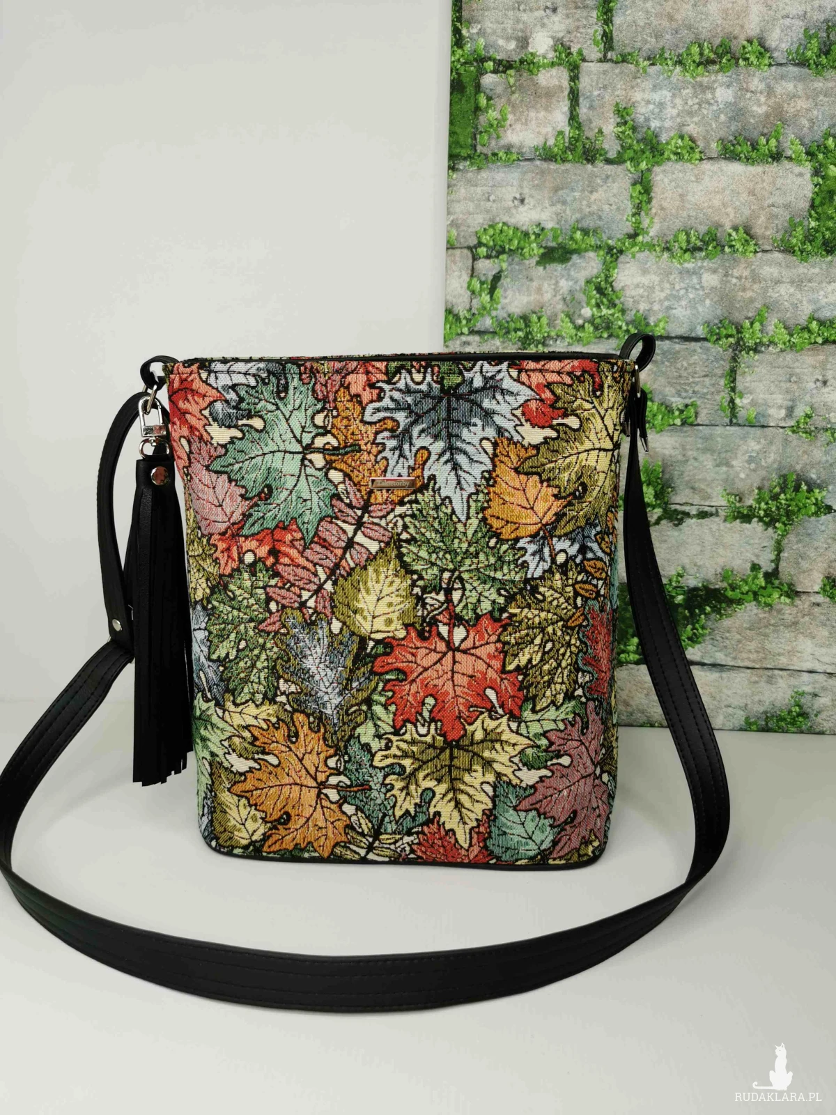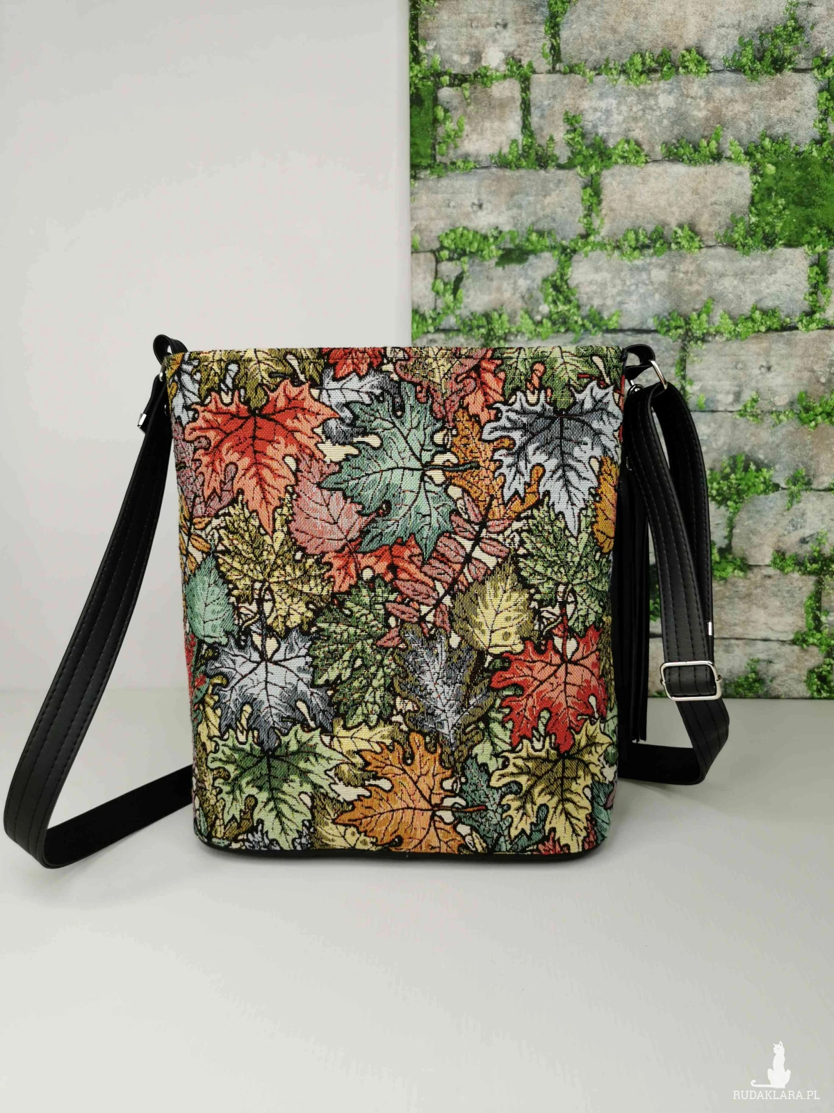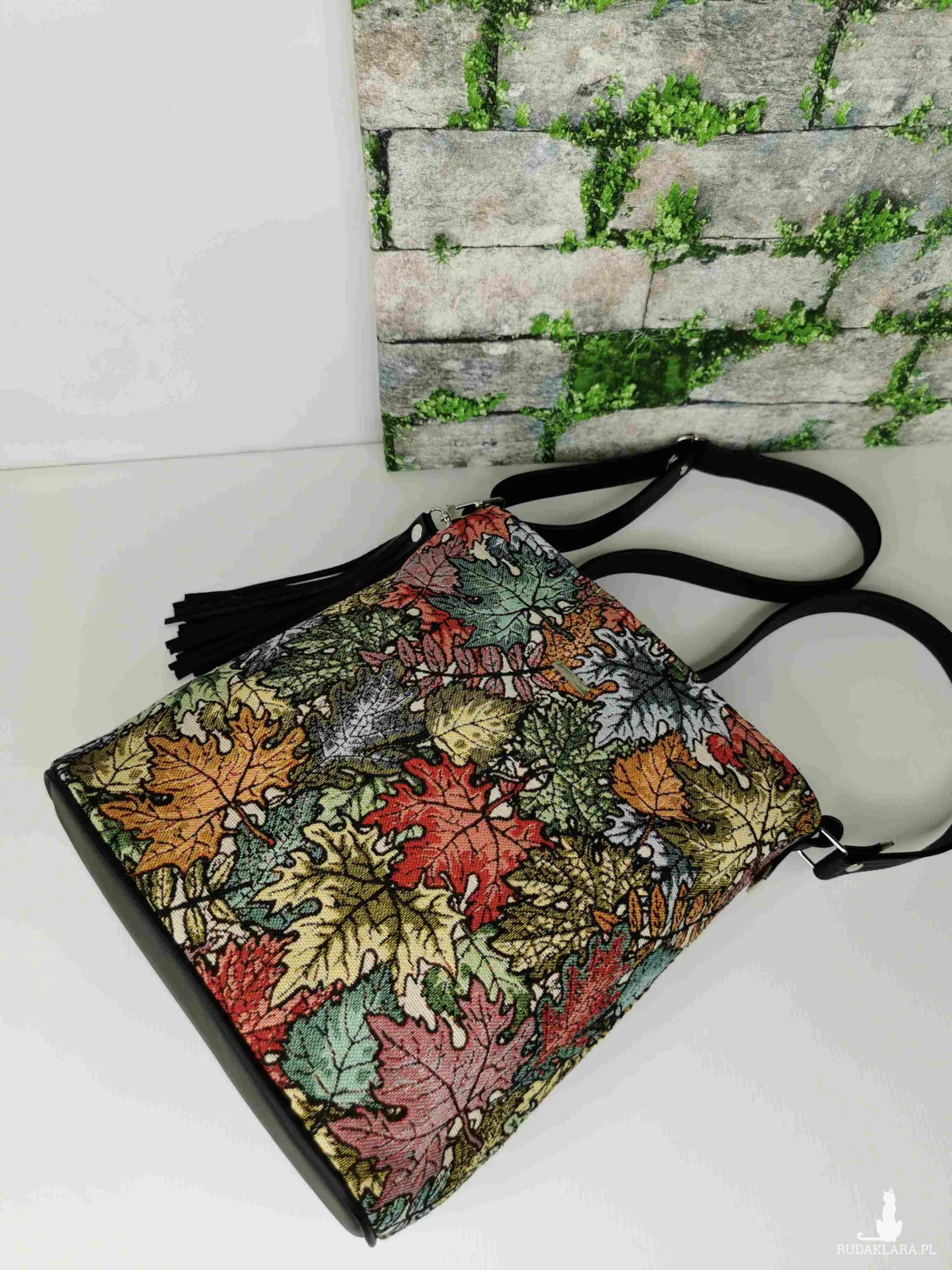 Torebka listonoszka na długim regulowanym pasku z zaokrąglonym dnem. W komplecie, ozdobny odpinany chwost. Torebka została wykonana z tkaniny żakardowej w kolorowe liście i ekoskóry w kolorze czarnym. Zapinana na zamek. Wewnątrz, podszewka z tkaniny poliestrowej wodoodpornej w kolorze czarnym, oraz dwie pojemne kieszenie w tym jedna zapinana na zamek. Zamontowana jest też smycz z karabińczykiem na klucze.