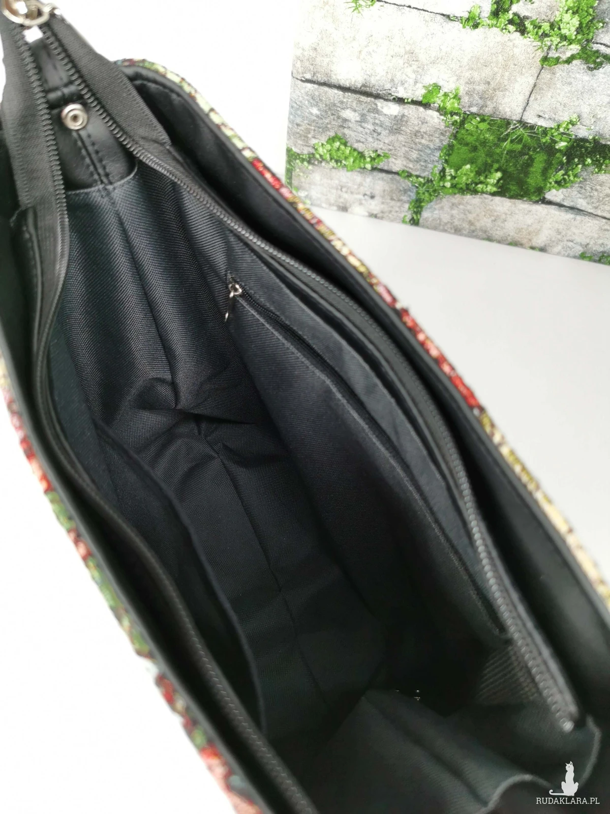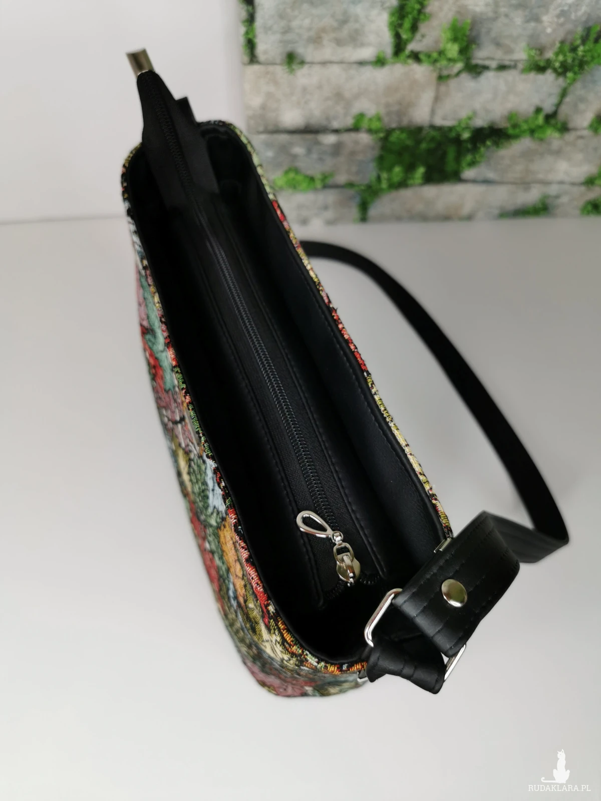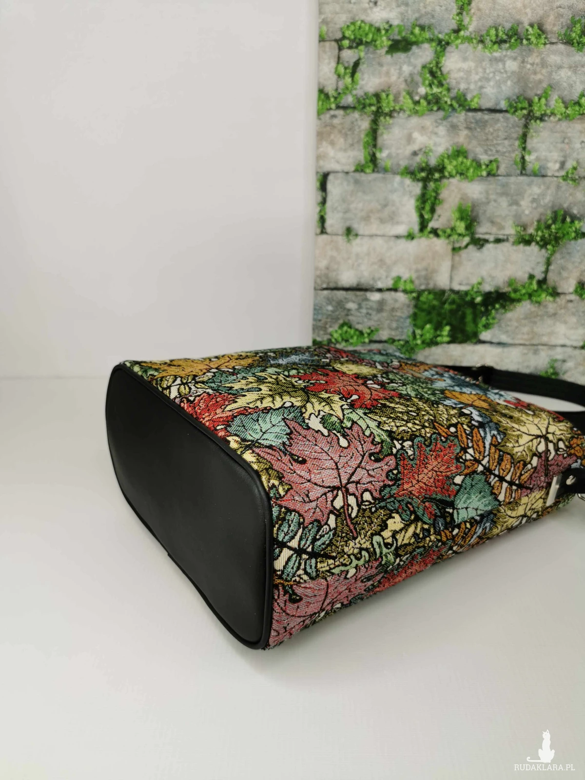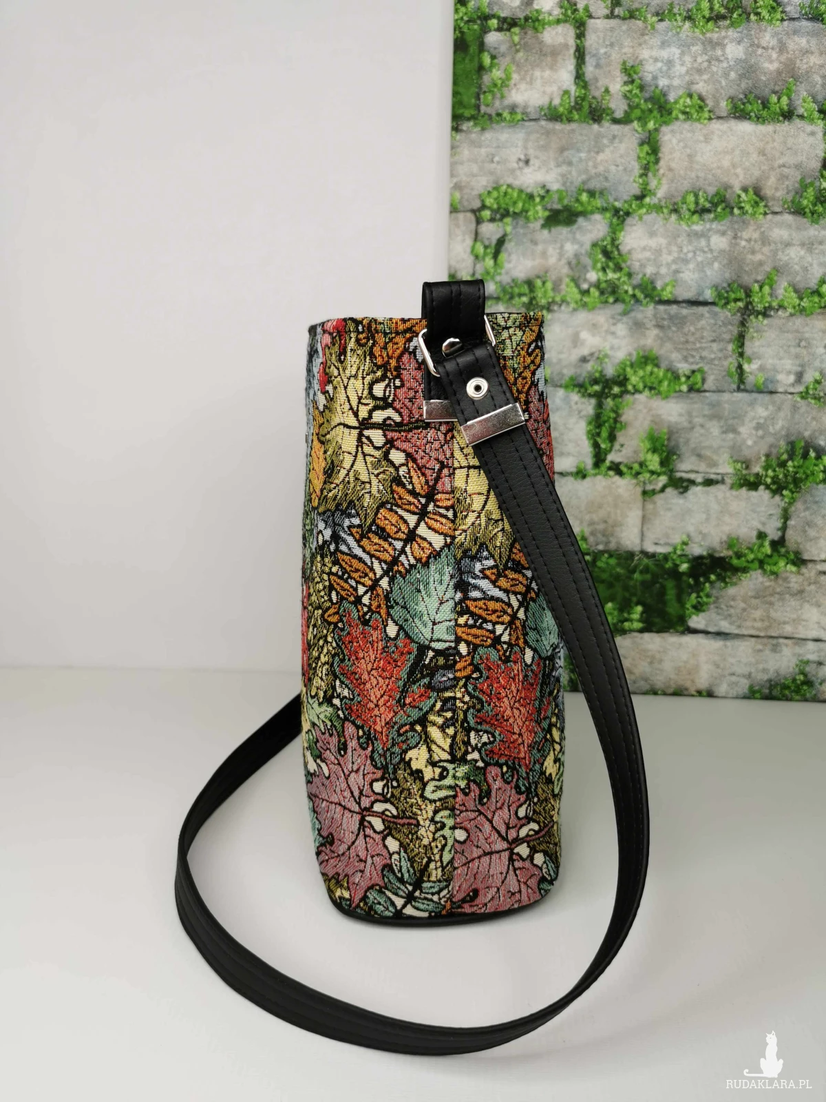 Torebka listonoszka na długim regulowanym pasku z zaokrąglonym dnem. W komplecie, ozdobny odpinany chwost. Torebka została wykonana z tkaniny żakardowej w kolorowe liście i ekoskóry w kolorze czarnym. Zapinana na zamek. Wewnątrz, podszewka z tkaniny poliestrowej wodoodpornej w kolorze czarnym, oraz dwie pojemne kieszenie w tym jedna zapinana na zamek. Zamontowana jest też smycz z karabińczykiem na klucze.