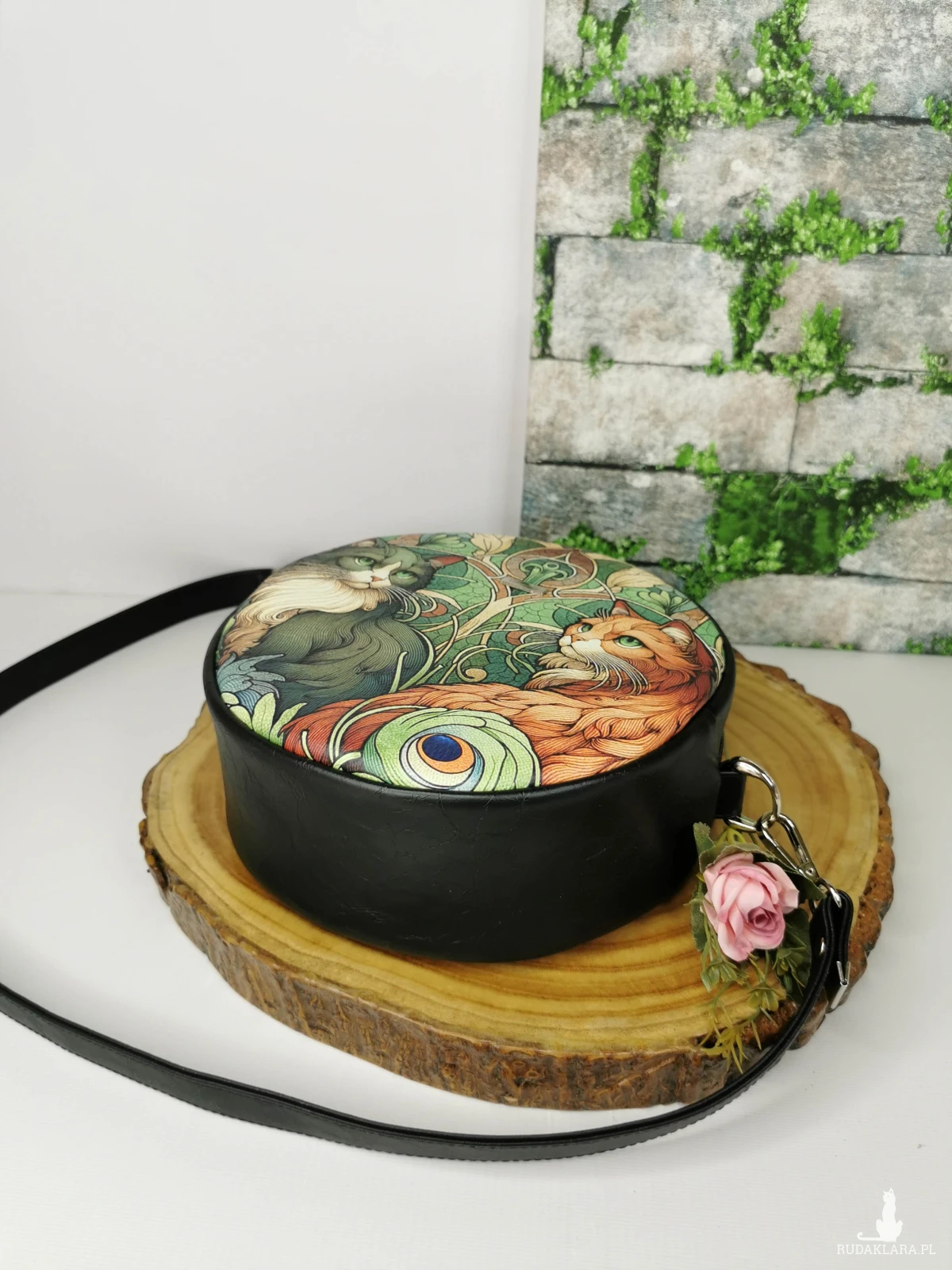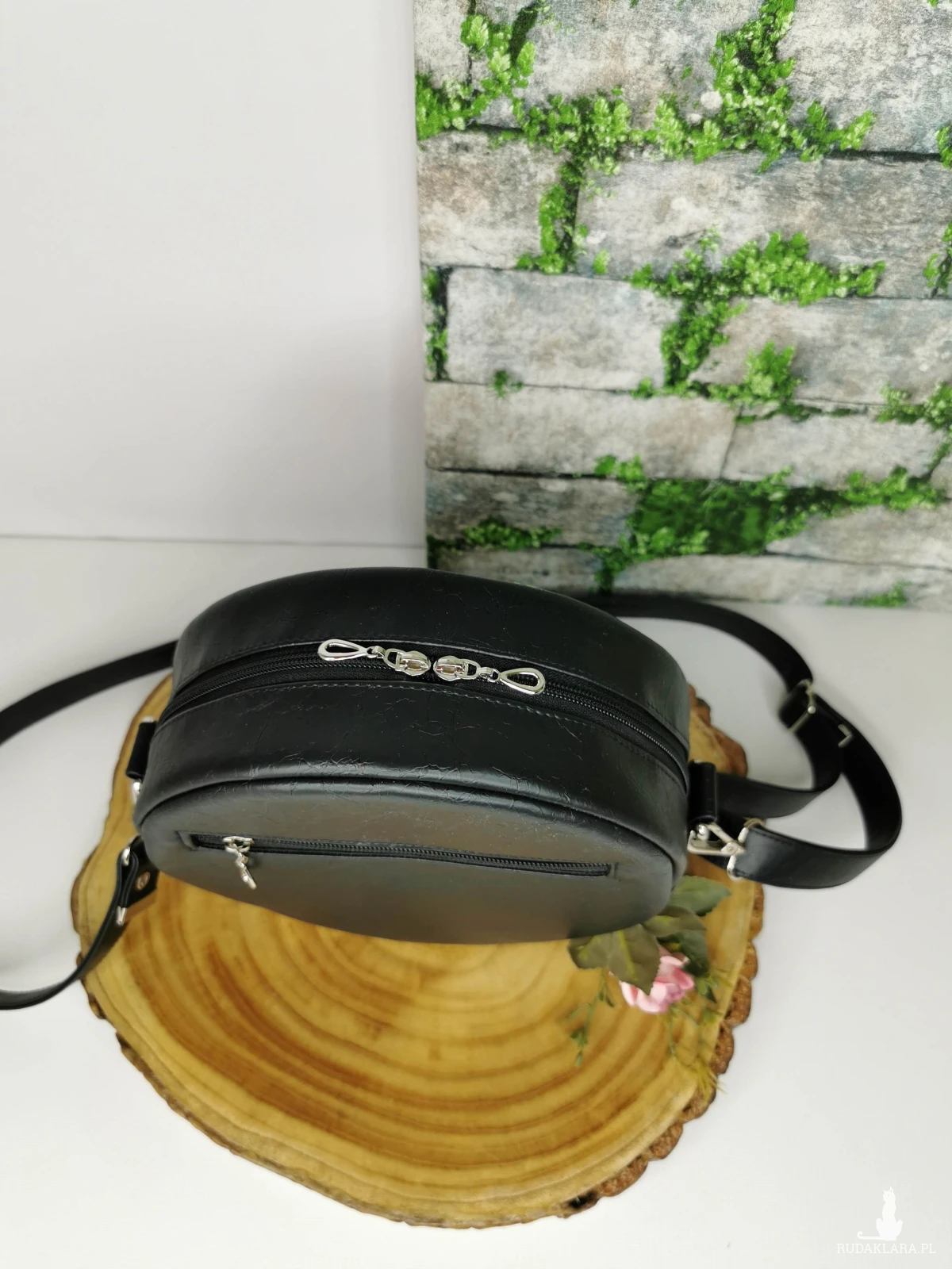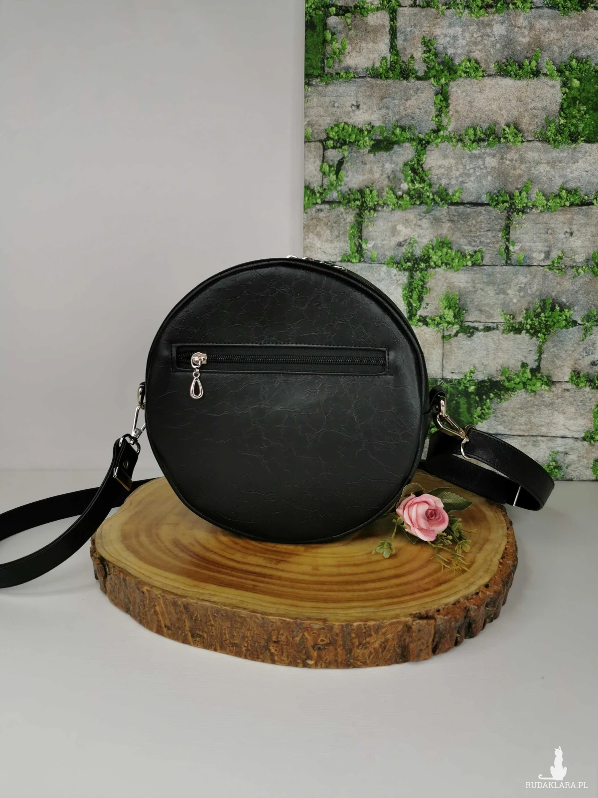 Torebka okrągła - Round Bag. Torebka zapinana na zamek. Wykonana w całości z ekoskóry kaletniczej. Przód torebki to ekoskóra wzorzysta. Tył torebki czarna ekoskóra