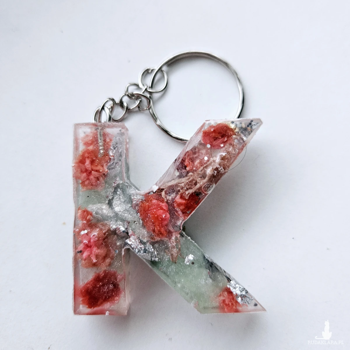 Brelok literka K zielona z różem i kwiatem