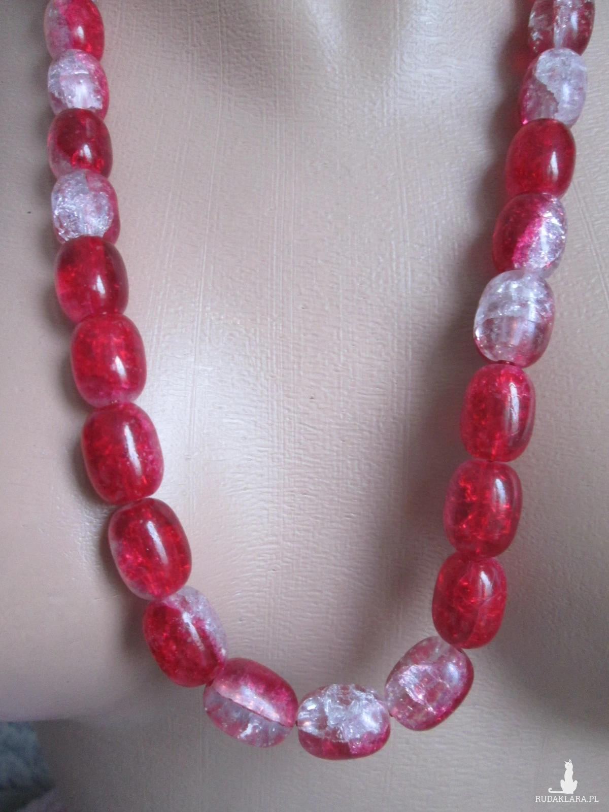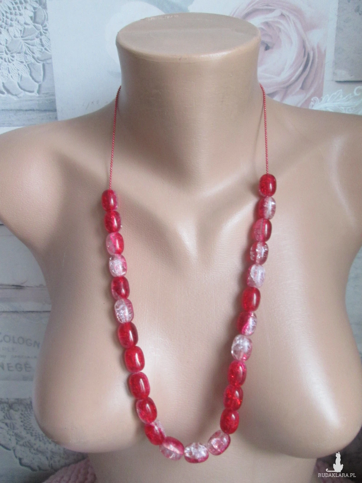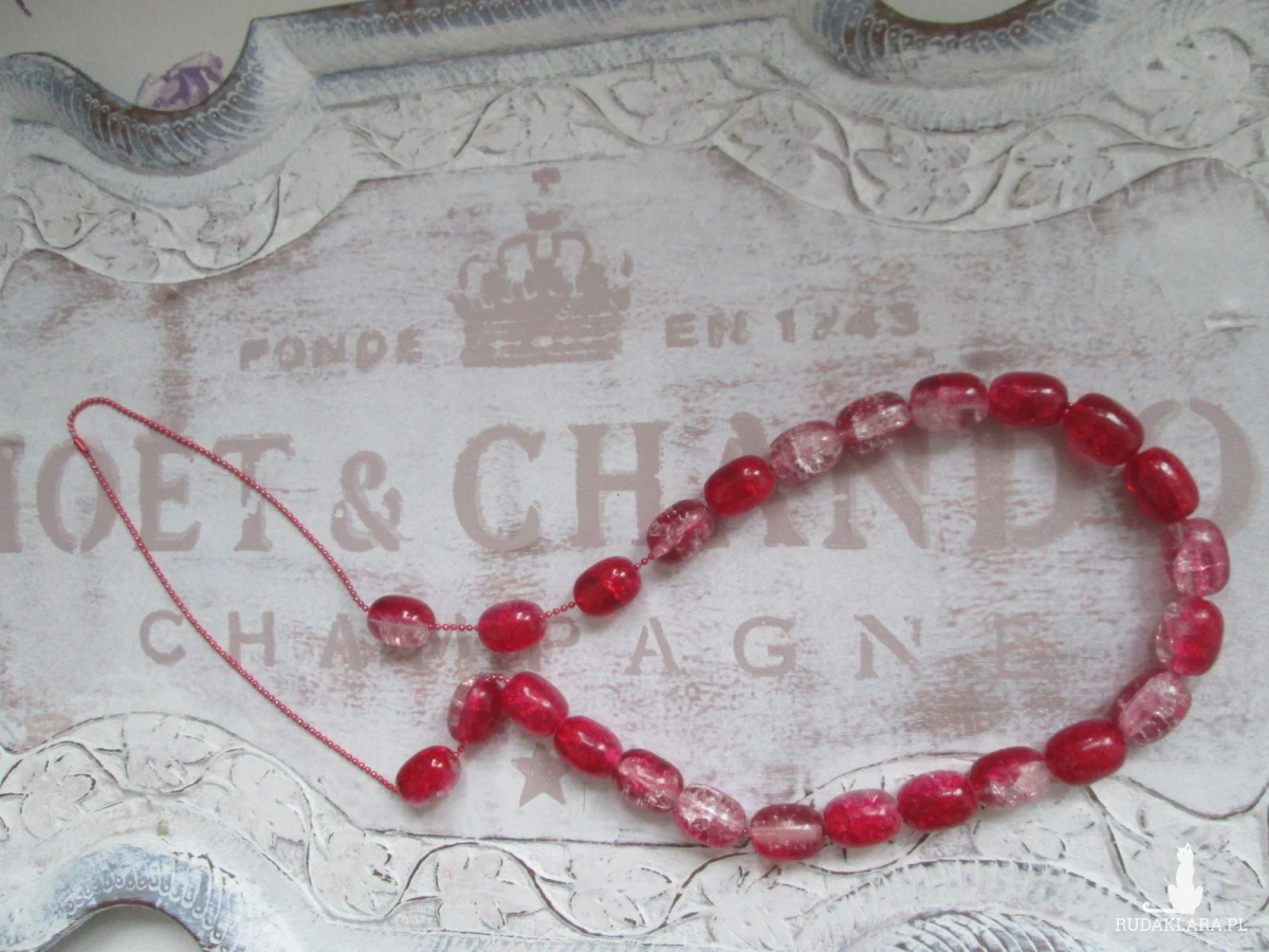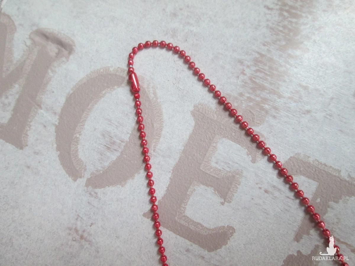 Materiały:ozdobne koraliki podłużne(ceramika/ plastik-przezroczyste,imitacja żelu/żywicy/potłuczonego szkła),na łańcuszku kulkowym(metal-jasny czerwony),zapięcie typu łódka