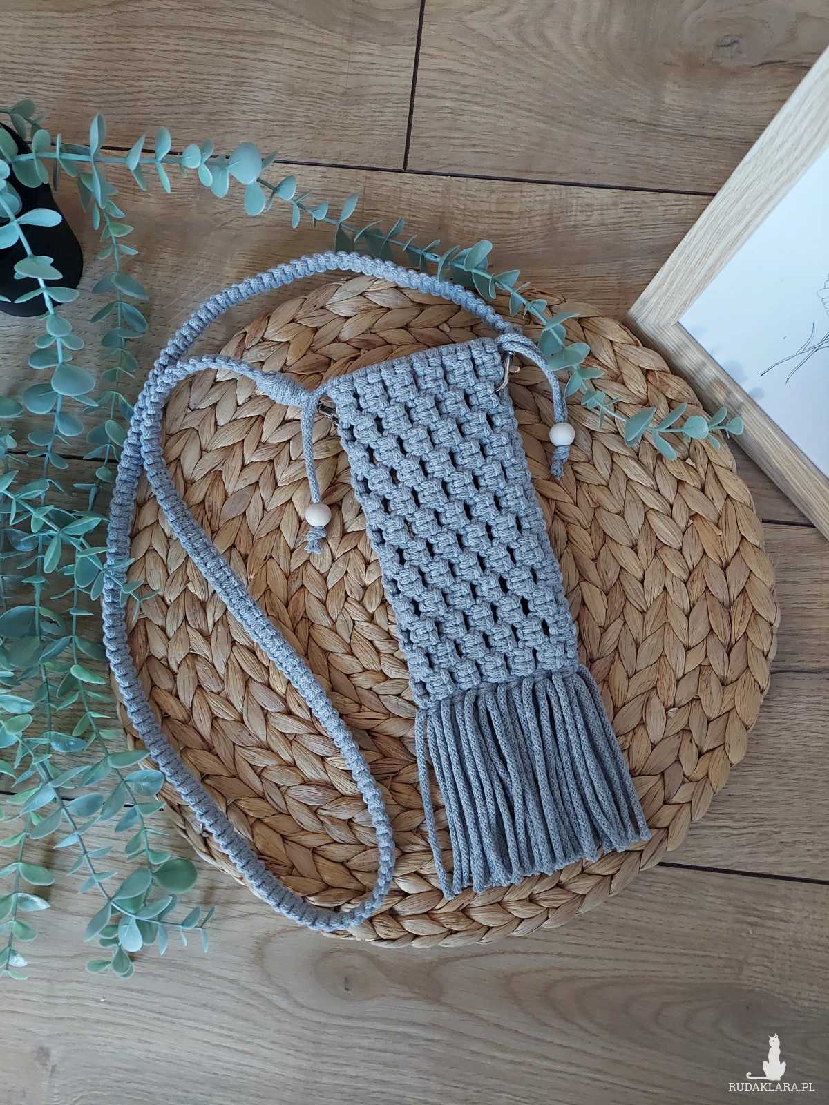 Ręcznie wykonana makramowa torebka, która świetnie sprawdzi się jako etui na telefon. Torebka posiada sznureczek jako ściągacz, a pasek jest odpinany- posiada karabińczyki.