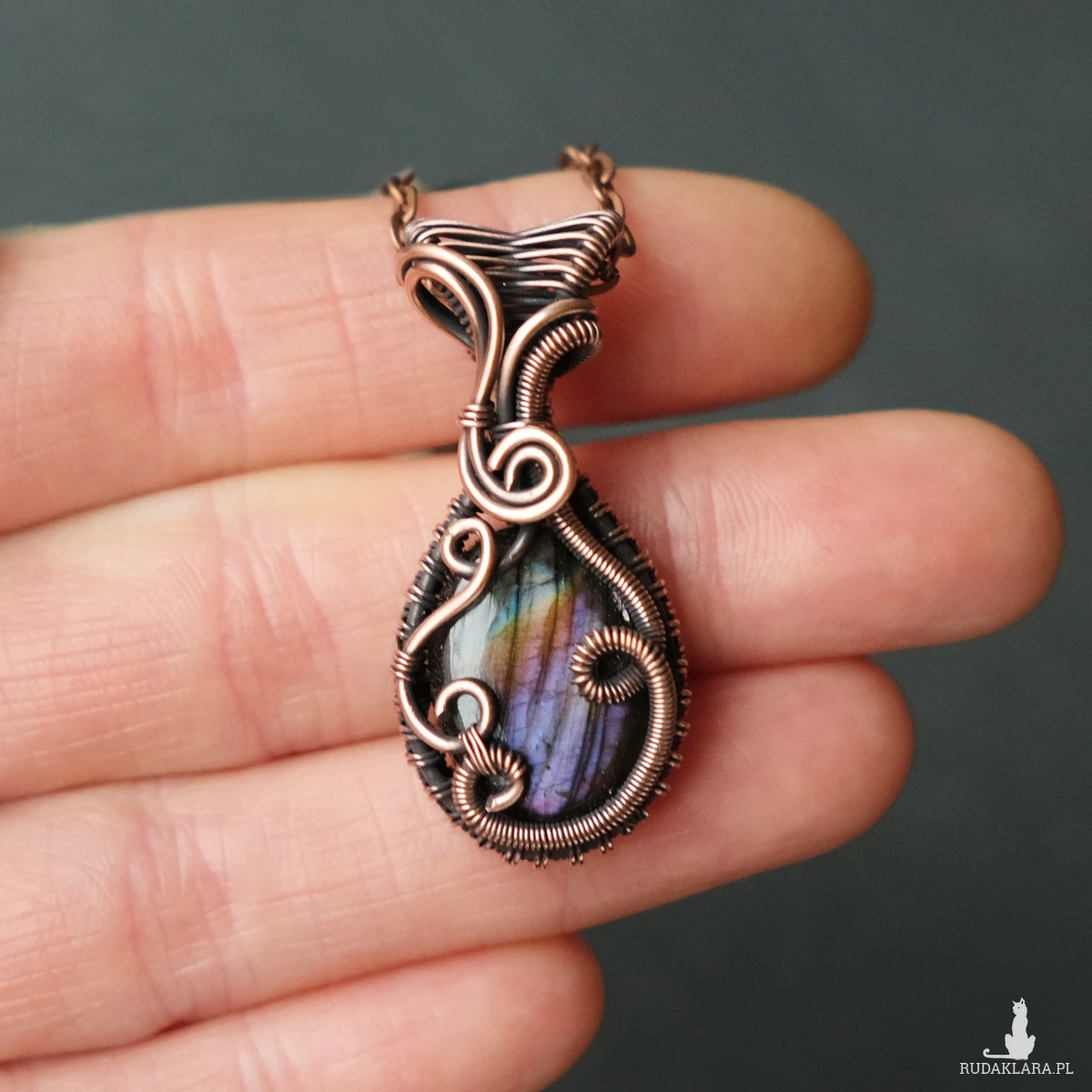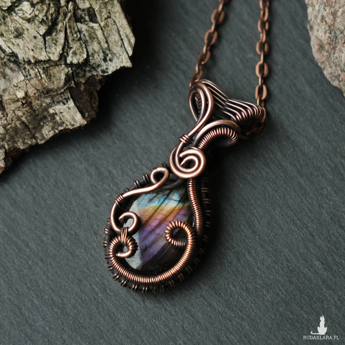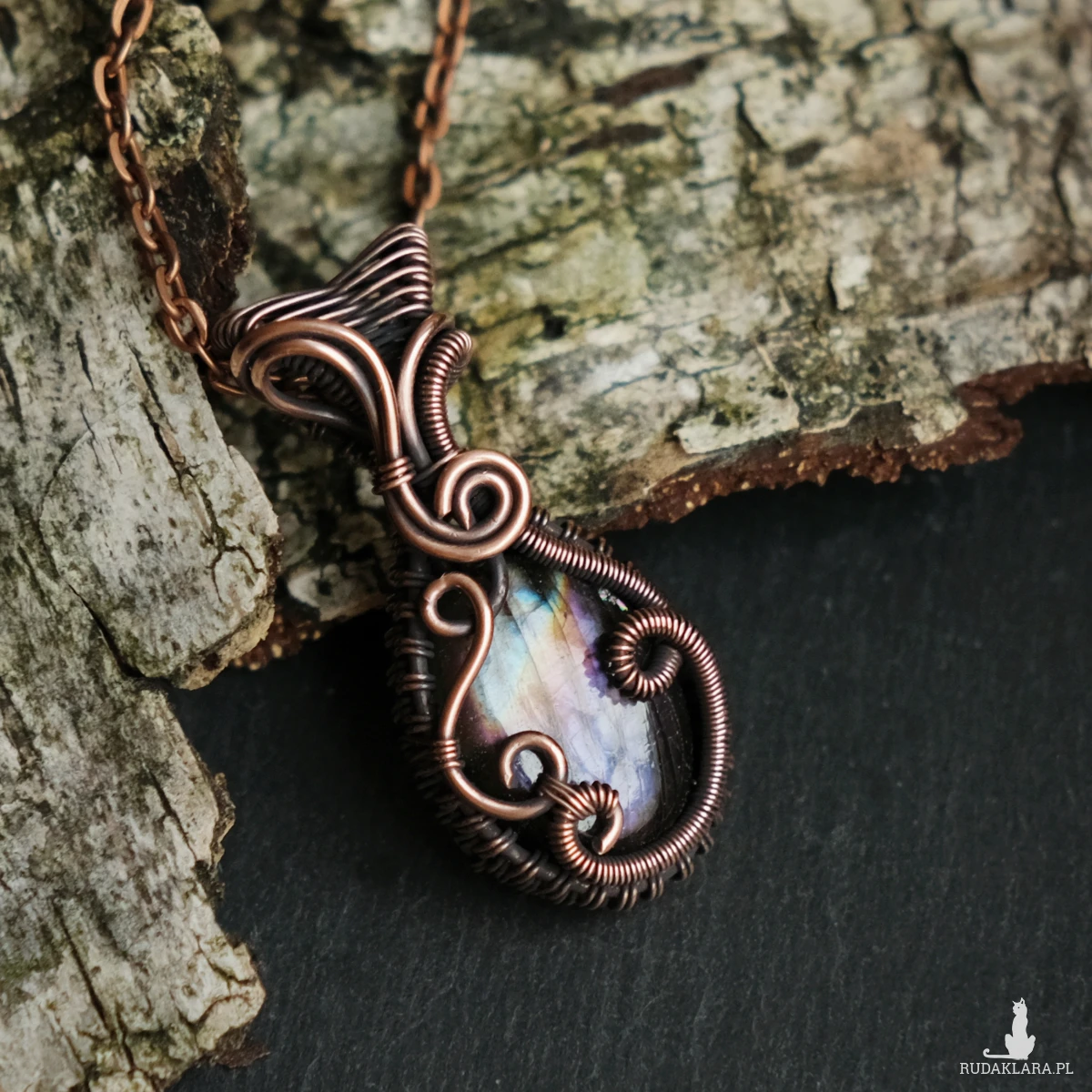 Miedziany wisiorek mieści w sobie kamień labradorytu mieniącego się w świetle pomarańczem, fioletem oraz błękitem. Posiada zwartą oprawę - ozdobne boczki oraz fikuśne sploty dodające mu słodyczy. Wisiorek idealnie sprawdzi się na dekolcie kobiety, która lubi delikatne dodatki, ceniącej wyroby rękodzielnicze.