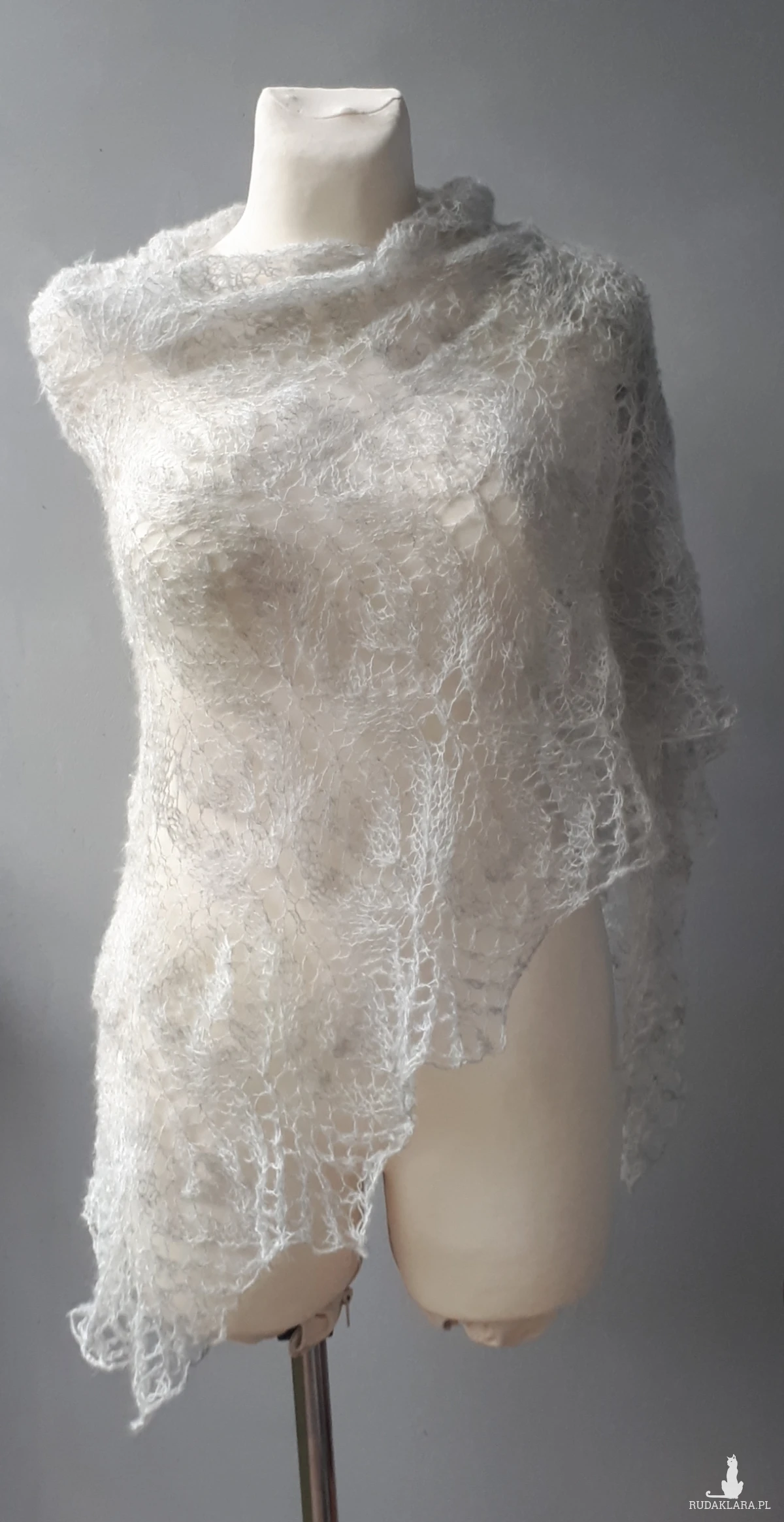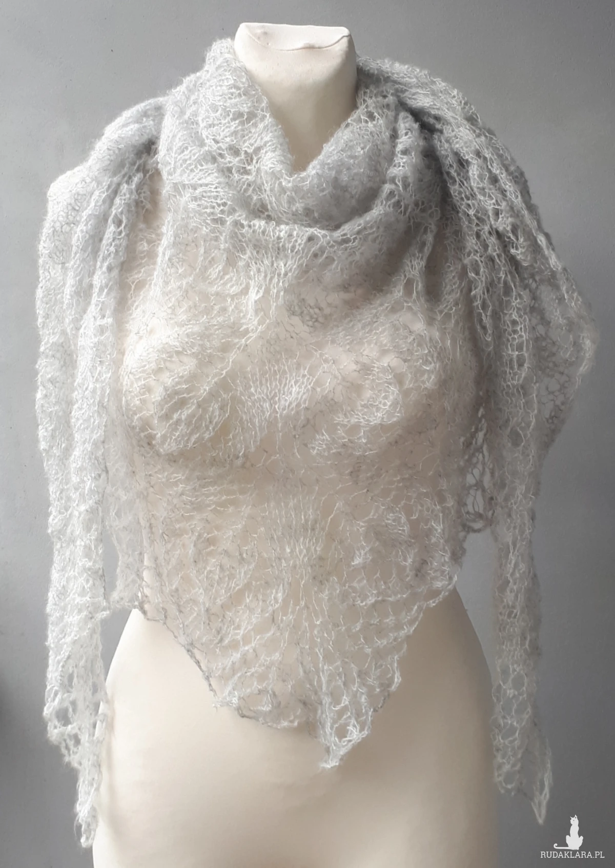 z mieszanki wełny, moheru i akrylu w kolorze jasno szarym.Wymiary: szerokość 210cm, długość 100 cm. Prać ręcznie w temperaturze 30 stopni, suszyć na leżąco .