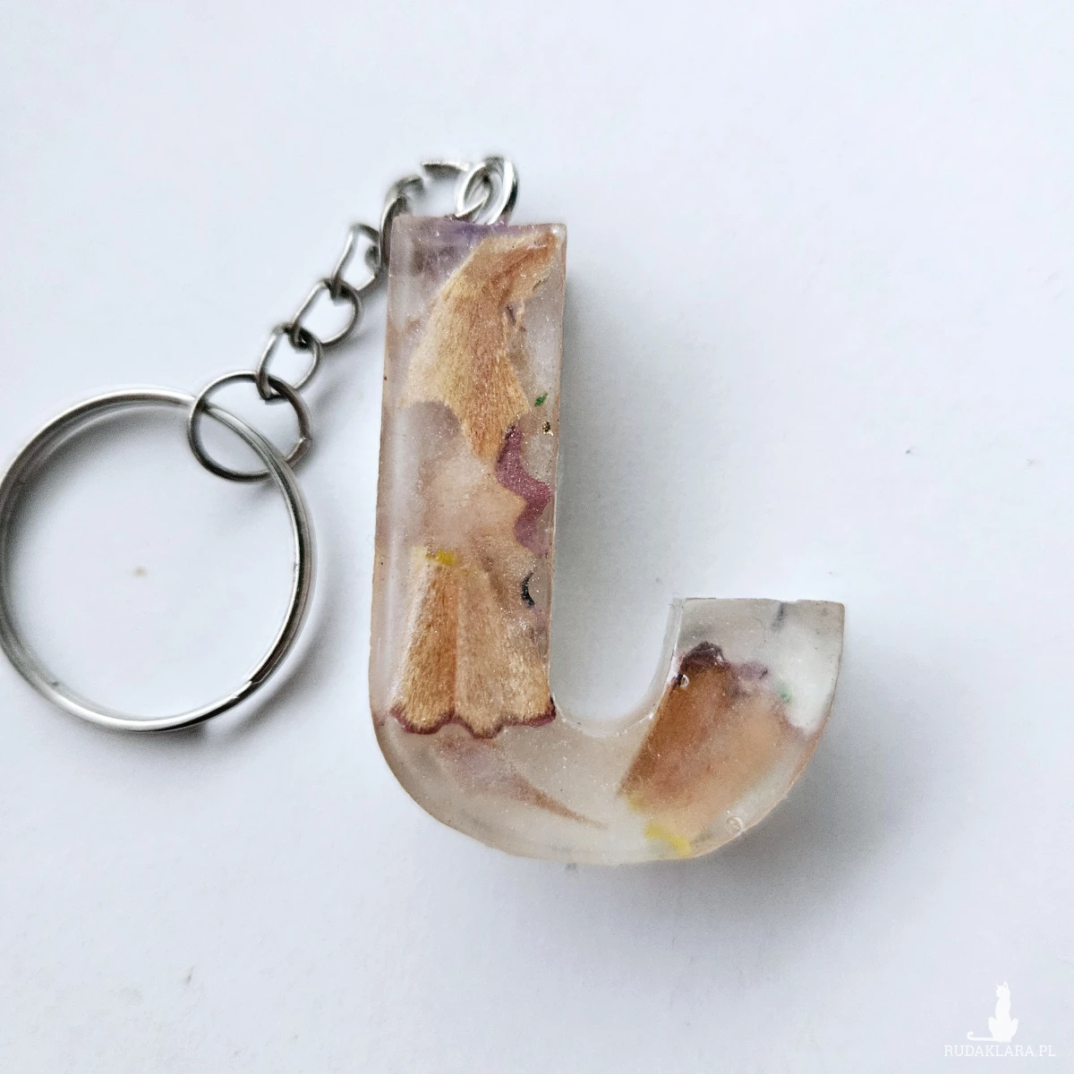 Brelok literka J przezroczysta z kredkami obierkami