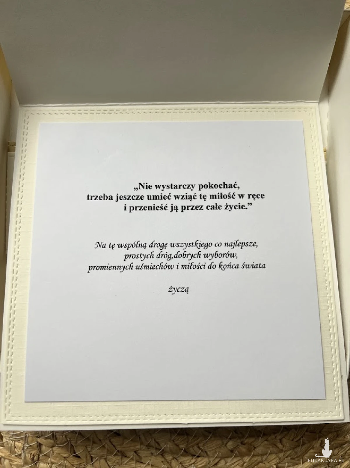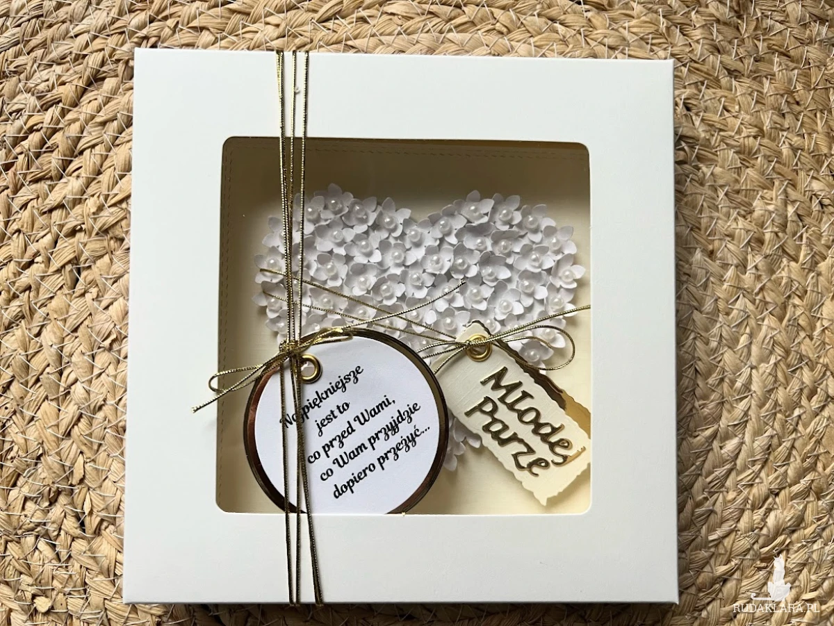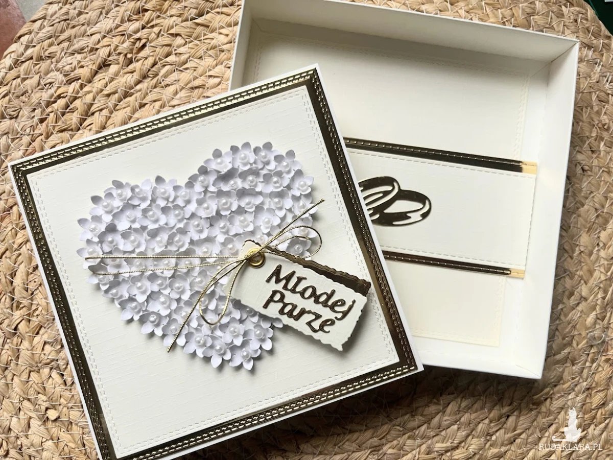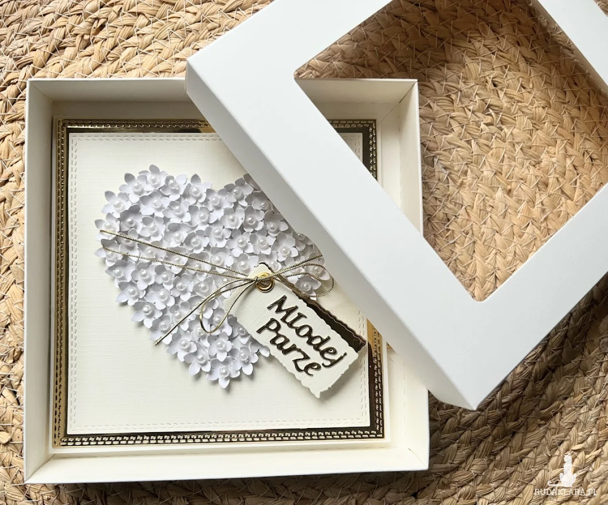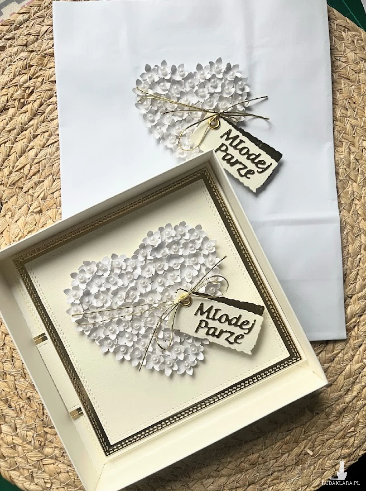 Kartka wykonana metodą scrapbookingu z najwyższej jakości materiałów.Kartka warstwowa z urokliwym sercem stworzonym z kwiatów, ręcznie stworzonych. Wykonane na kremowej bazie z dodatkiem lustrzanego złota . Wielkość kartki to 14 x 14 ,a pudełka z wieczkiem to 15 x 15. Do kompletu dołączono białą torebkę ma wym. 21x18x8. Wewnątrz pudełka umieszczono kieszonkę na małe co nieco a wewnątrz kartki gotowe życzenia do własnoręcznego podpisu. W tej postaci komplet dostępny od ręki. Polecam