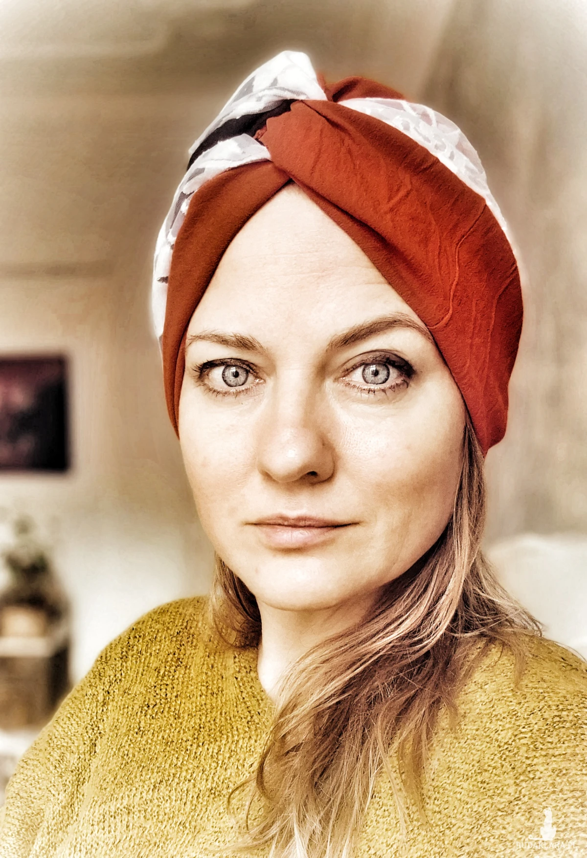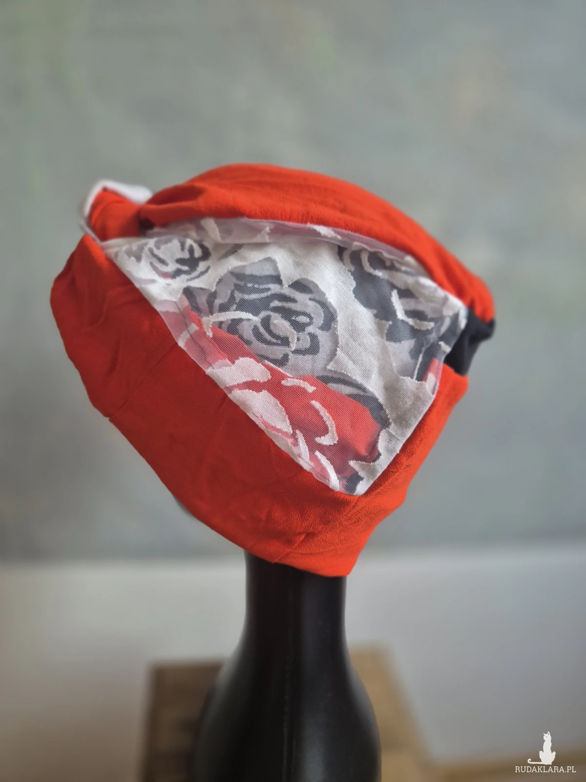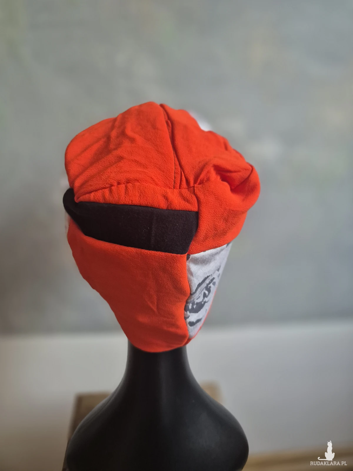 Turban pomarańczowo-biały  etno uszyty z materiałów z recyklingu totalnie zwariowany  uniwersalny, zalecany dla artystek, wizjonerek, prowokatorek i matek które już widzą światełko w tunelu, dla wyzwolonych kotek z wyobraźnia, dla pań bez wyobraźni NIE , box a1
