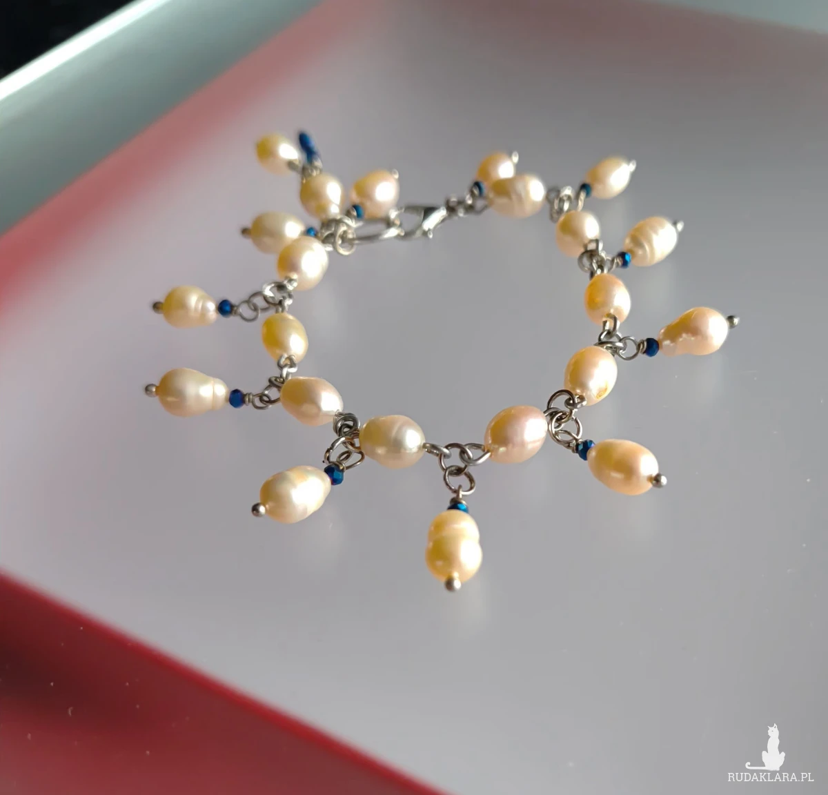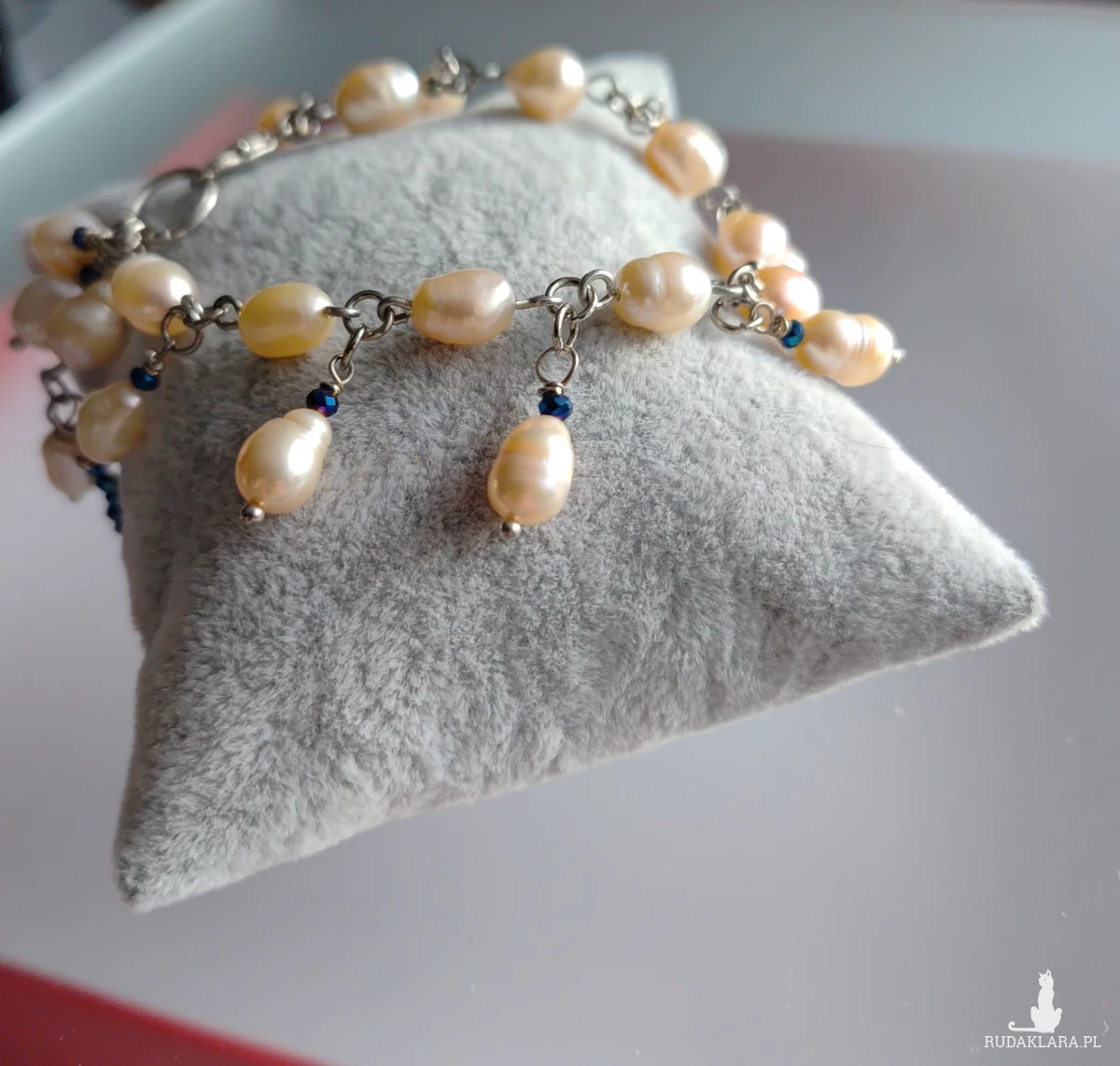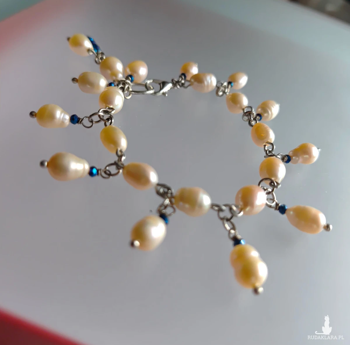 Bransoletka z pereł eqrue, elegancka perłowa biżuteria. Bardzo subtelna, elegancka biżuteria przełamana małą domieszką granatu. Koraliki szklane fasetowane w kolorze granatowo szafirowym. Wykończenia ze stali. Długość bransoletki 17 cm, perły, szkło, stal