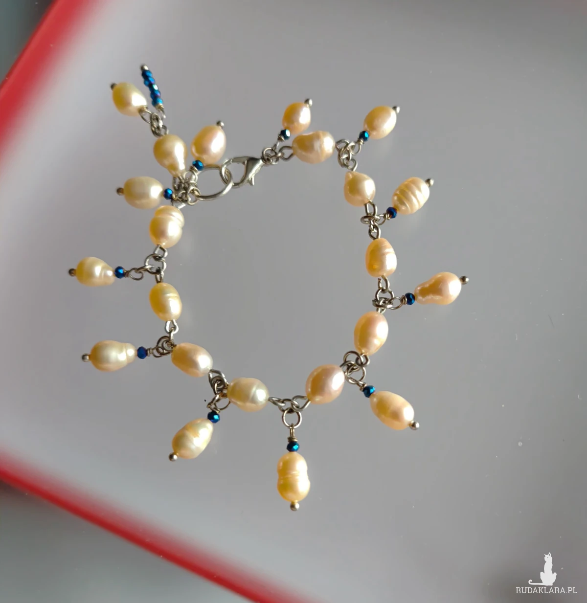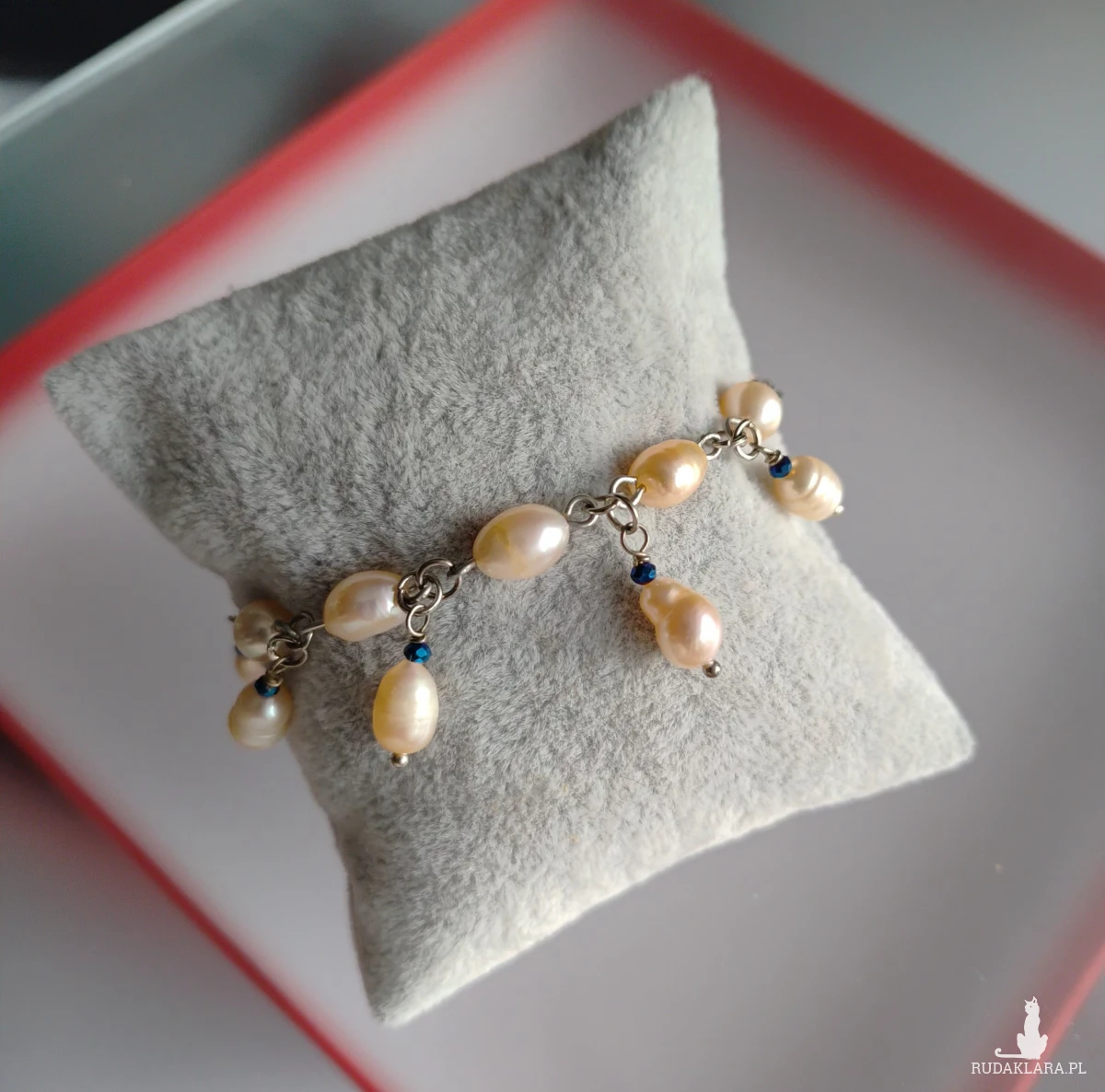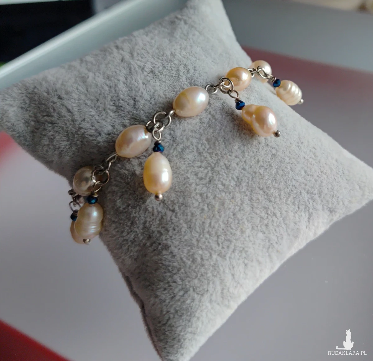 Bransoletka z pereł eqrue, elegancka perłowa biżuteria. Bardzo subtelna, elegancka biżuteria przełamana małą domieszką granatu. Koraliki szklane fasetowane w kolorze granatowo szafirowym. Wykończenia ze stali. Długość bransoletki 17 cm, perły, szkło, stal
