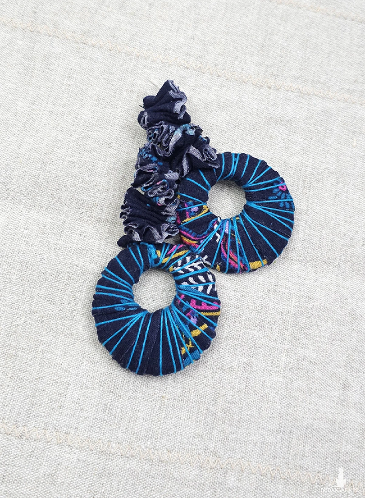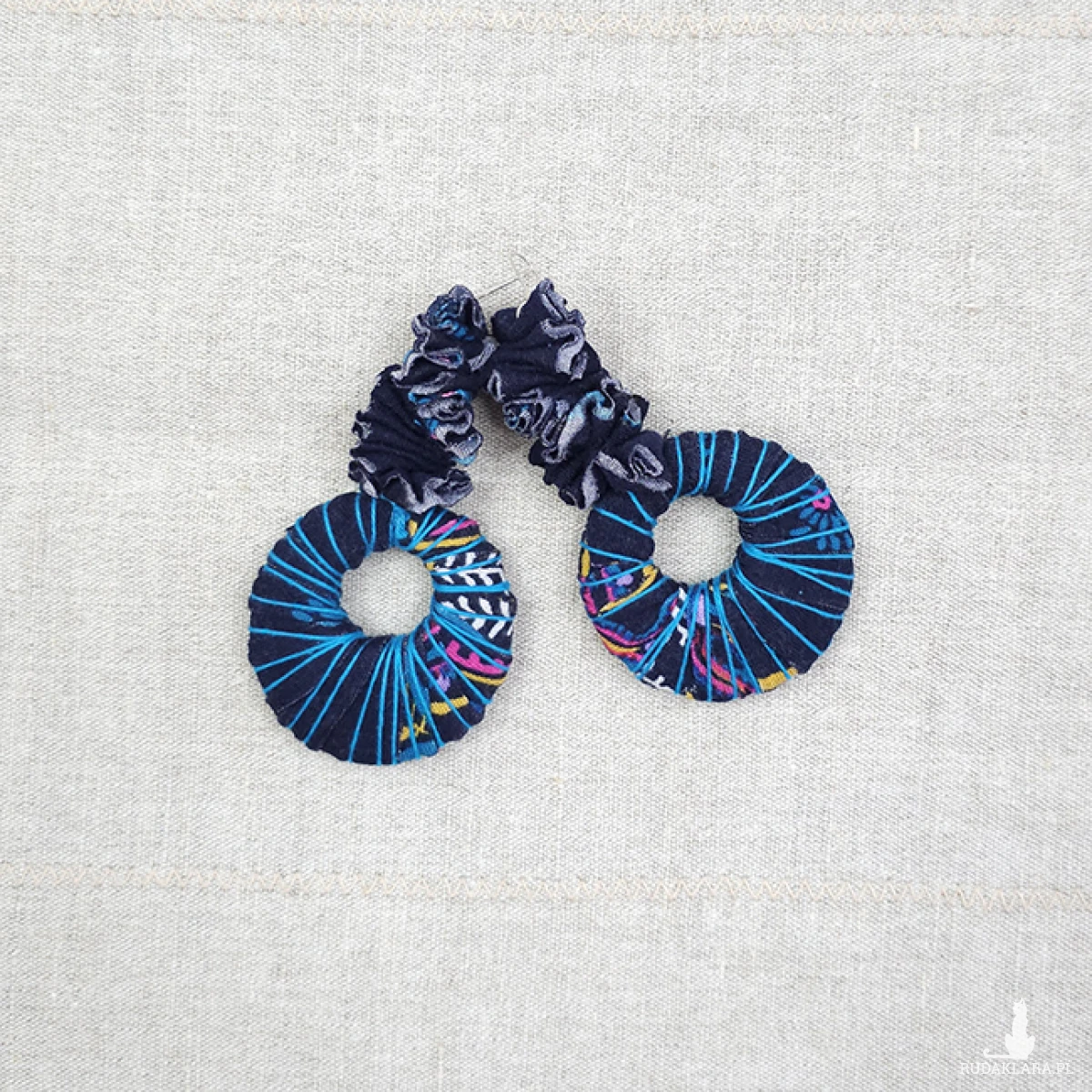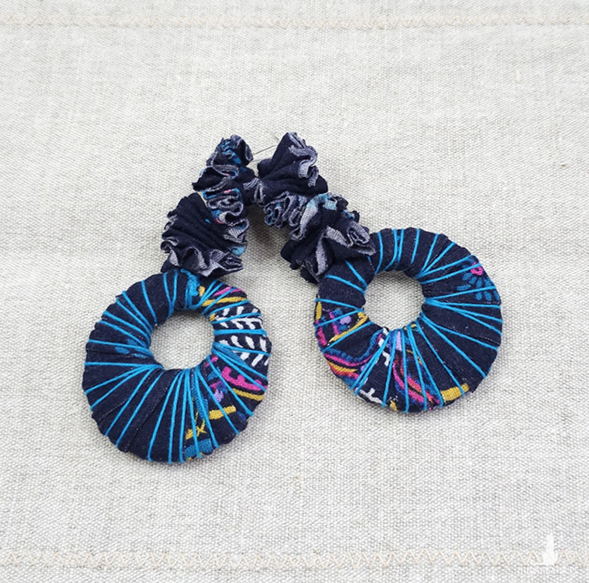 Kolczyki wykonane na drewnianej bazie z kolorowej bawełny