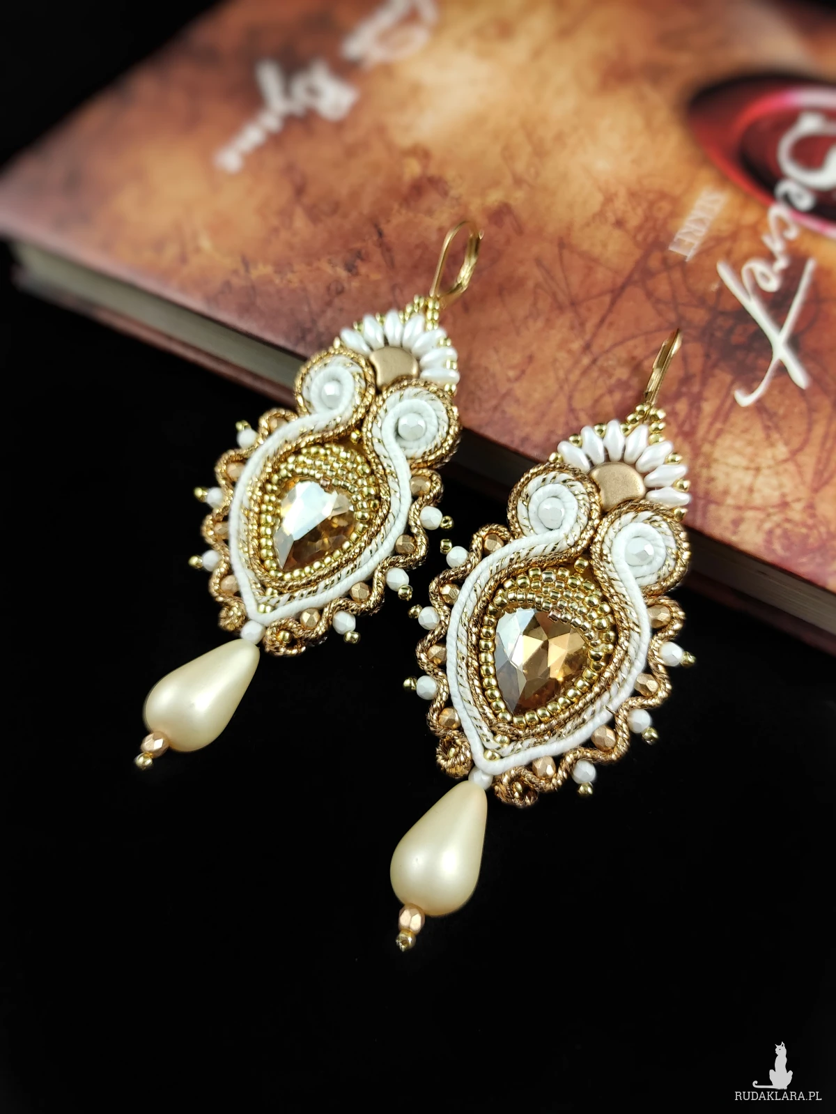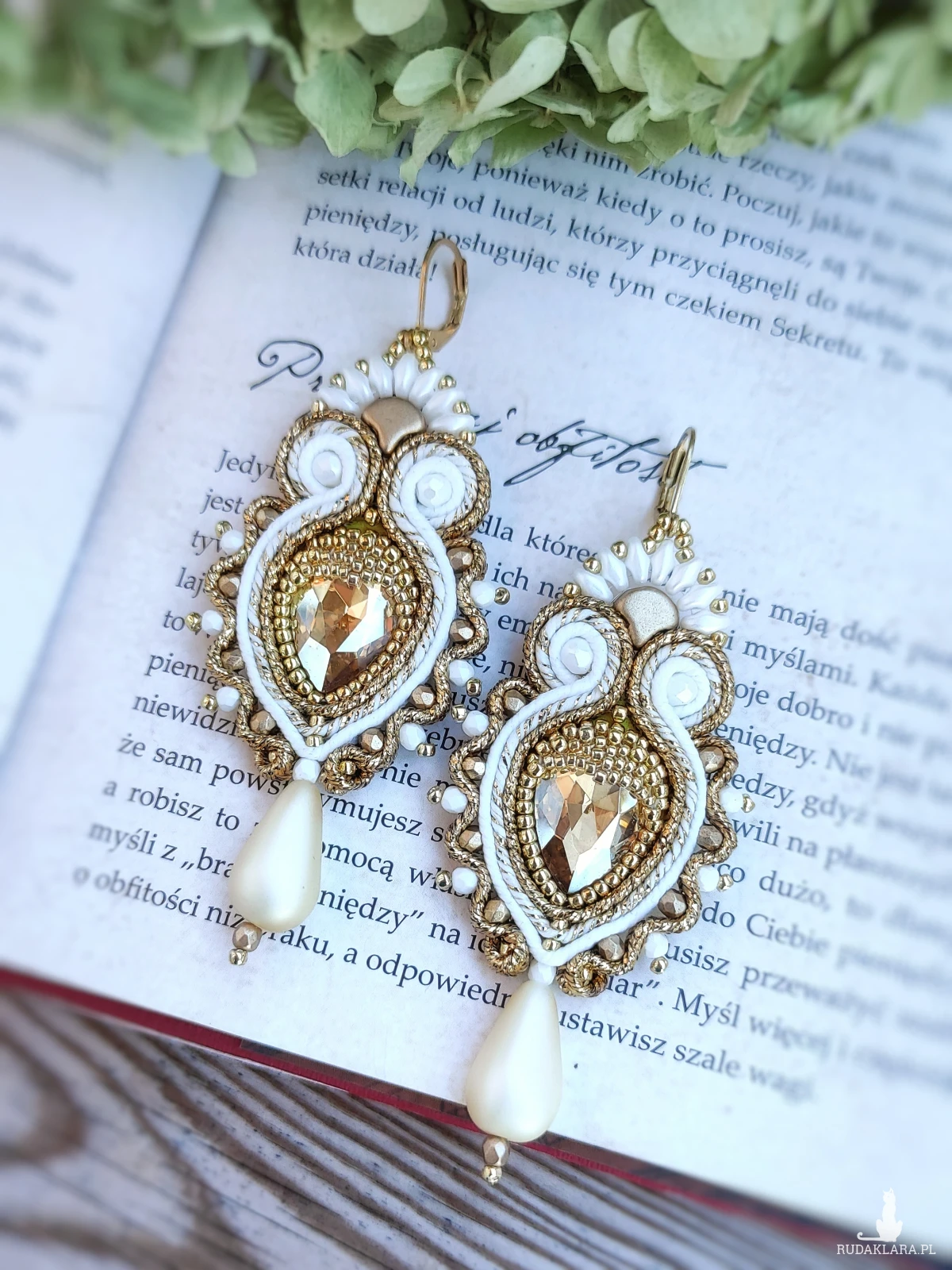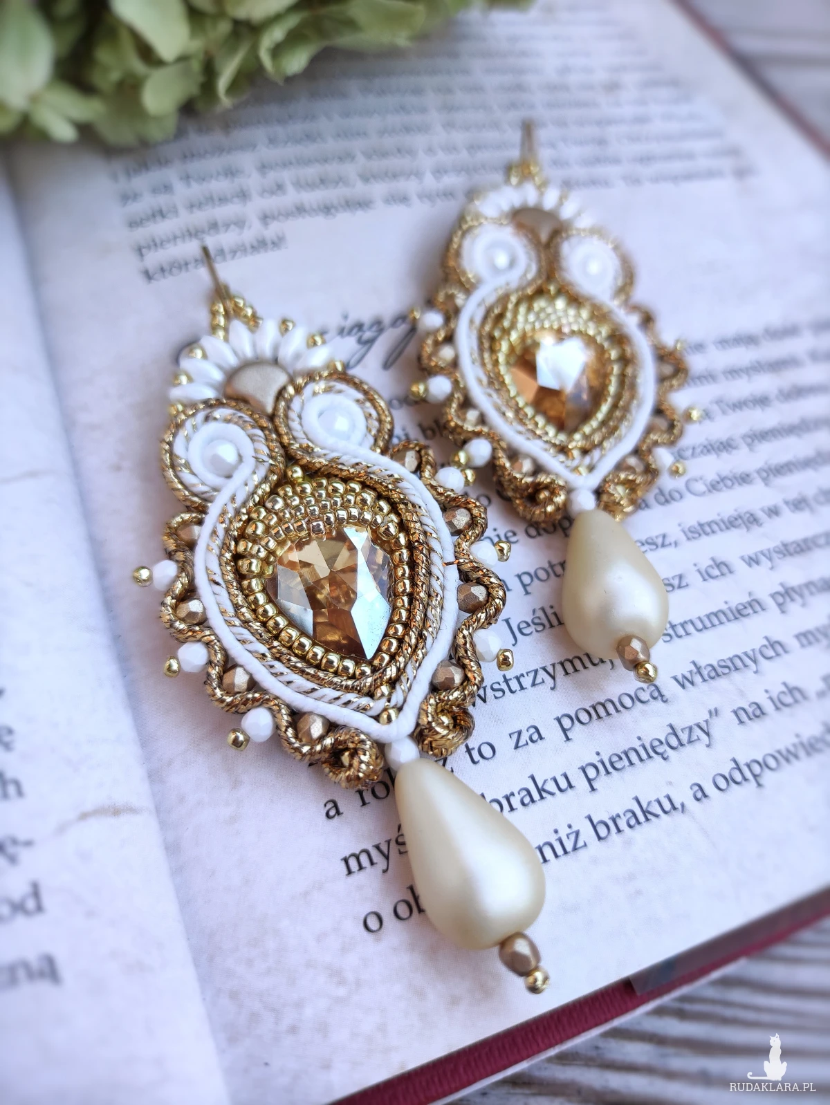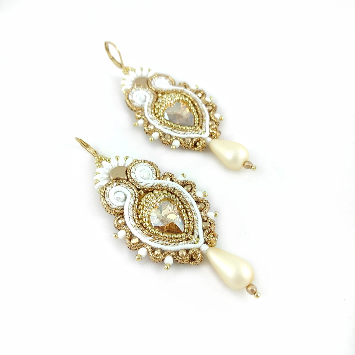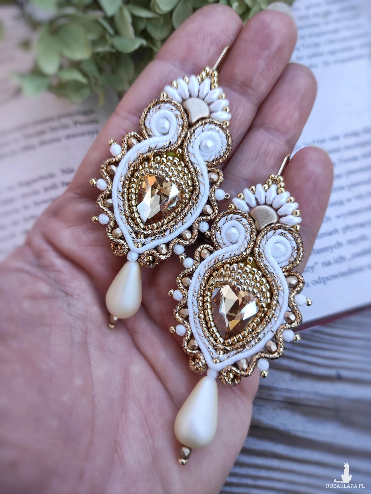 Kolczyki Ślubne Tajemniczy Ogród to wyjątkowy wybór na jeden z najważniejszych dni w życiu. Stworzone w technice sutasz, łączą subtelną biel, złote akcenty oraz delikatne perłowe detale. Kryształ w kształcie łezki otoczony złotymi koralikami przyciąga wzrok, nadając całości wyrafinowanego charakteru.