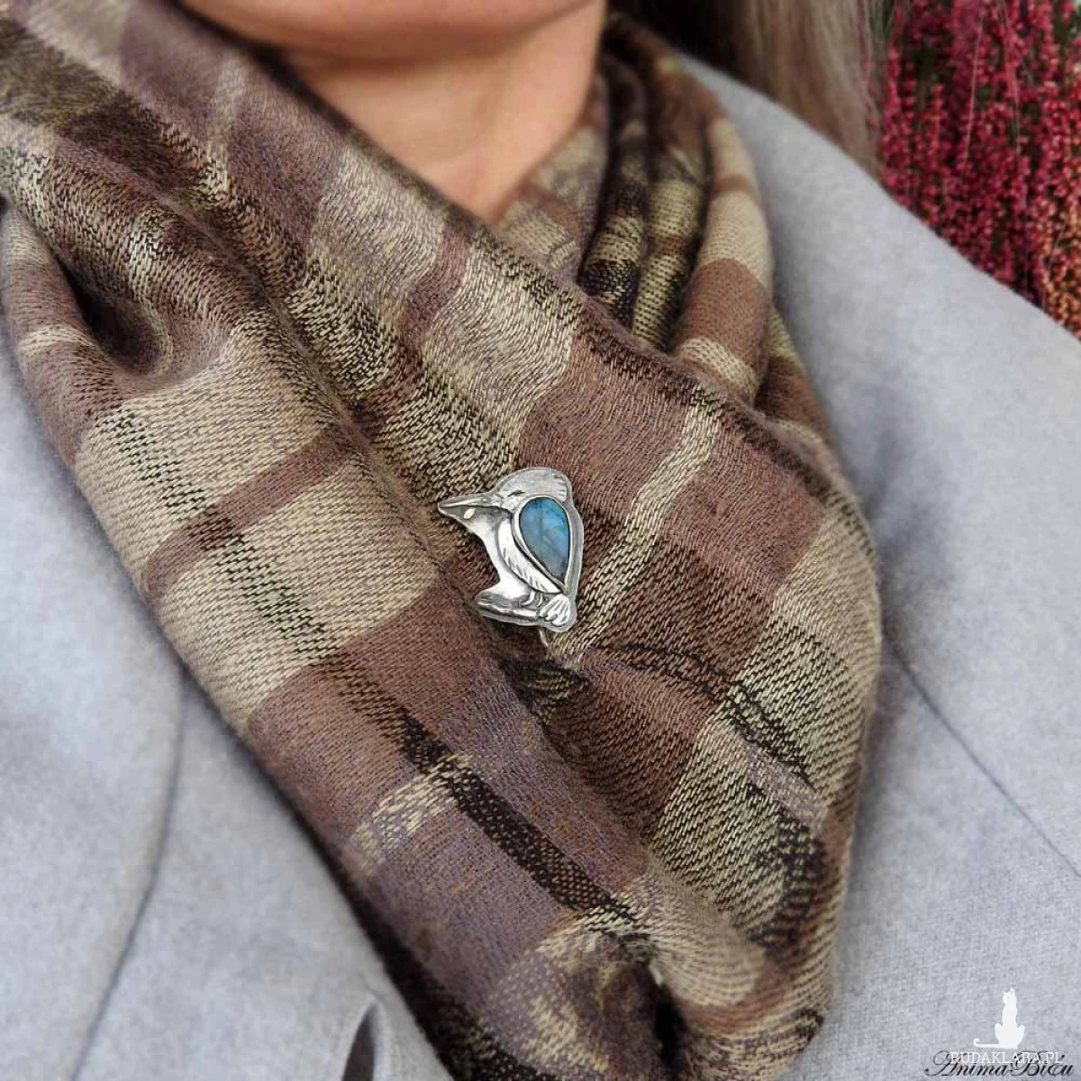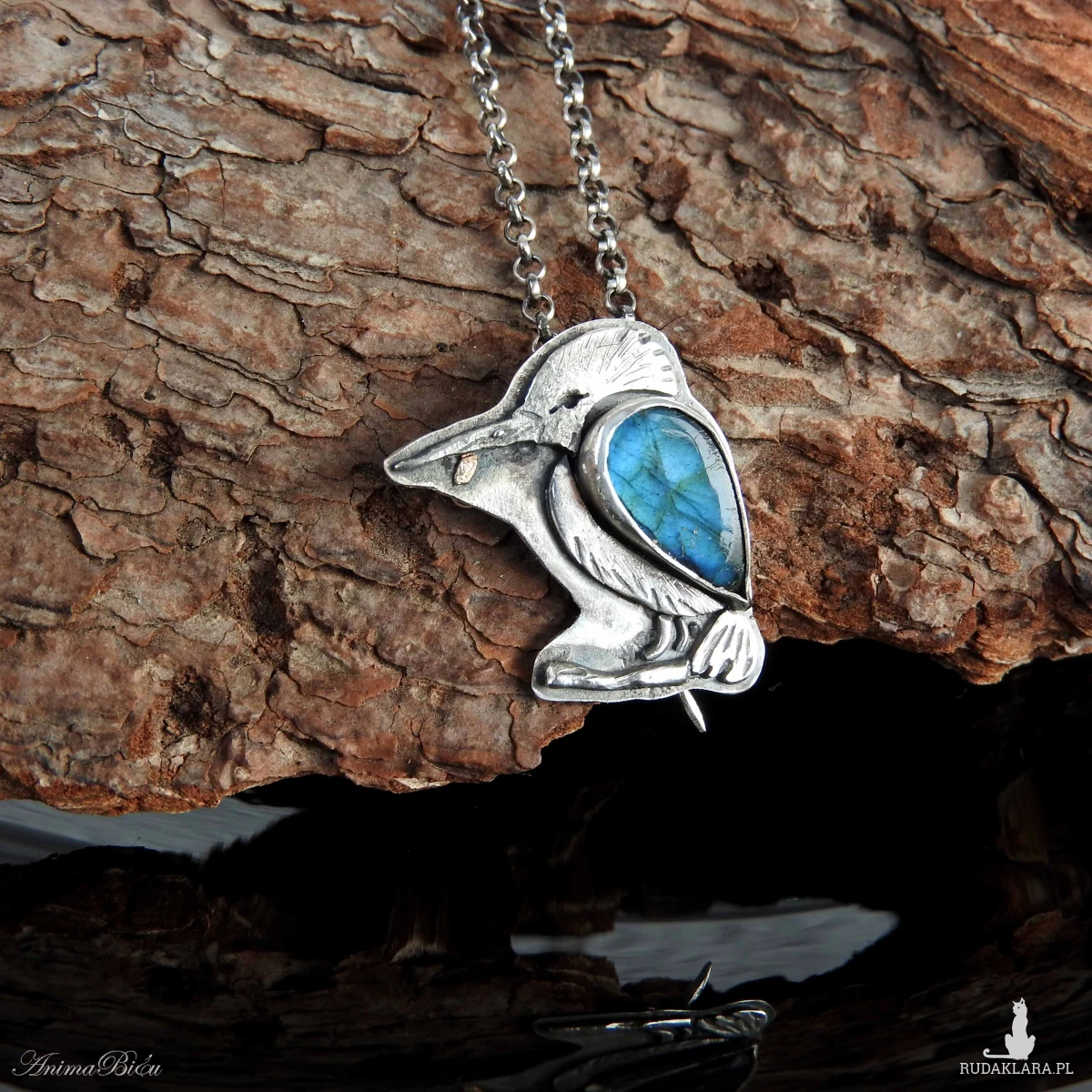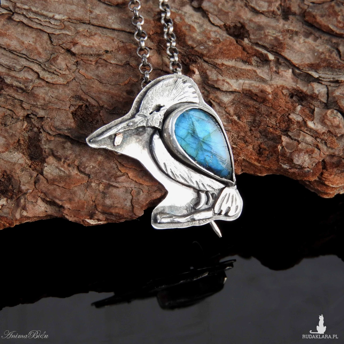 Wisiorek - broszka srebrna Zimorodek z labradorytem.