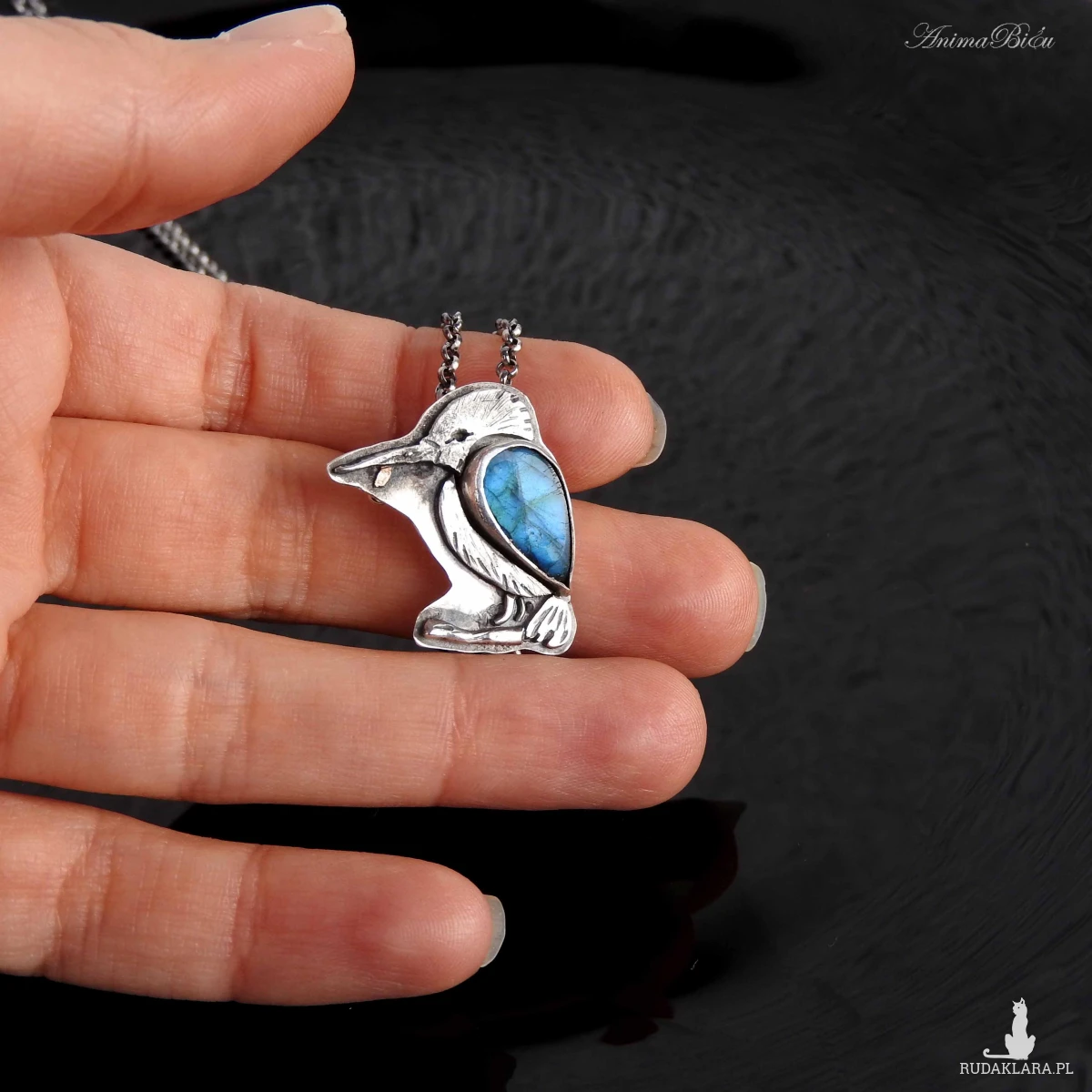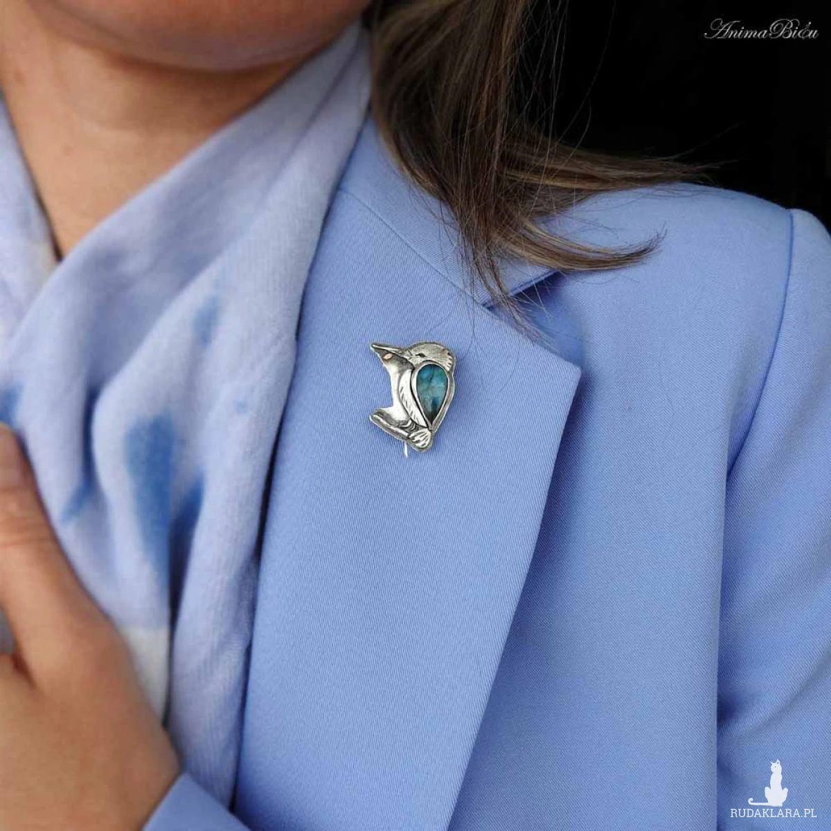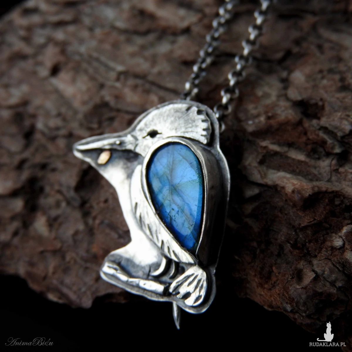 Wisiorek - broszka srebrna Zimorodek z labradorytem.