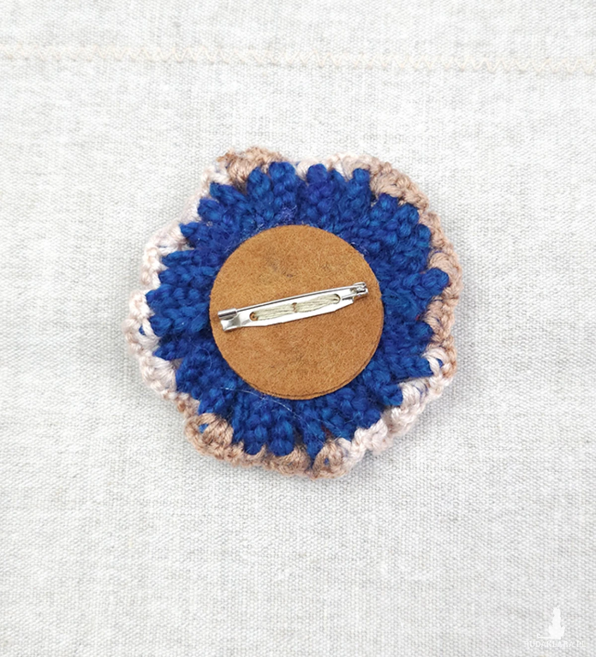 Broszka wykonana ręcznie z akrylowych włóczek i akrylowego koralika.
