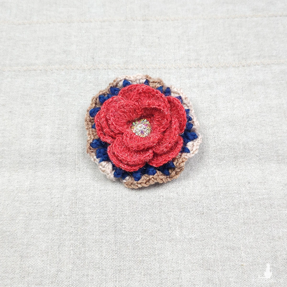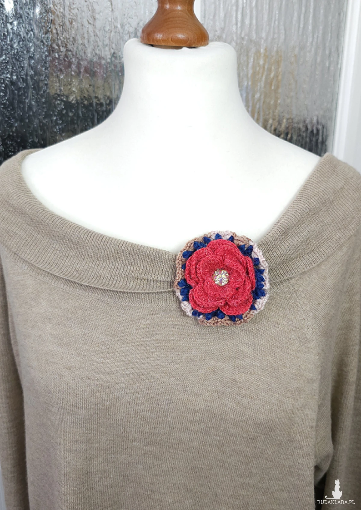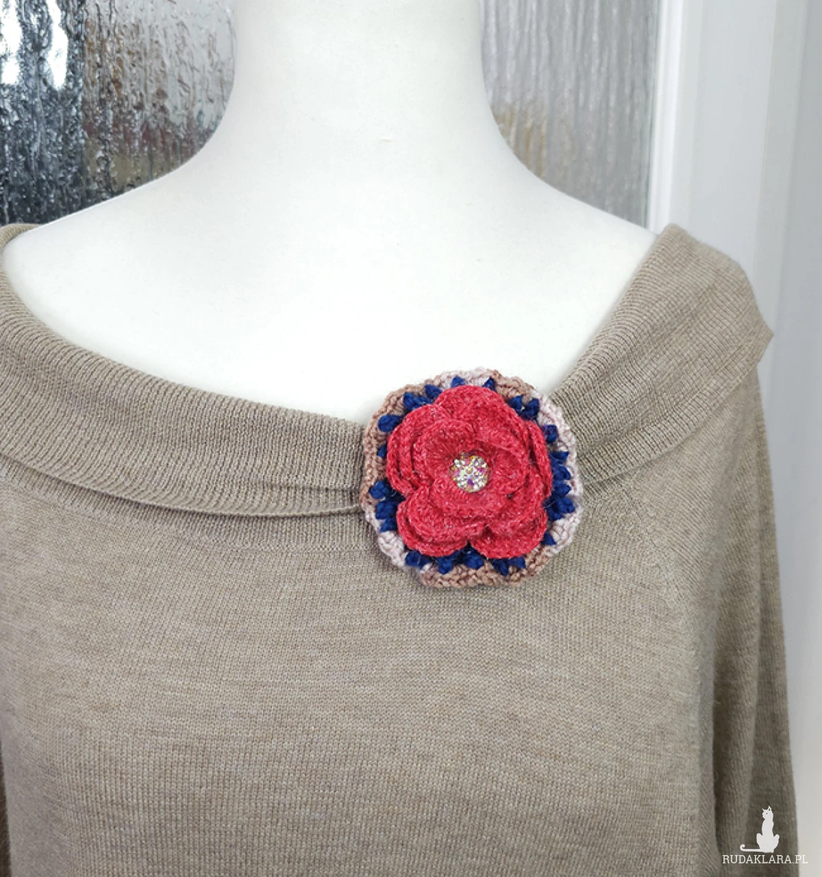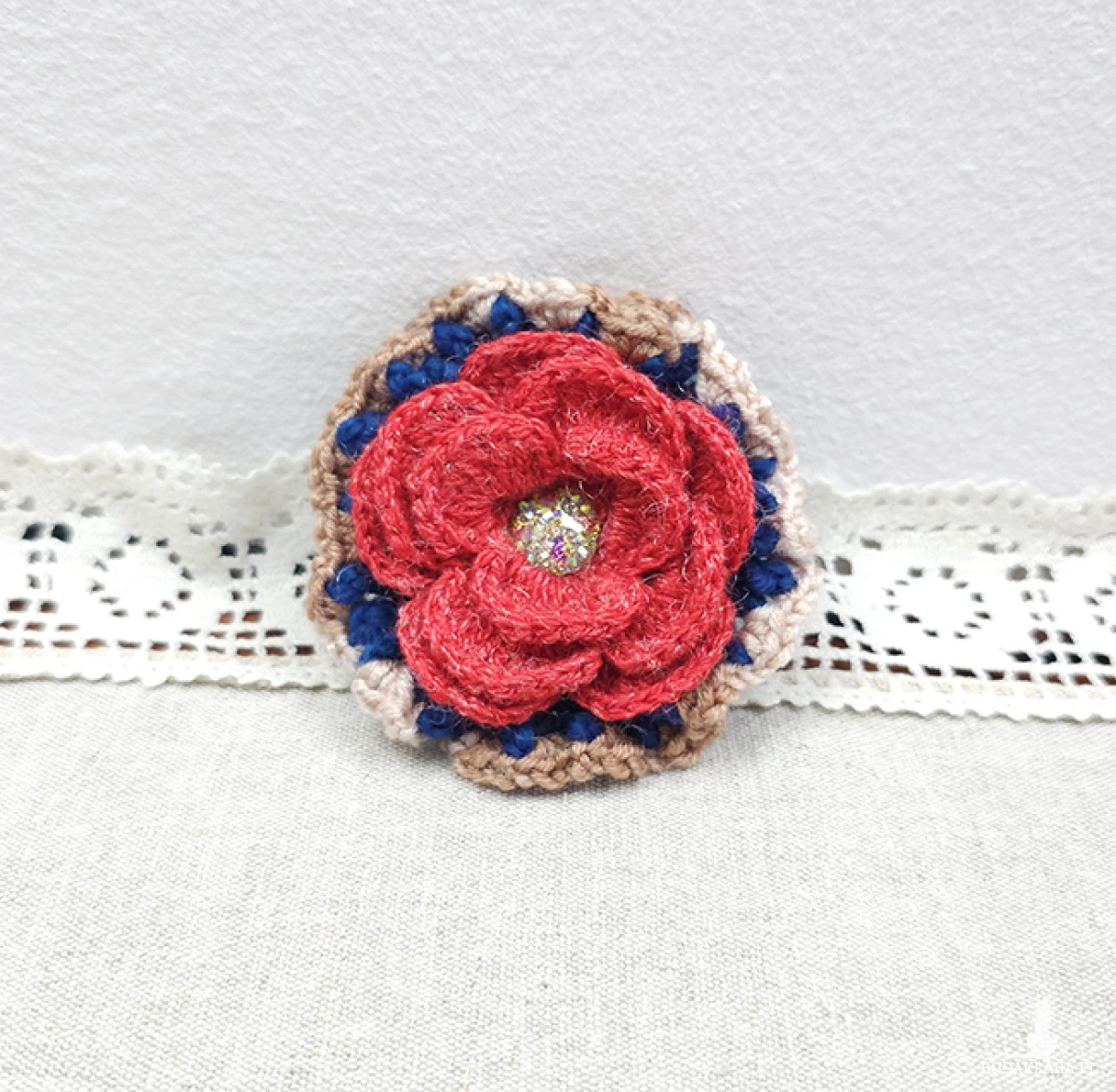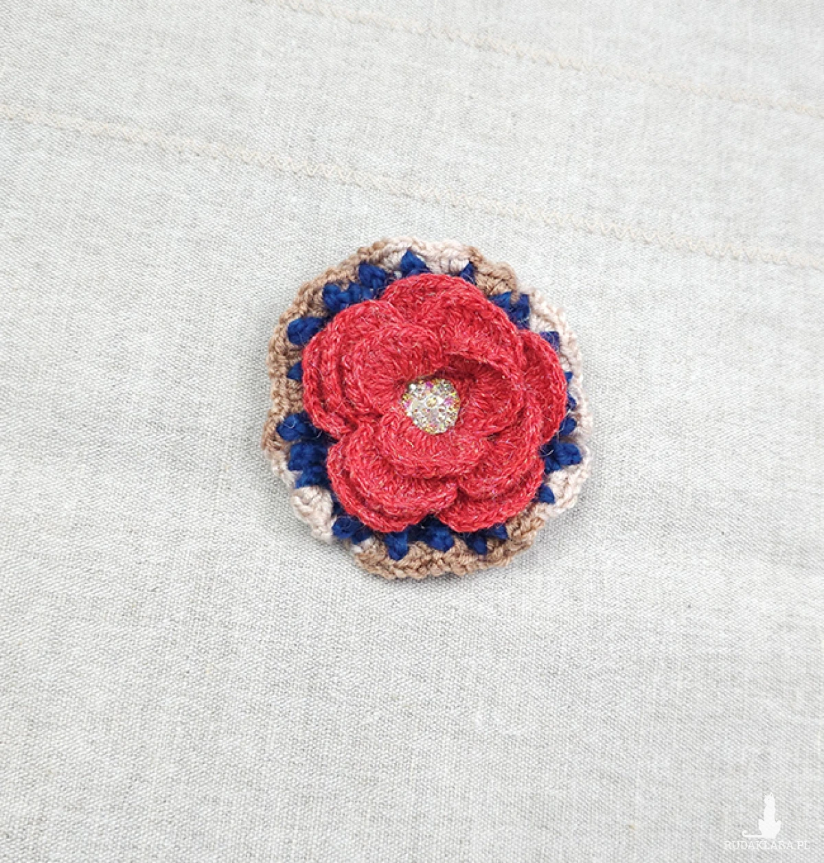 6535 szydełkowa broszka, kolorowa, przestrzenna; kwiat; czerwona, granatowa, beżowa