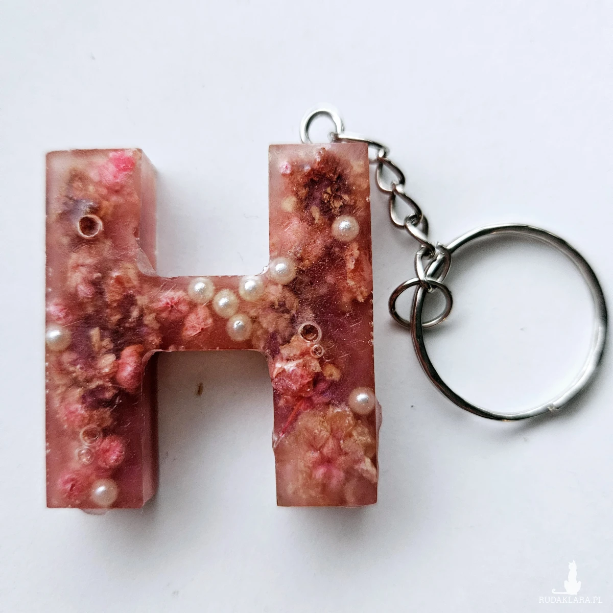 Brelok literka H ŕóżowa z gipsówką i perłami