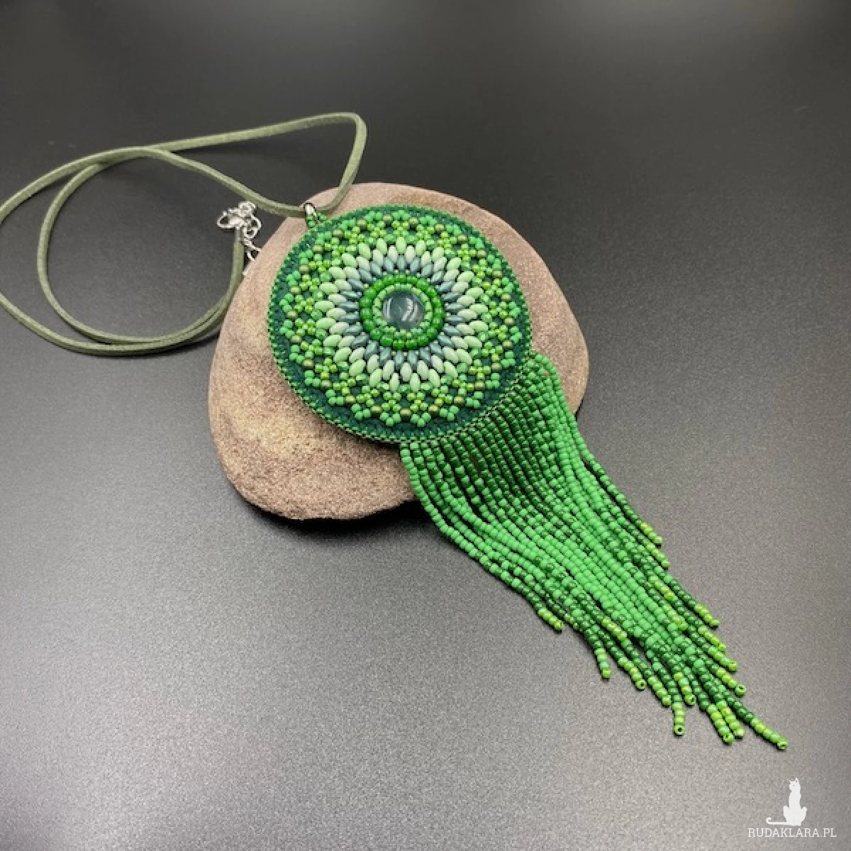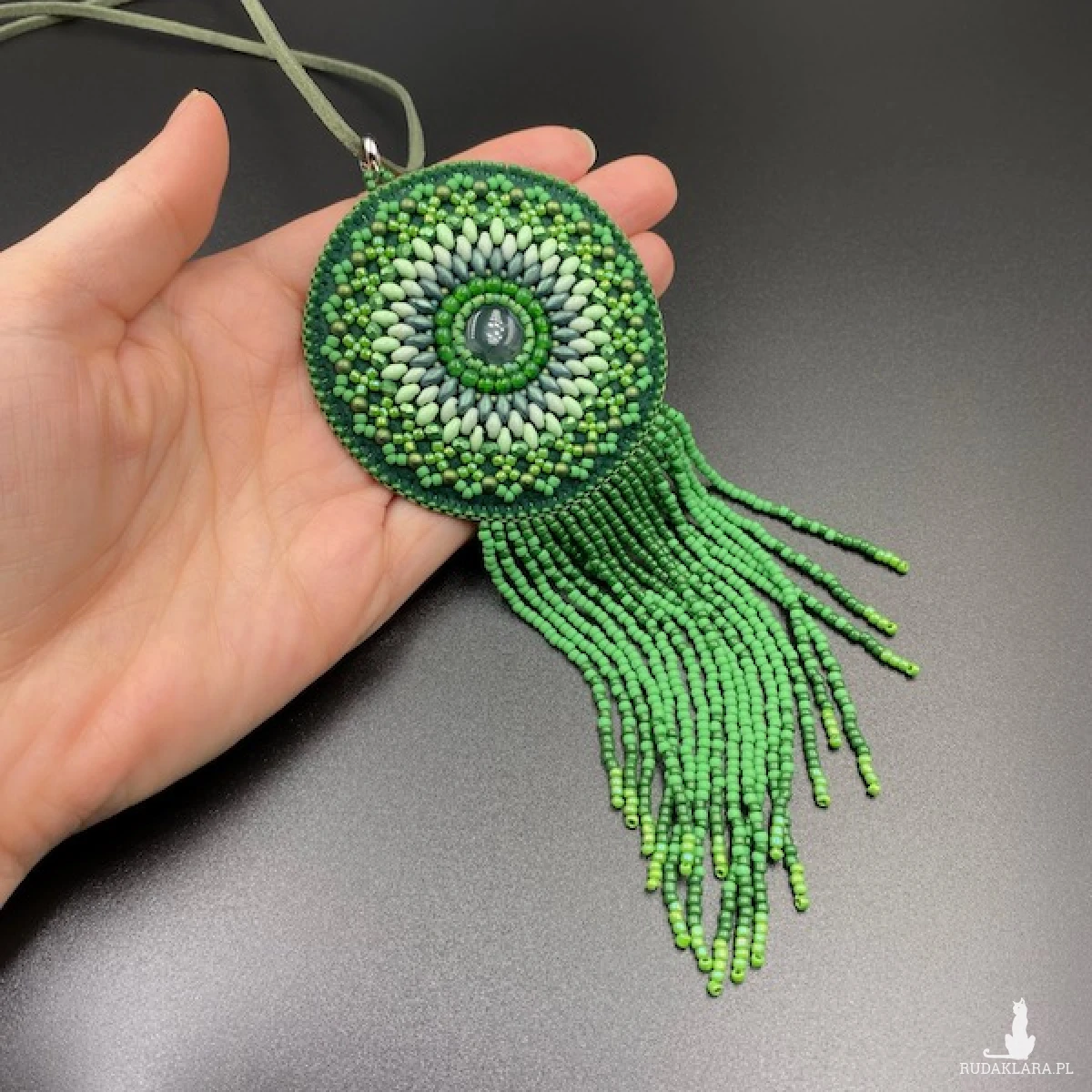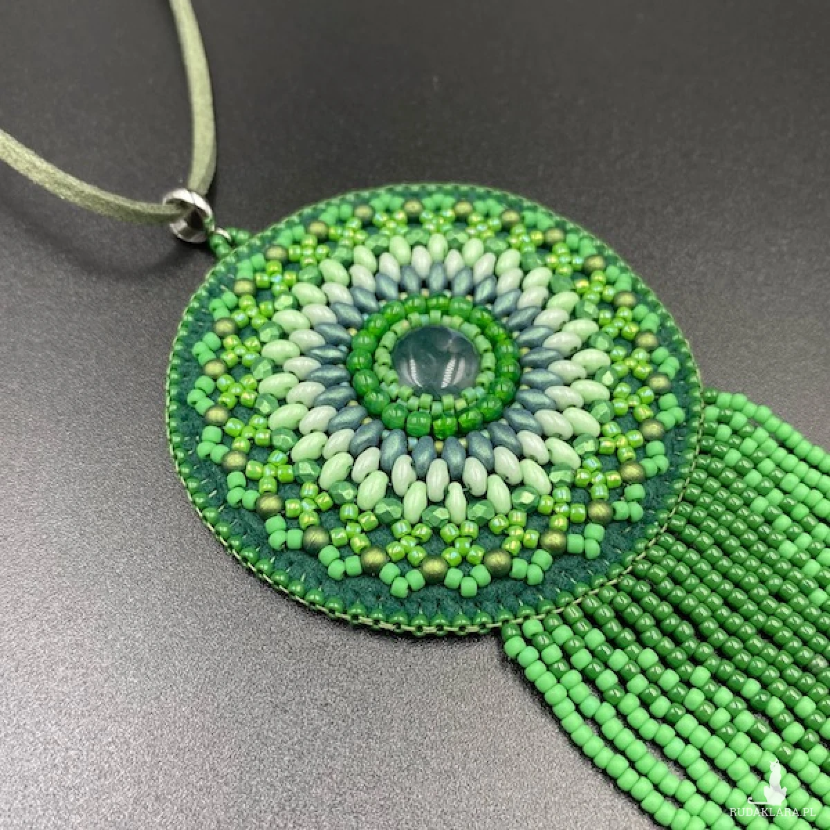 Kolory medalionu: odcienie zieleni. Jego centrum to agat mszysty 12 mm, który opleciony został koralikami Toho, Fire Polish, SuperDuo i wykończony ozdobnymi frędzelkami z efektem cieniowania. Zawieszony został na rzemieniu zamszowym w kolorze oliwkowym. Tył podszyty miętową eko skórką. Elementy metalowe ze stali chirurgicznej w kolorze srebrnym.