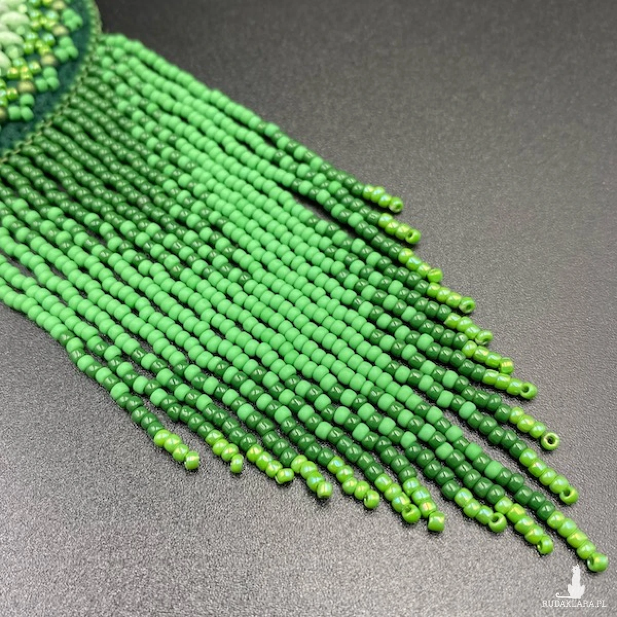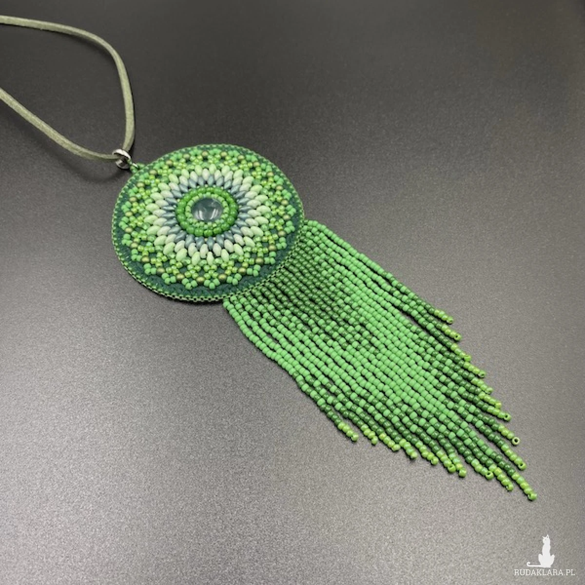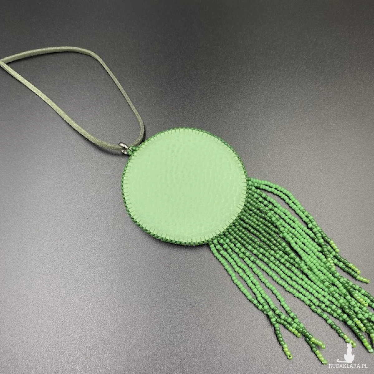 Kolory medalionu: odcienie zieleni. Jego centrum to agat mszysty 12 mm, który opleciony został koralikami Toho, Fire Polish, SuperDuo i wykończony ozdobnymi frędzelkami z efektem cieniowania. Zawieszony został na rzemieniu zamszowym w kolorze oliwkowym. Tył podszyty miętową eko skórką. Elementy metalowe ze stali chirurgicznej w kolorze srebrnym.
