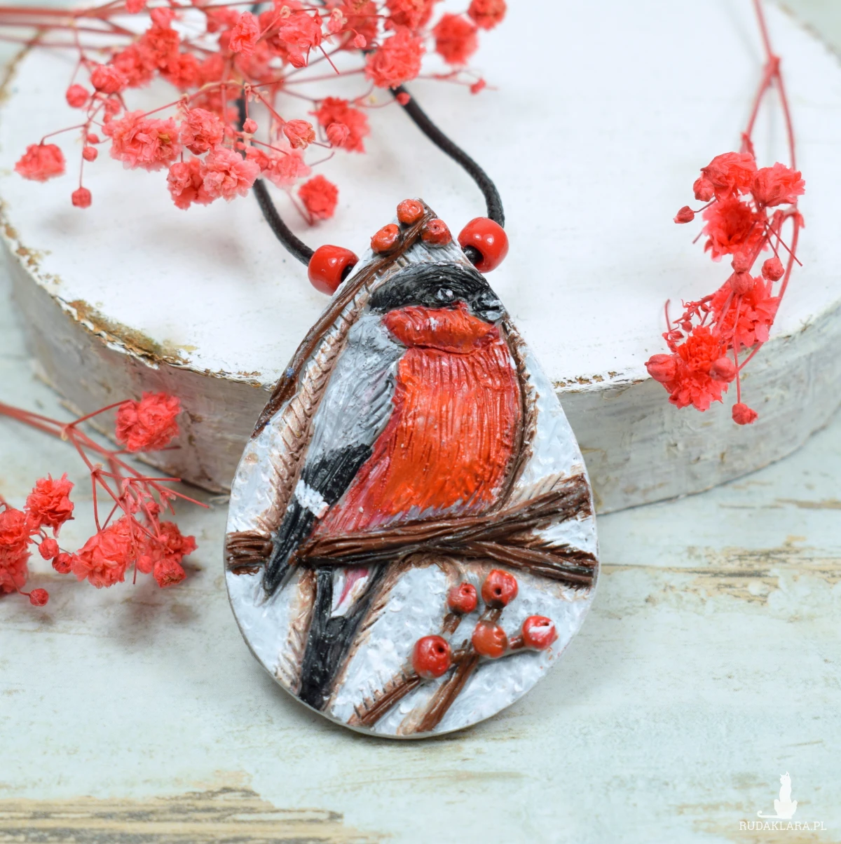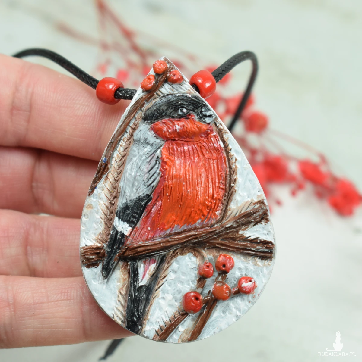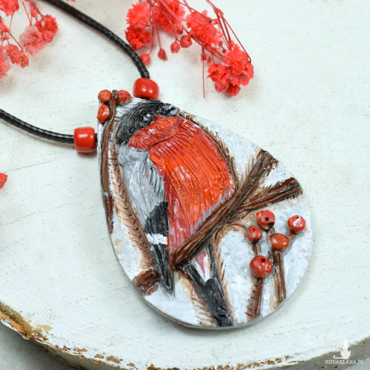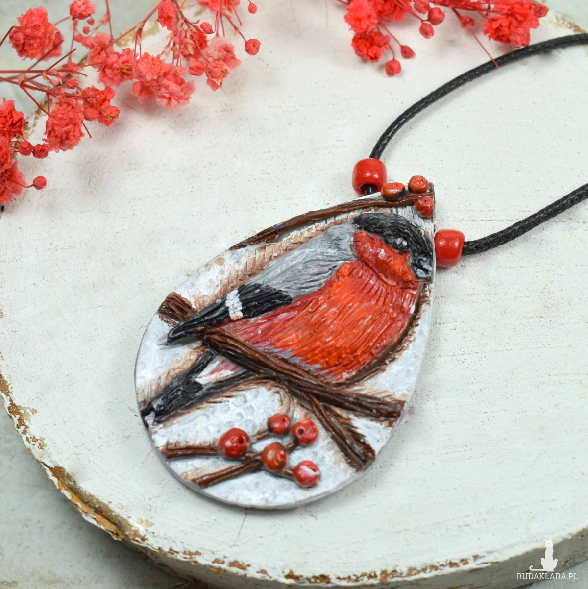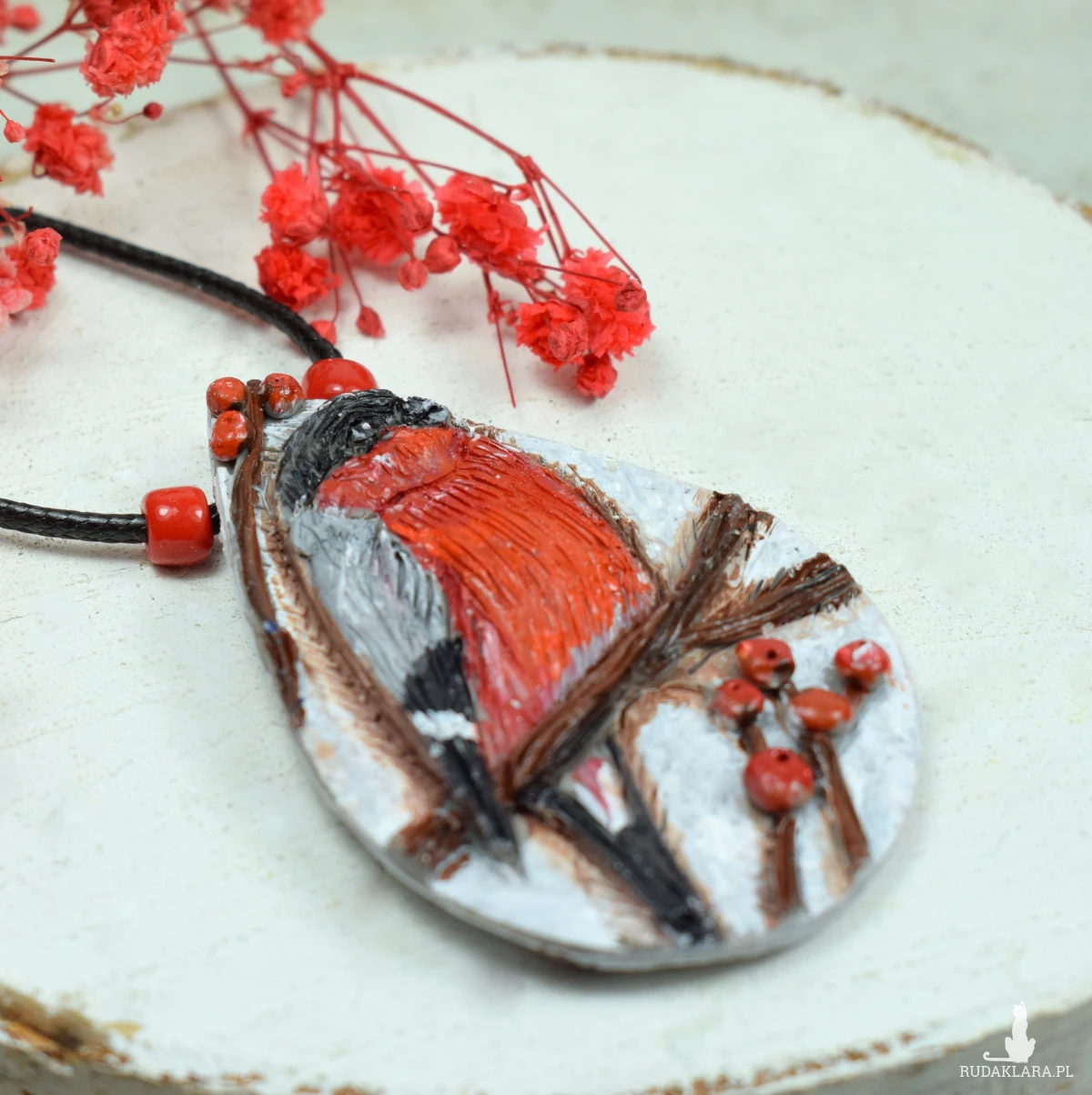 Unikatowy, ręcznie wykonany naszyjnik z gilem zwyczajnym i motywem roślinnym.