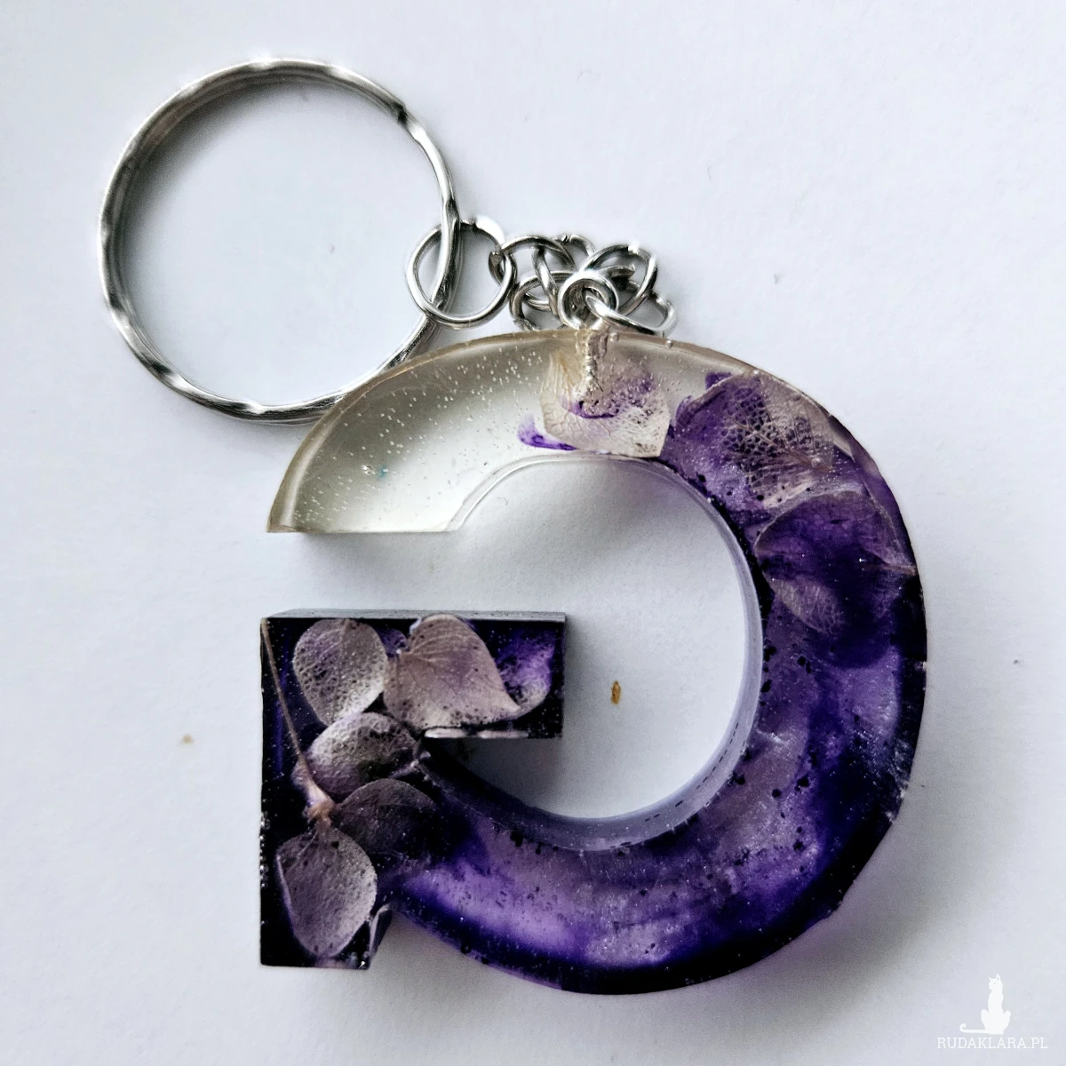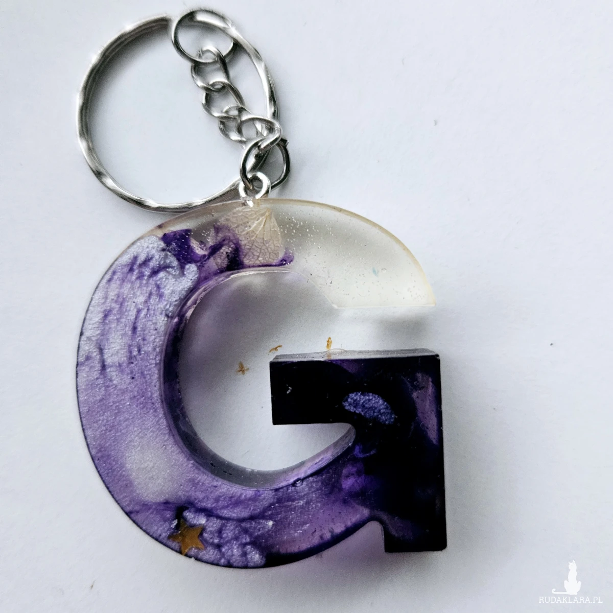 Brelok literka G galaxy fioletowa z bielą i hortensją