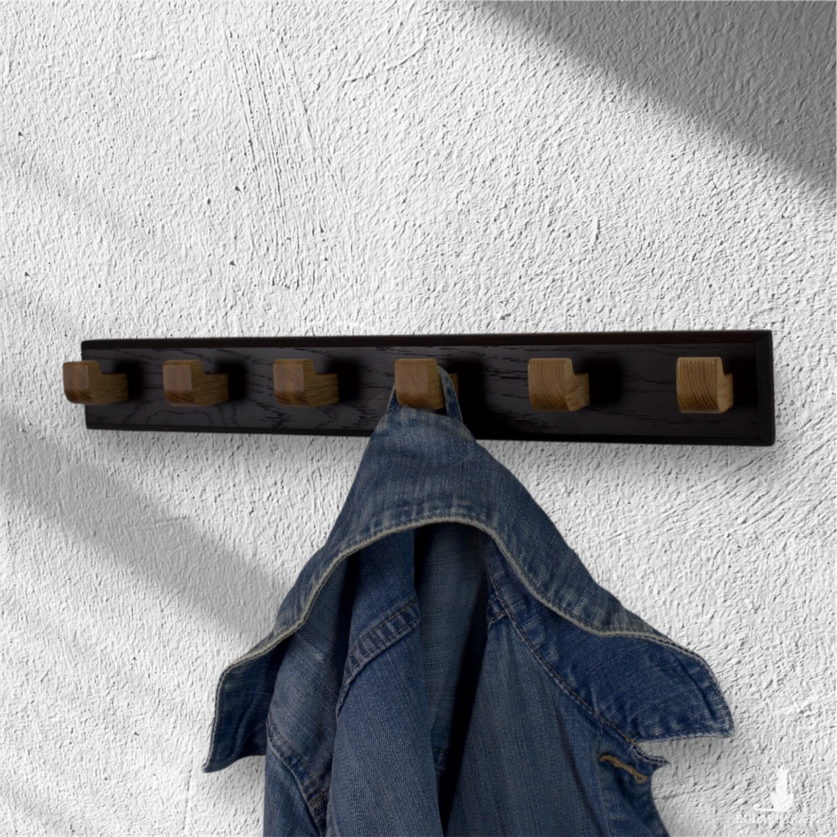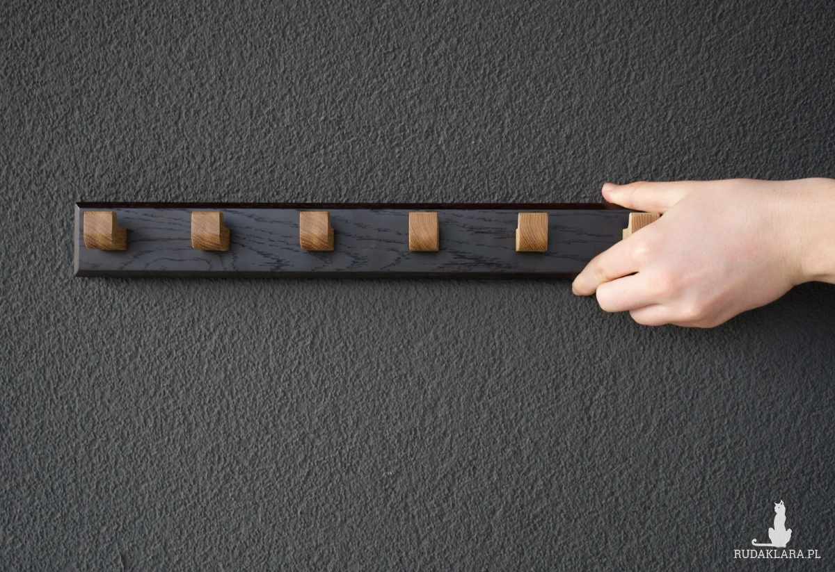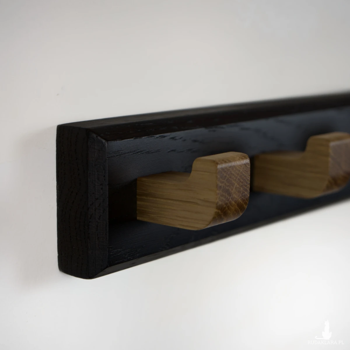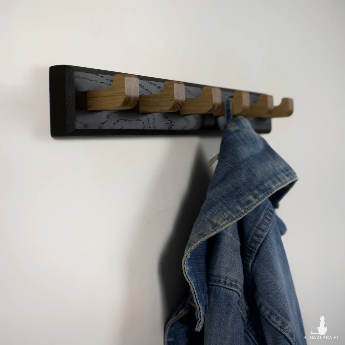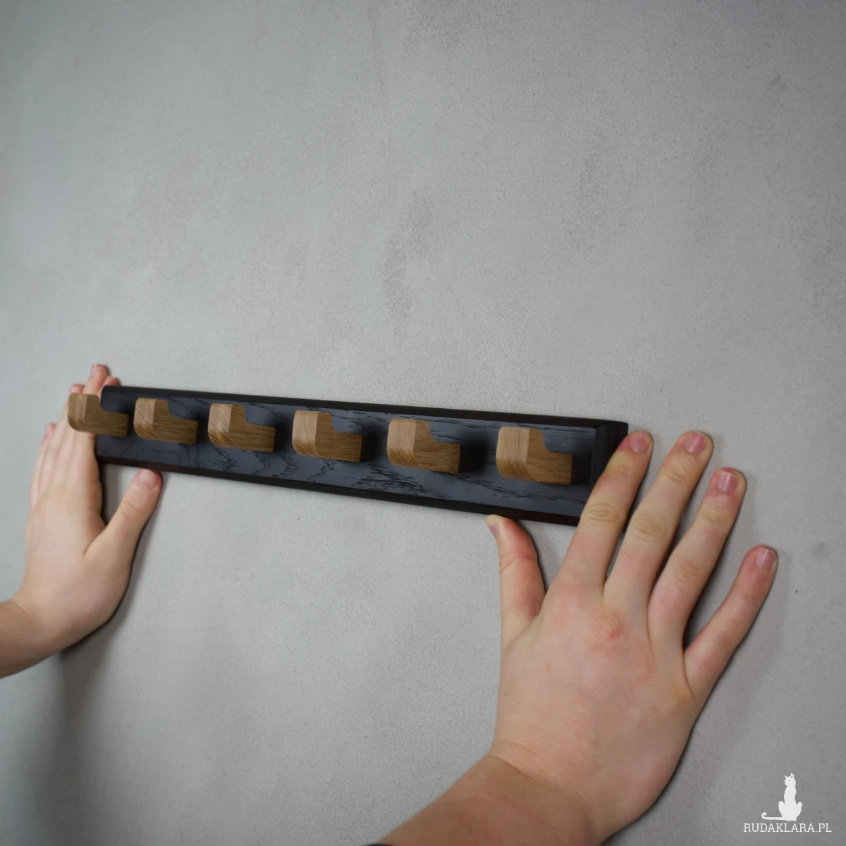 Odkryj doskonałe połączenie elegancji, funkcjonalności i trwałości dzięki naszemu drewnianemu wieszakowi ściennemu. Wykonany z najwyższej jakości materiałów, ten minimalistyczny wieszak posiada sześć solidnych haczyków dębowych osadzonych na podstawie z wyjątkowego czarnego dębu. To doskonałe rozwiązanie do przechowywania odzieży, akcesoriów czy kluczy w każdym wnętrzu.