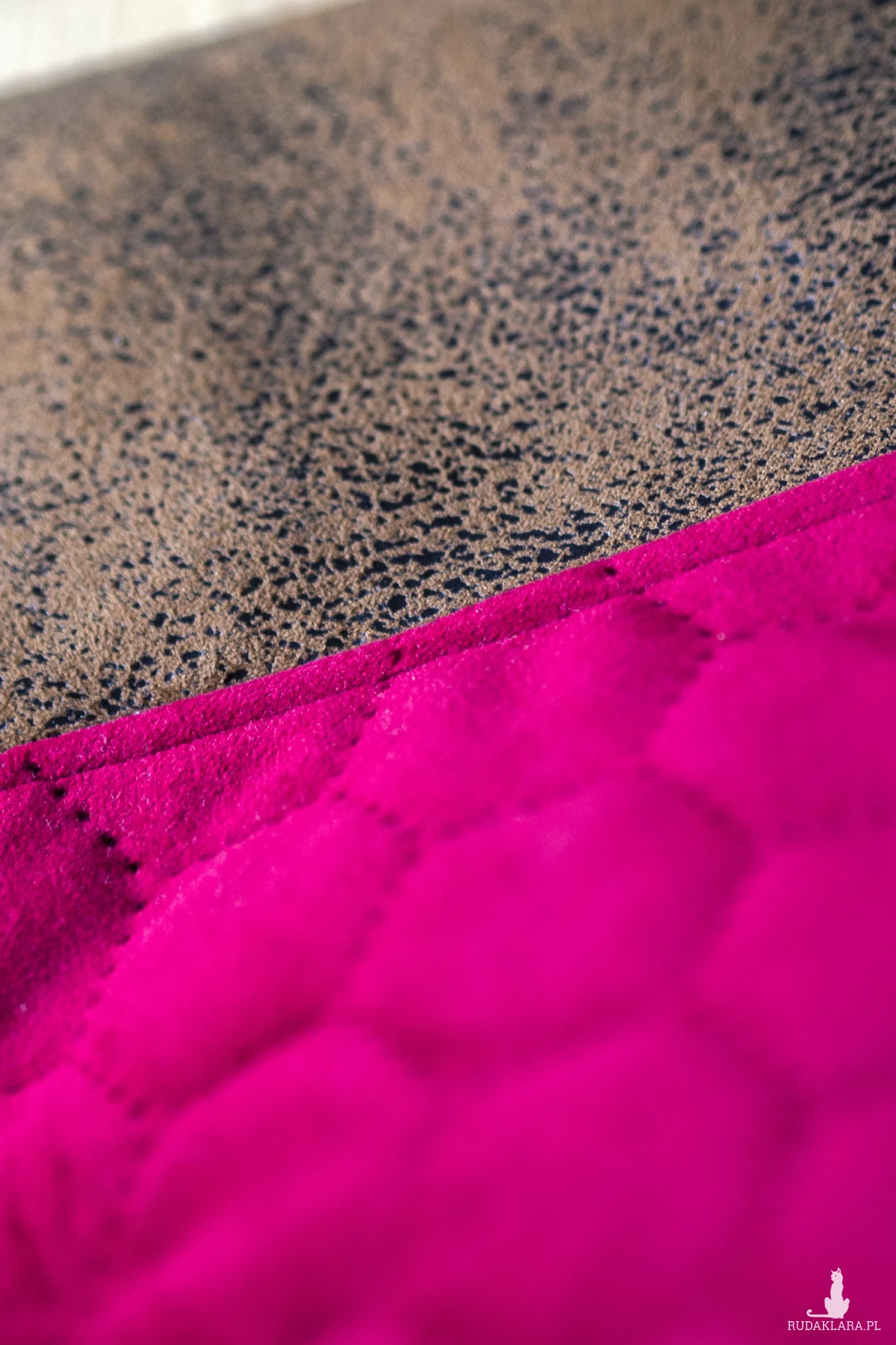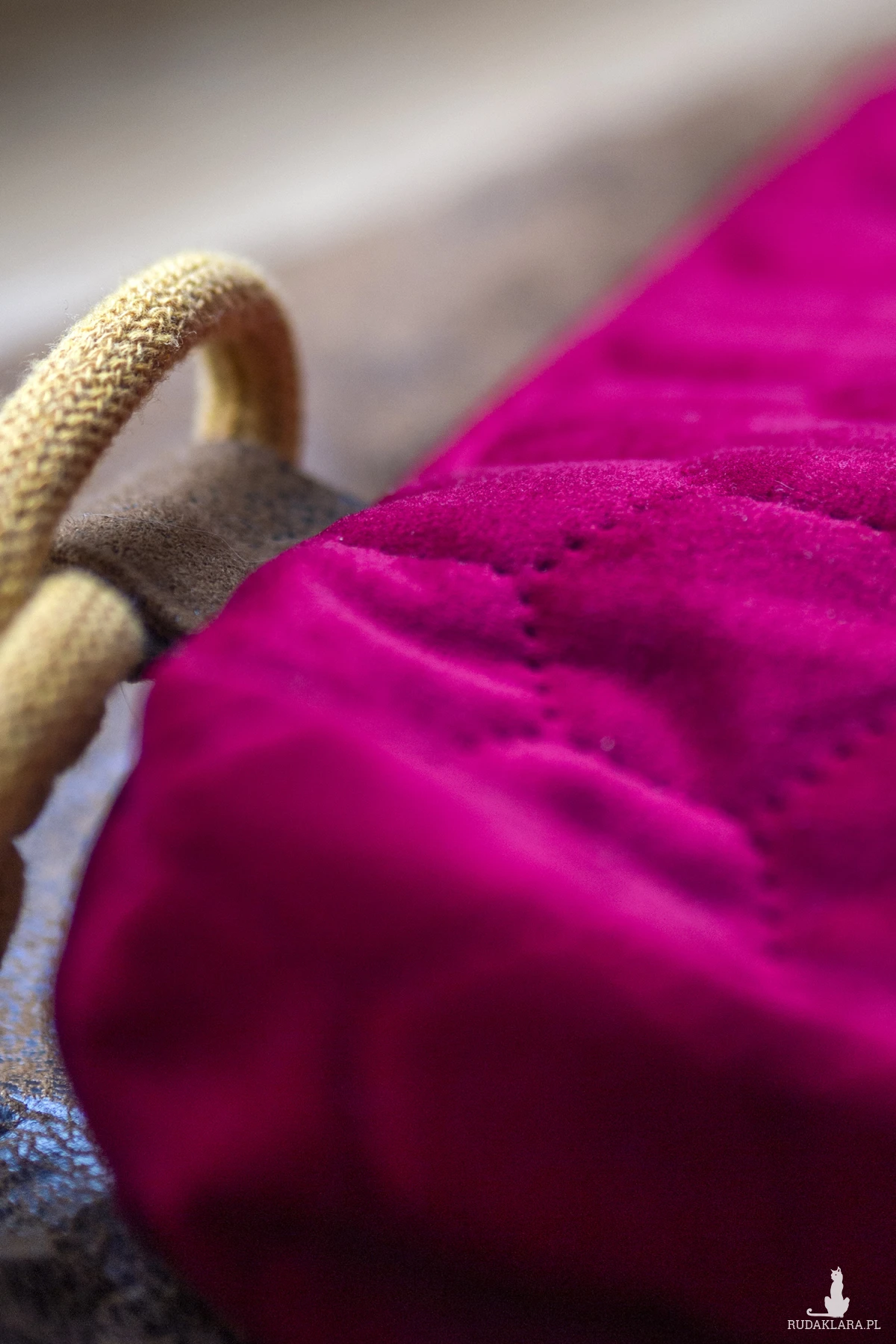 Plecak worek wykonany z brązowego nubuku imitującego postarzaną skórę w kolorze brązowym oraz pikowanego czerwonego weluru. Jego kształt sprawia, iż idealnie nadaje się na pokrowiec na matę do jogi.